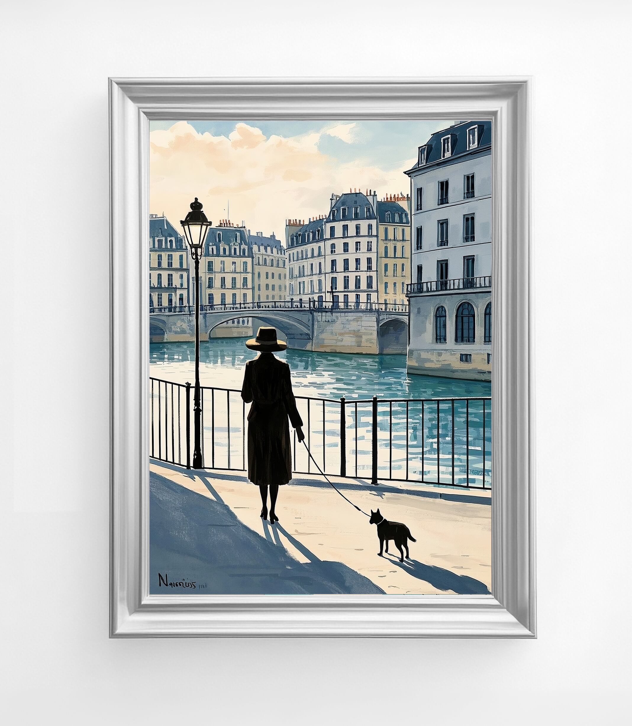 この作品は、ヨーロッパの都市風景、特にパリを思わせるセーヌ川沿いの情景を描いた美しいアートです。水辺の柔らかな光の反射と、クラシックな建物群の整然とした佇まいが、洗練された雰囲気を漂わせています。
