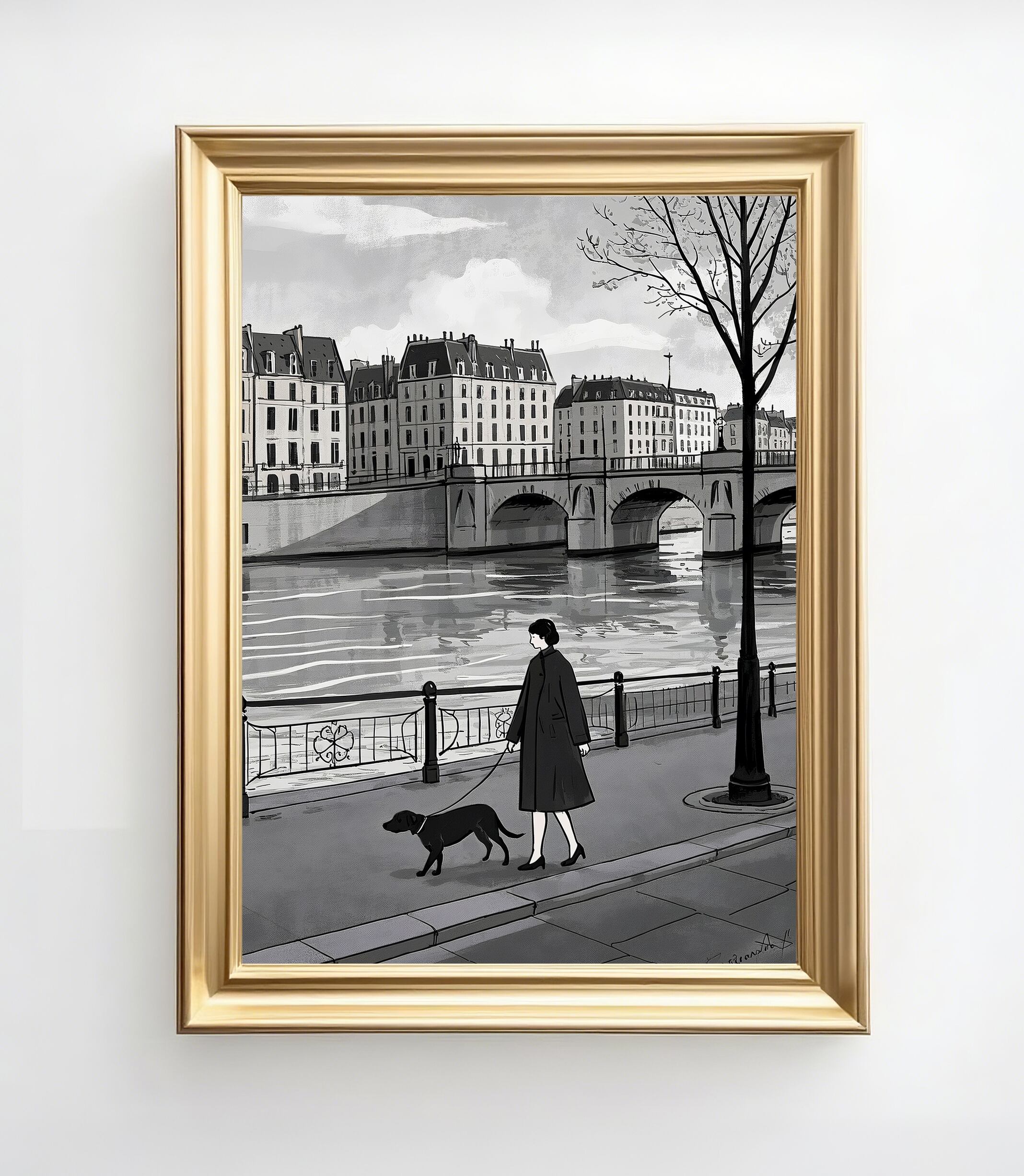 このアートは、モノクロームを基調とした静謐な都市風景画として、とても洗練された印象を与えます。セーヌ川沿いを歩く女性と犬の姿は、日常の一瞬を詩的に切り取っており、観る者に物語を想像させます。建物や橋の描写はシンプルながらも均整が取れており、奥行き感やヨーロッパ都市の空気感が巧みに表現されています。モノトーンの世界の中で、女性の落ち着いた佇まいや犬の存在が温かみを加えている点も魅力です。全体として、時間が静かに流れる「都市の詩情」を描いた上質な作品といえます。