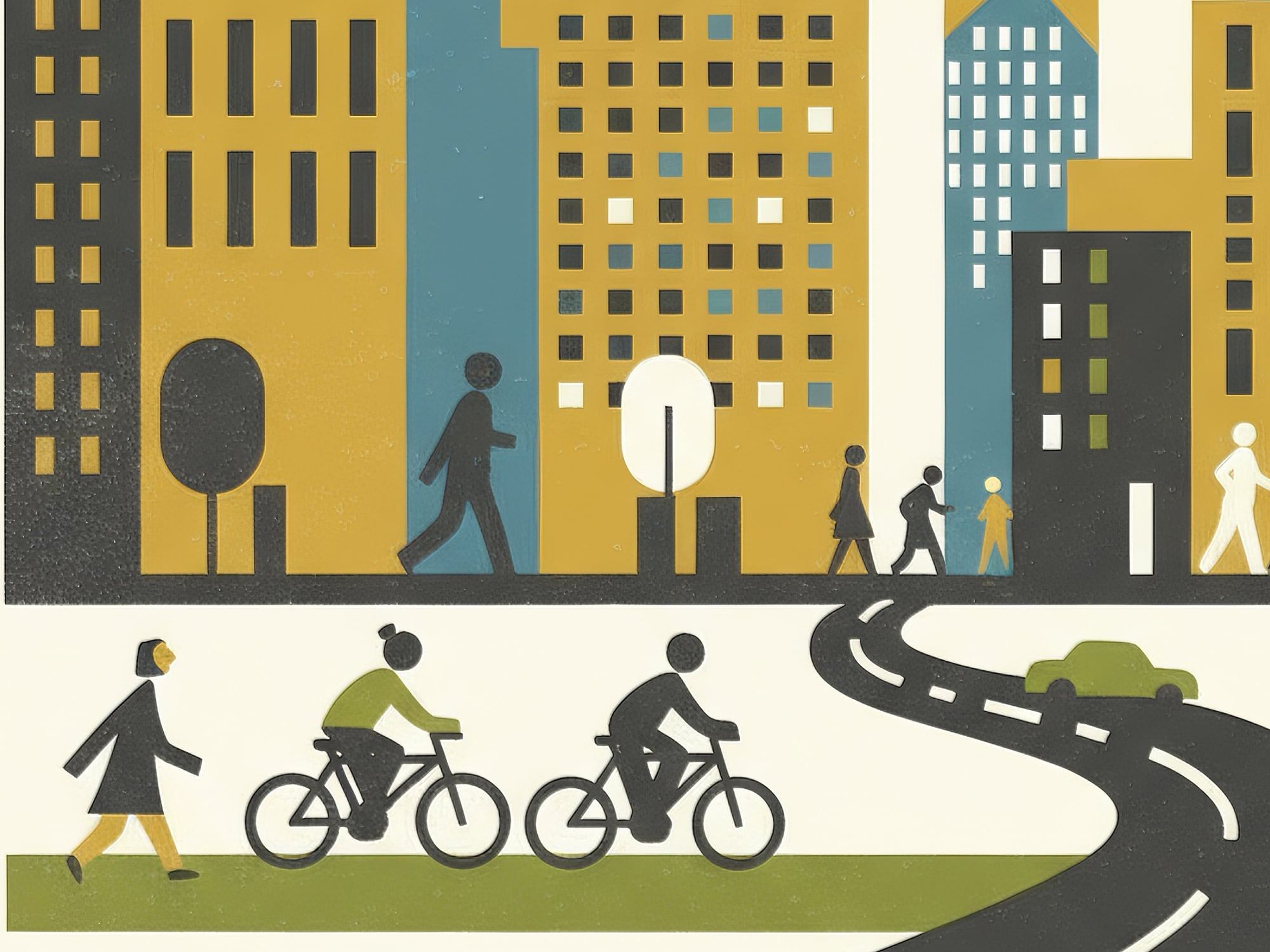 この作品は、明るい太陽と開放感のある都市の風景を描いた、前向きな印象のアートです。上向きの道路や歩行者・自転車の配置が、都市の活気とポジティブなエネルギーを感じさせます。色使いは少し控えめで、洗練された印象を与えつつ、モダンでありながらノスタルジックな雰囲気もあります。構図がとても安定しており、ポスターやアートプリントとしても完成度が高いです。