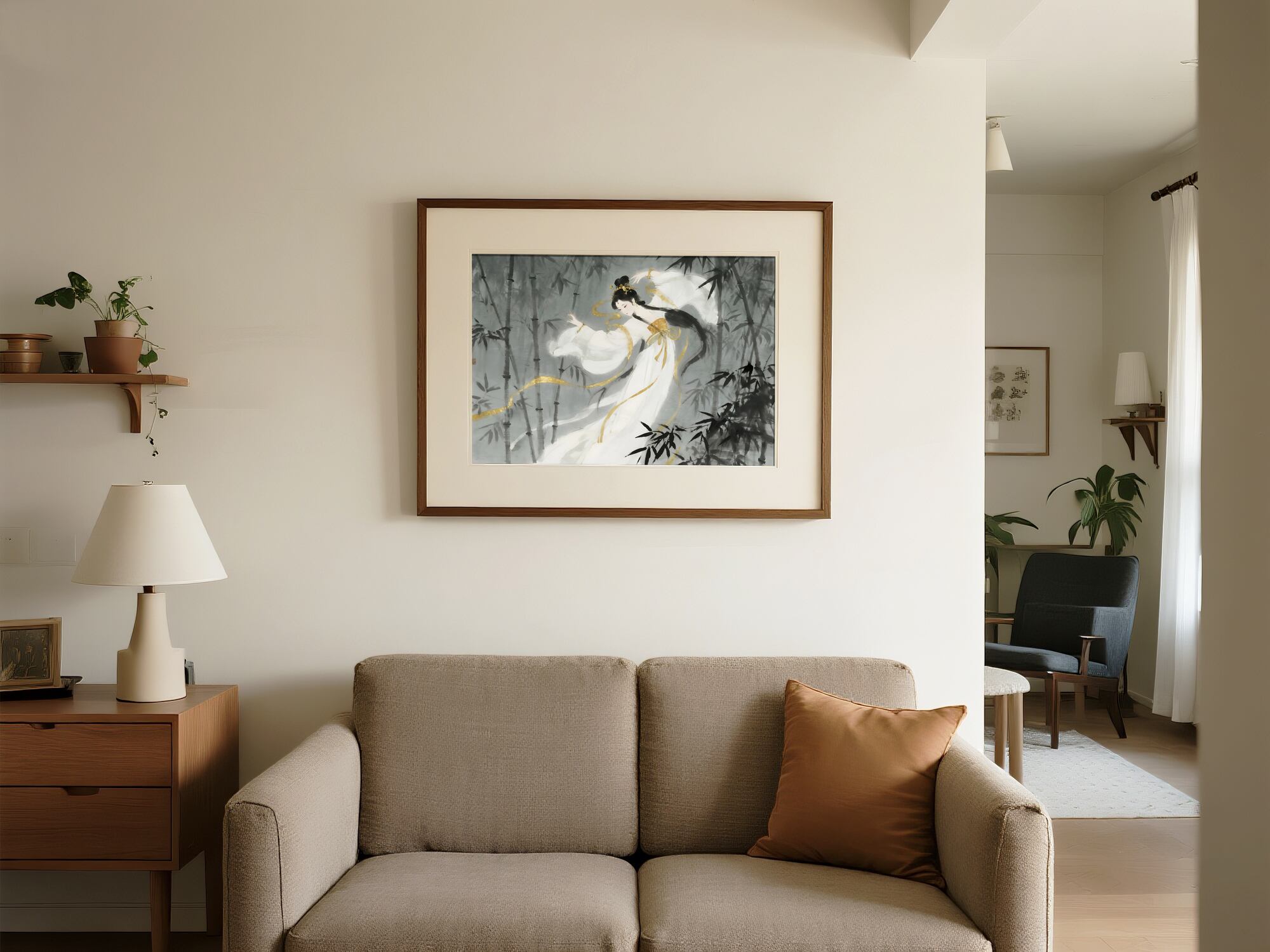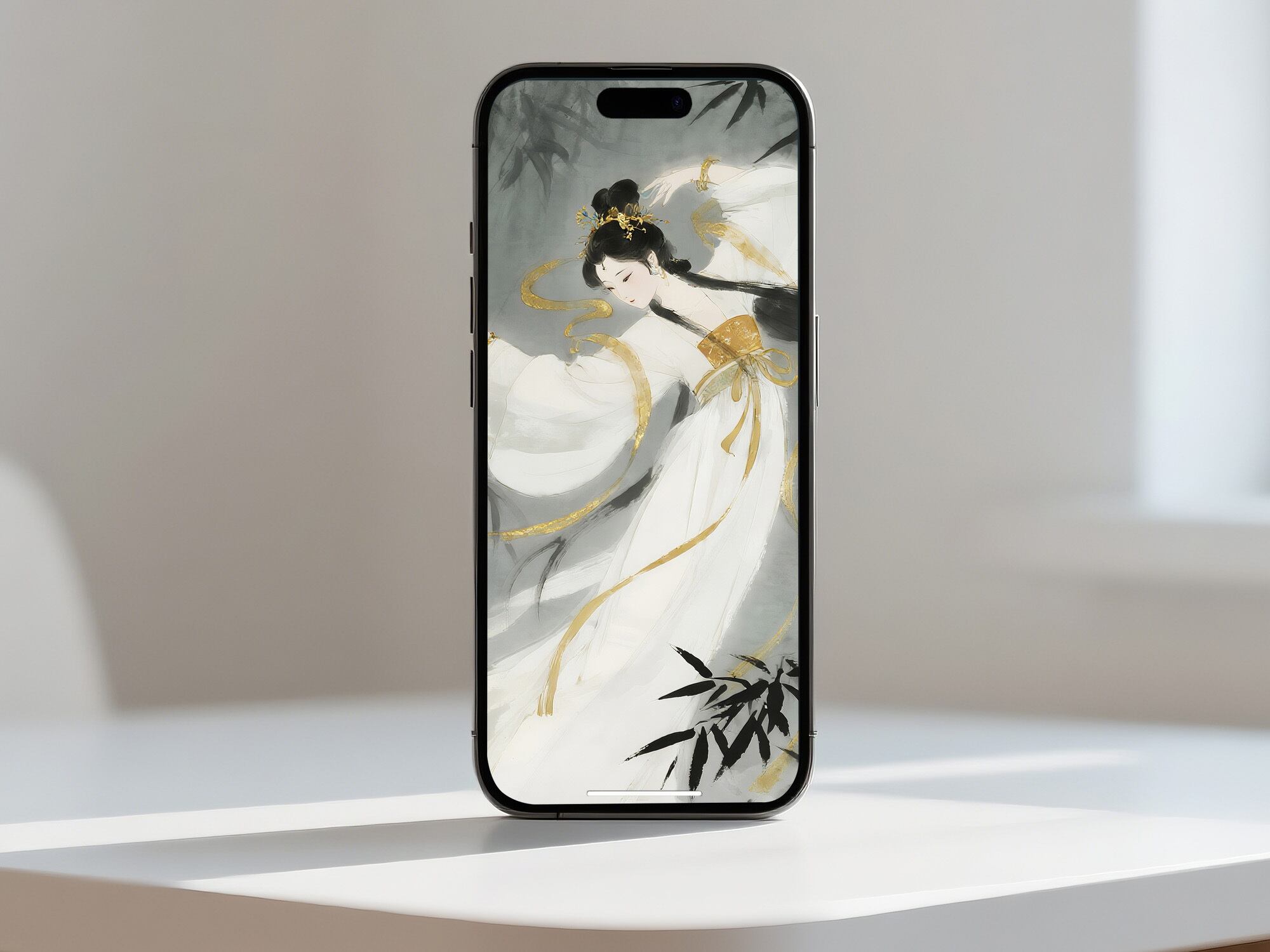 この作品は、夢のような霧に包まれた幻想的な世界を描いています。白い衣をまとった女性が竹林の中を舞うように描かれ、その一瞬の優雅な動きが時間の中に静かに留められています。柔らかい筆致で人物と背景の境界が溶け合い、動と静が共存する詩的な空気が漂います。灰色の中にわずかに輝く金の光が、静かな魔法のような印象を添えています。細部よりも雰囲気で語る作品であり、儚さと静寂の美しさを感じさせる叙情的な一枚です。