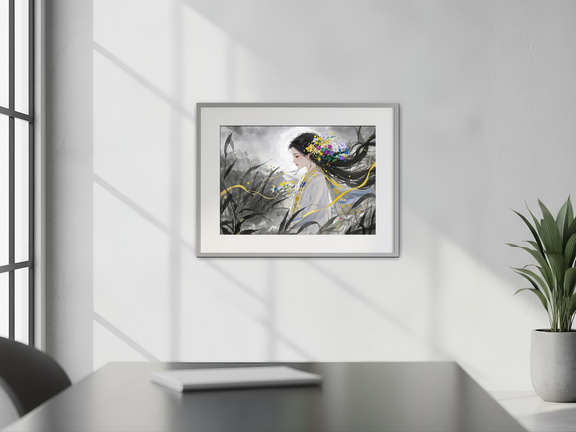 静謐な月夜に佇む女性を描いた詩的で情緒深い作品です。全体を包むモノトーンの世界に、花々の色彩が鮮やかに浮かび上がることで、幻想的なコントラストが生まれています。風になびく髪と衣が物語の一場面を思わせ、観る者に余韻と想像を与えます。華美ではない控えめな美しさが、この作品特有の静けさと感情の深さを引き立てています。シンプルかつ印象的なアートとして、モノクロ作品を好む層にも強く響く一枚です。