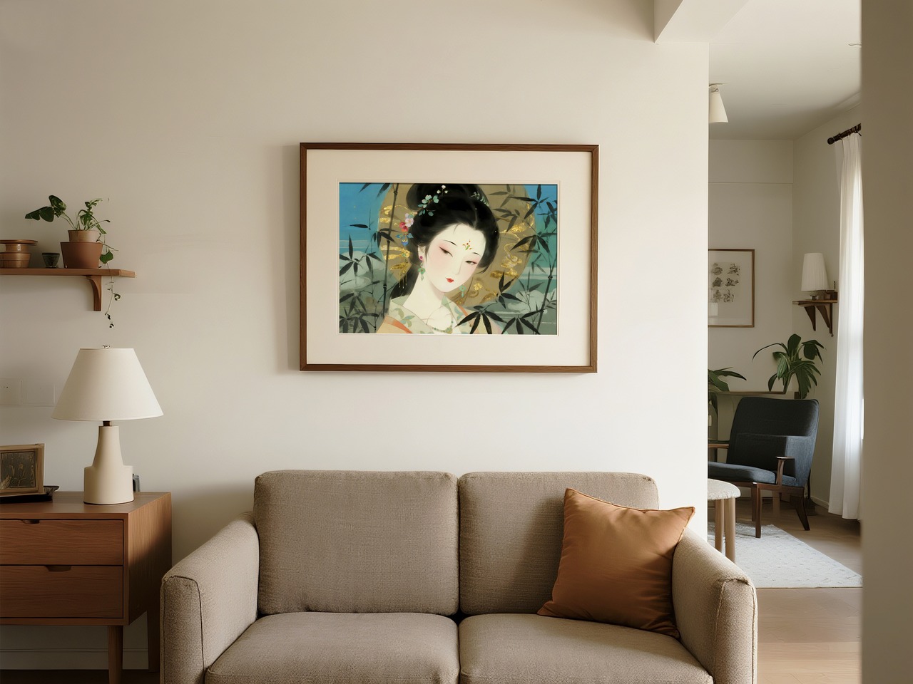 金色の光輪に包まれた気品ある女性を描いたポートレート作品です。伝統的な東洋美人画の優雅さと現代的な描写が融合し、落ち着いた高貴な雰囲気を漂わせます。洗練されたインテリアやギャラリーアートとして最適です。