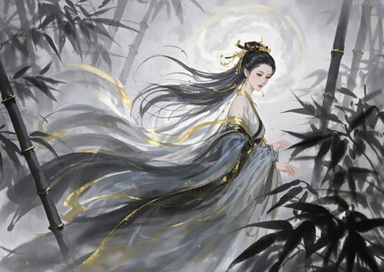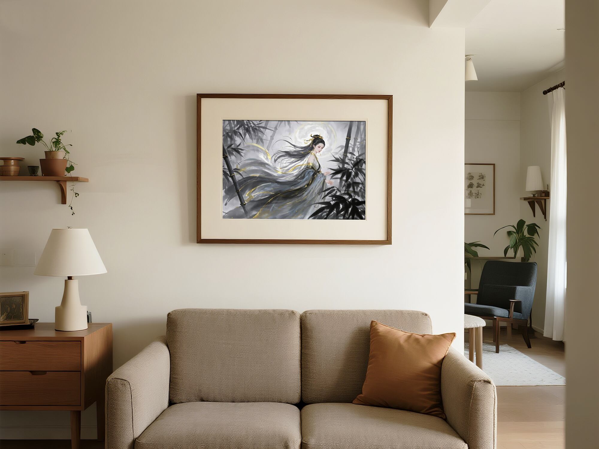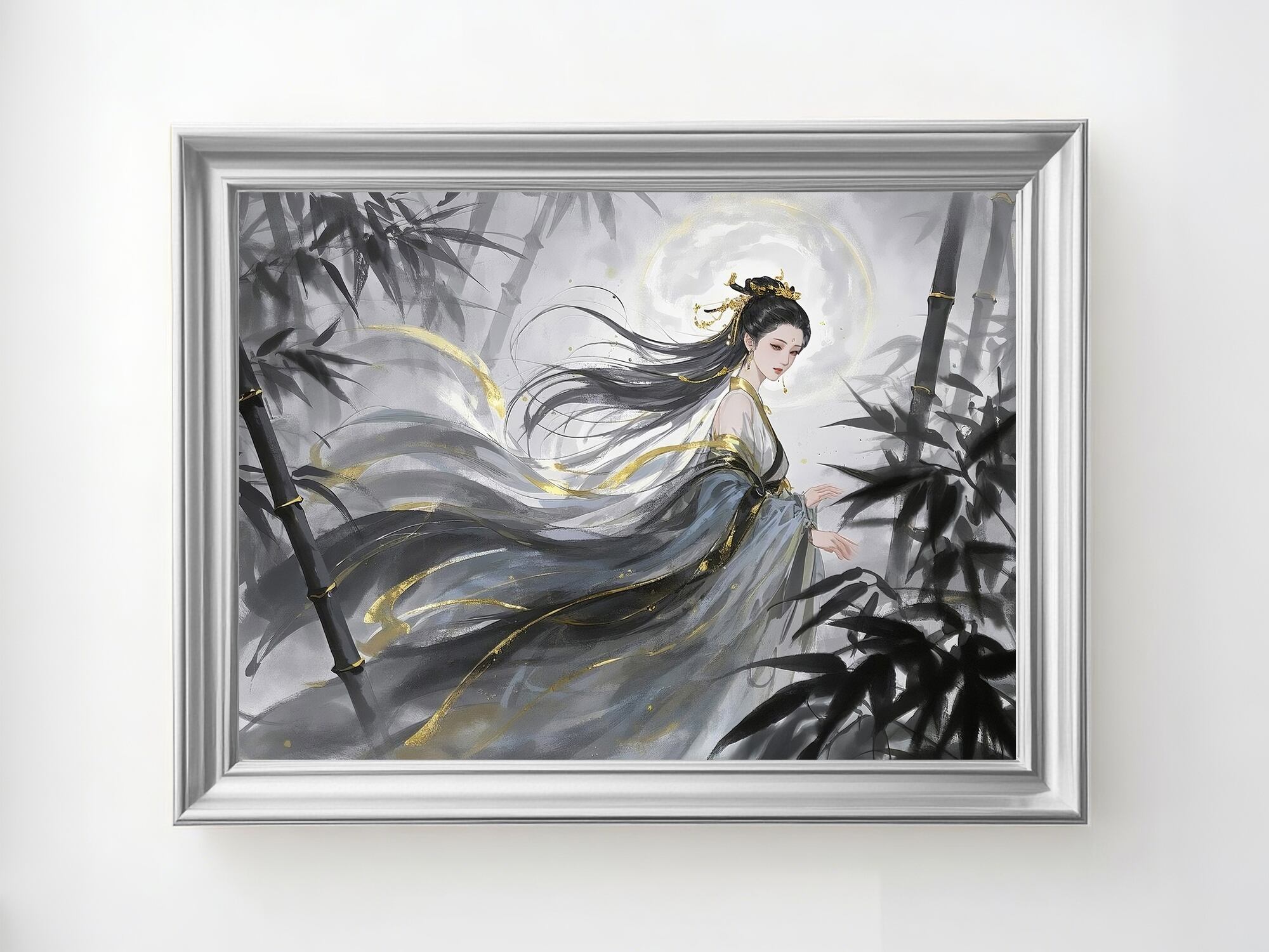 白と灰のモノトーンを基調に、金のアクセントを効果的に用いたドラマティックな構図が印象的です。風に翻る衣と髪の流れが力強く、静寂の中に動的なエネルギーを感じさせます。背景の竹のシルエットがリズムを生み、光輪のような光が神聖さを強調しています。全体に「神話的な力」と「孤高の美」を併せ持ち、荘厳でありながらも儚い印象を与える作品です。