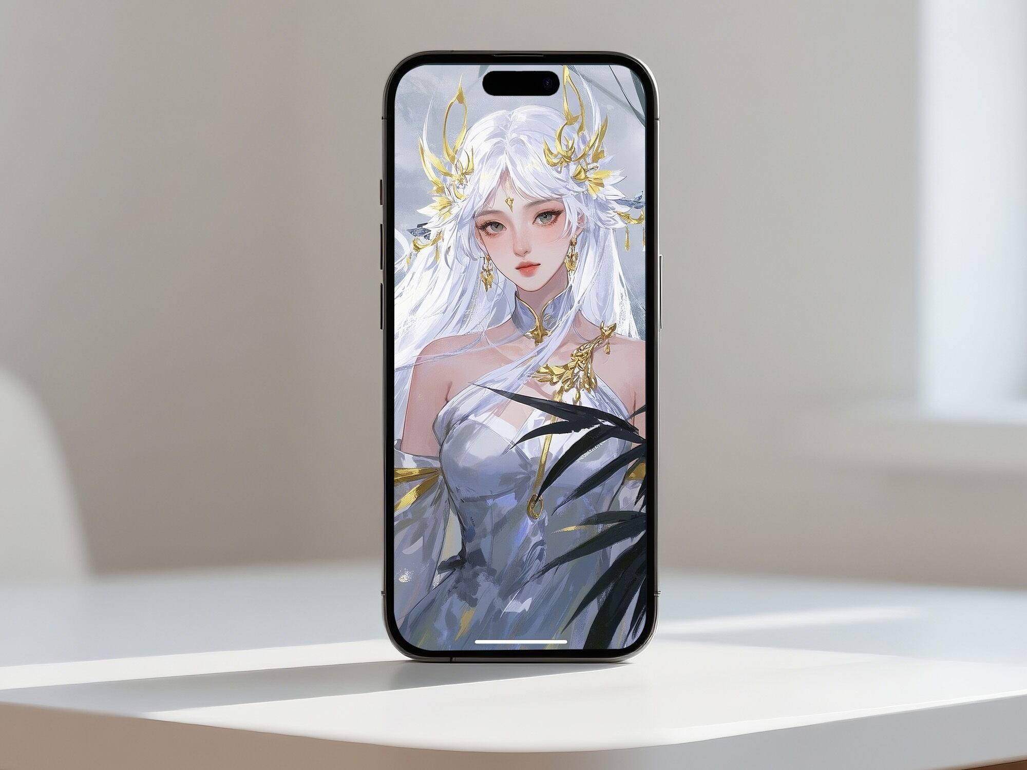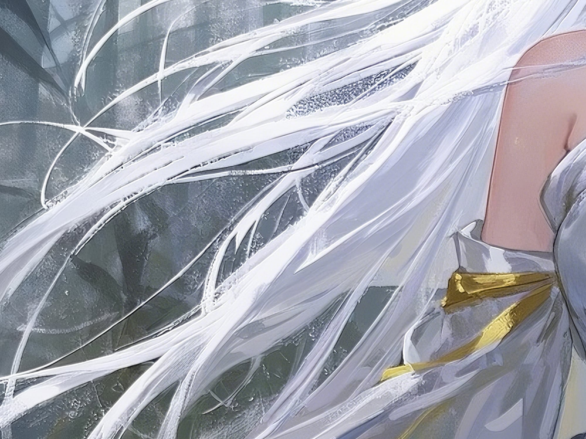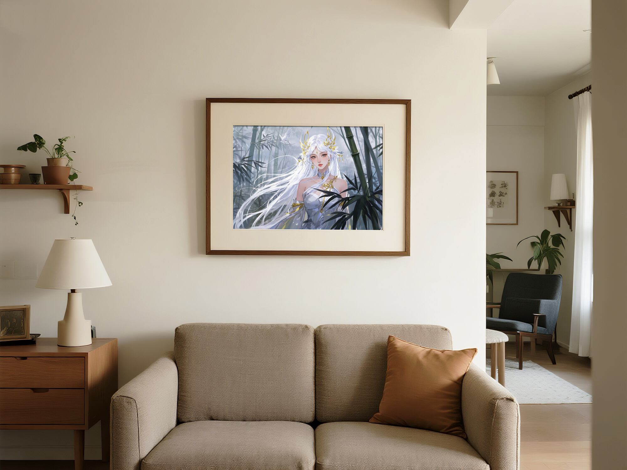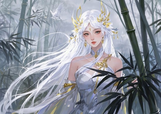 この作品は、幻想的な輝きを放つ女性像を描いた壮麗な一枚です。白い髪と金の装飾が淡い竹林の中で光を受け、静けさと力強さを同時に感じさせます。肌の透明感と背景の青みを帯びたグレーの対比が美しく、人物の存在感を際立たせています。髪や装飾の細やかな描写が神秘的な雰囲気を高め、まるで自然を見守る女神のような印象を与えます。幻想と現代的なデジタル美の融合が見事で、荘厳さと優しさが共存する感動的な作品です。