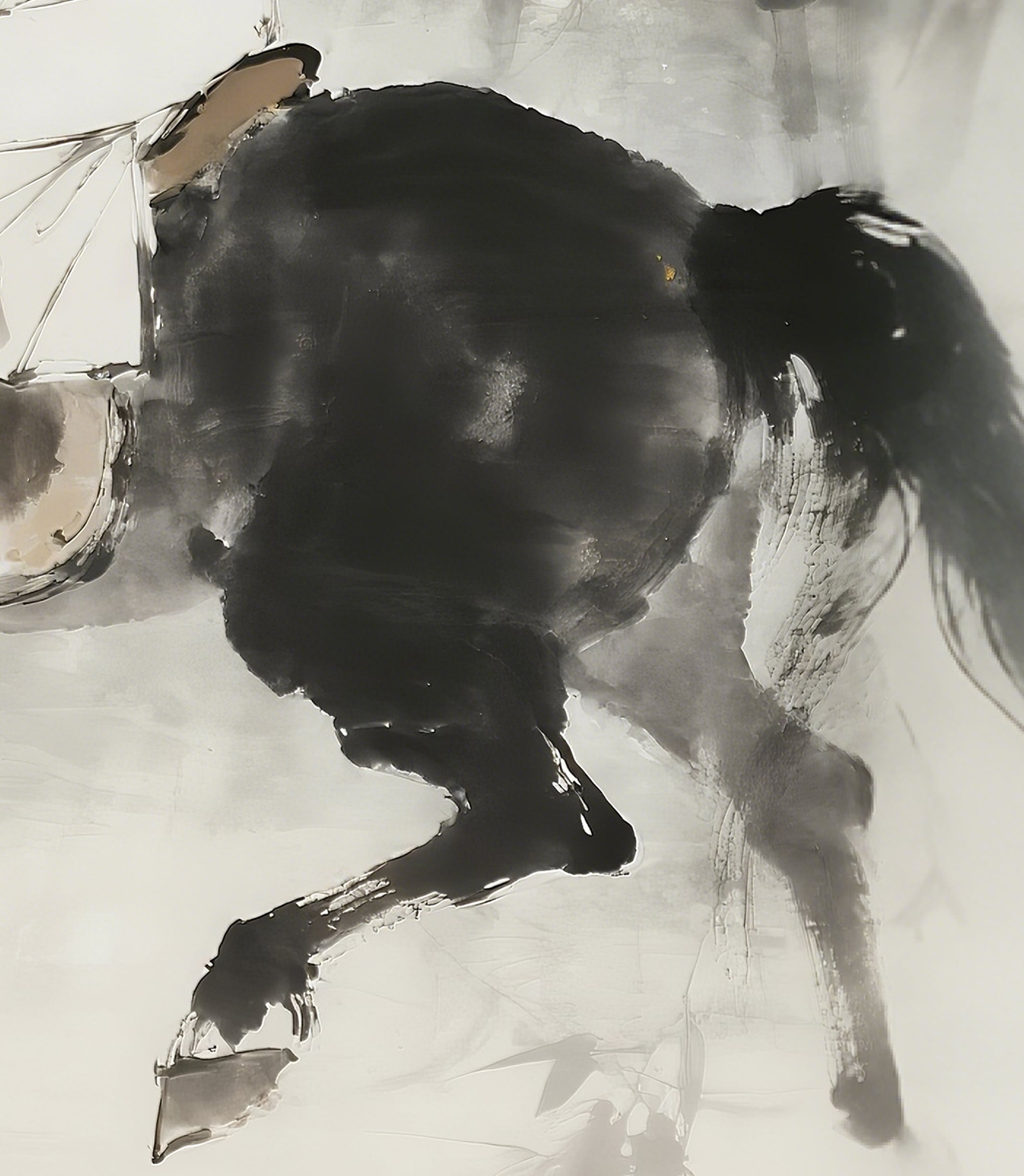 中央に配置された女性と馬が視線を引きつけ、背景の竹が静寂と奥行きを与えています。女性の白い衣服と黒馬のコントラストが鮮やかで、画面全体を引き締めています。柔らかな筆致と淡い背景が、幻想的で静謐な世界観を表現しており、古典的な東洋美と現代的な解釈が共存しています。