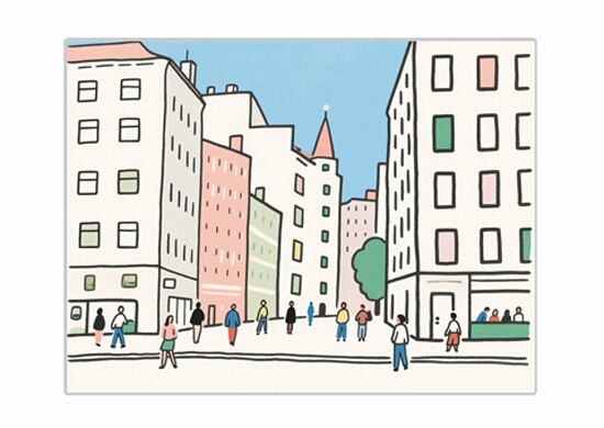 この作品は街角の風景を軽やかに描いたミニマルなイラストです。淡いパステルカラーとシンプルな線画が穏やかで親しみやすい雰囲気を生み出しています。緻密すぎず、余白を活かしたデザインは、現代的でナチュラルなインテリアアートにも適しています。