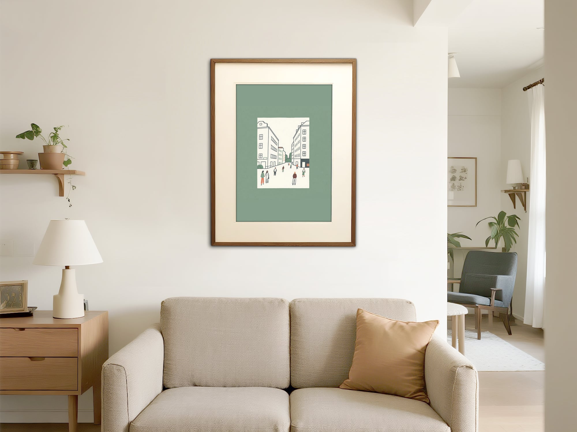 この作品は、ミニマルで洗練されたスタイルが特徴です。建物と人物をシンプルな線と限られた色数で描くことで、都会の静けさと整然とした雰囲気を感じさせます。遠近法を活かした構図により、奥行きが自然に強調されており、観る人を都市の空間に引き込む効果があります。全体の配色が落ち着いていおり、モダン、北欧風、シティライフといったテーマに合う作品といえます。