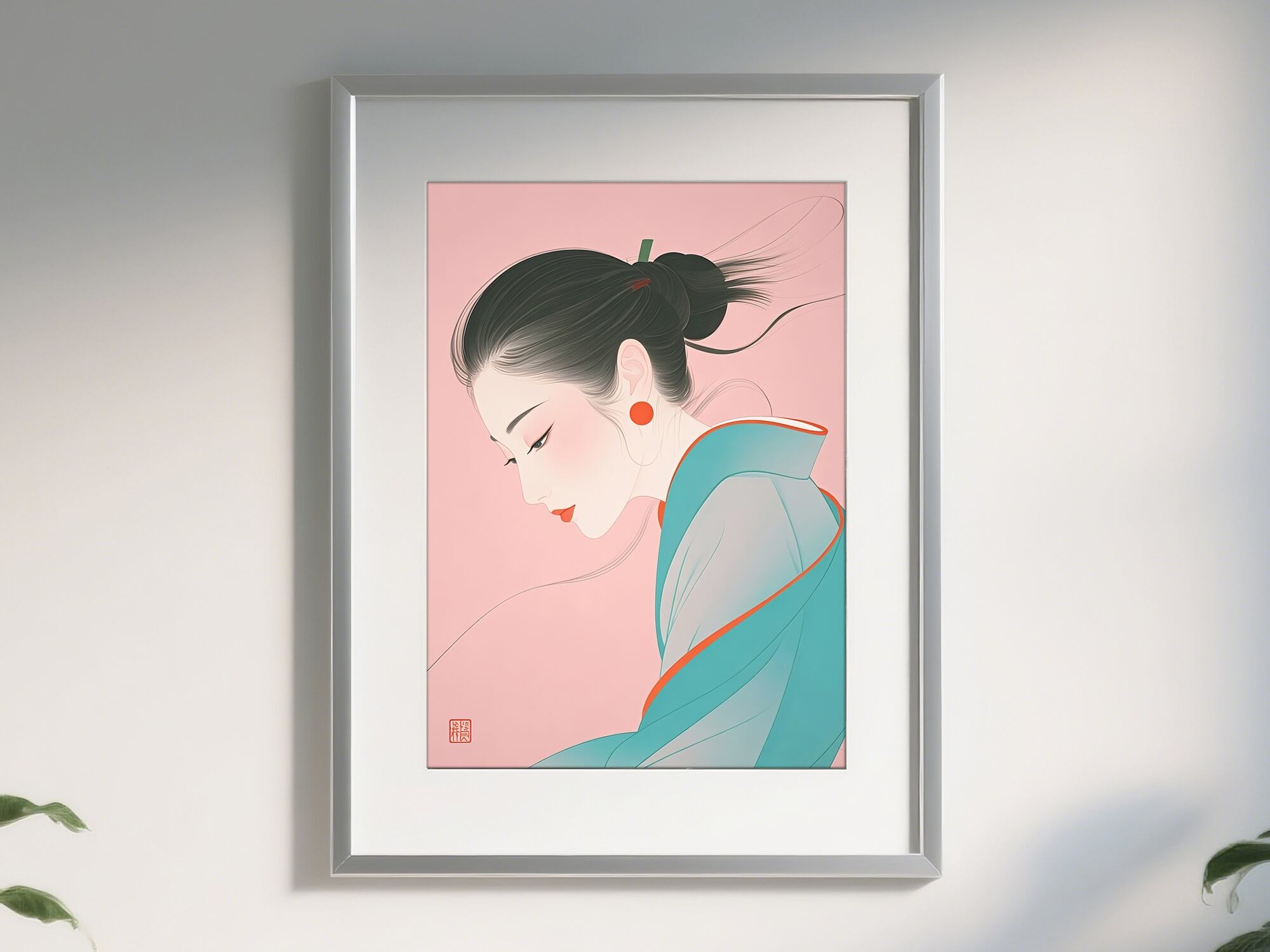 女性の横顔を大きくクローズアップし、余白を活かしたバランス感が非常に優れています。静けさと優雅さが共存しており、見る者に深い印象を与えます。柔らかなピンクの背景に、淡い青緑と朱赤のアクセントカラーが調和しており、非常にエレガントな仕上がりです。髪や着物の線が極めて滑らかで洗練されており、日本的な簡潔美(侘び寂び)を感じさせます。まぶたを伏せた表情からは静謐な感情が漂い、見る者に想像の余地を与えています。