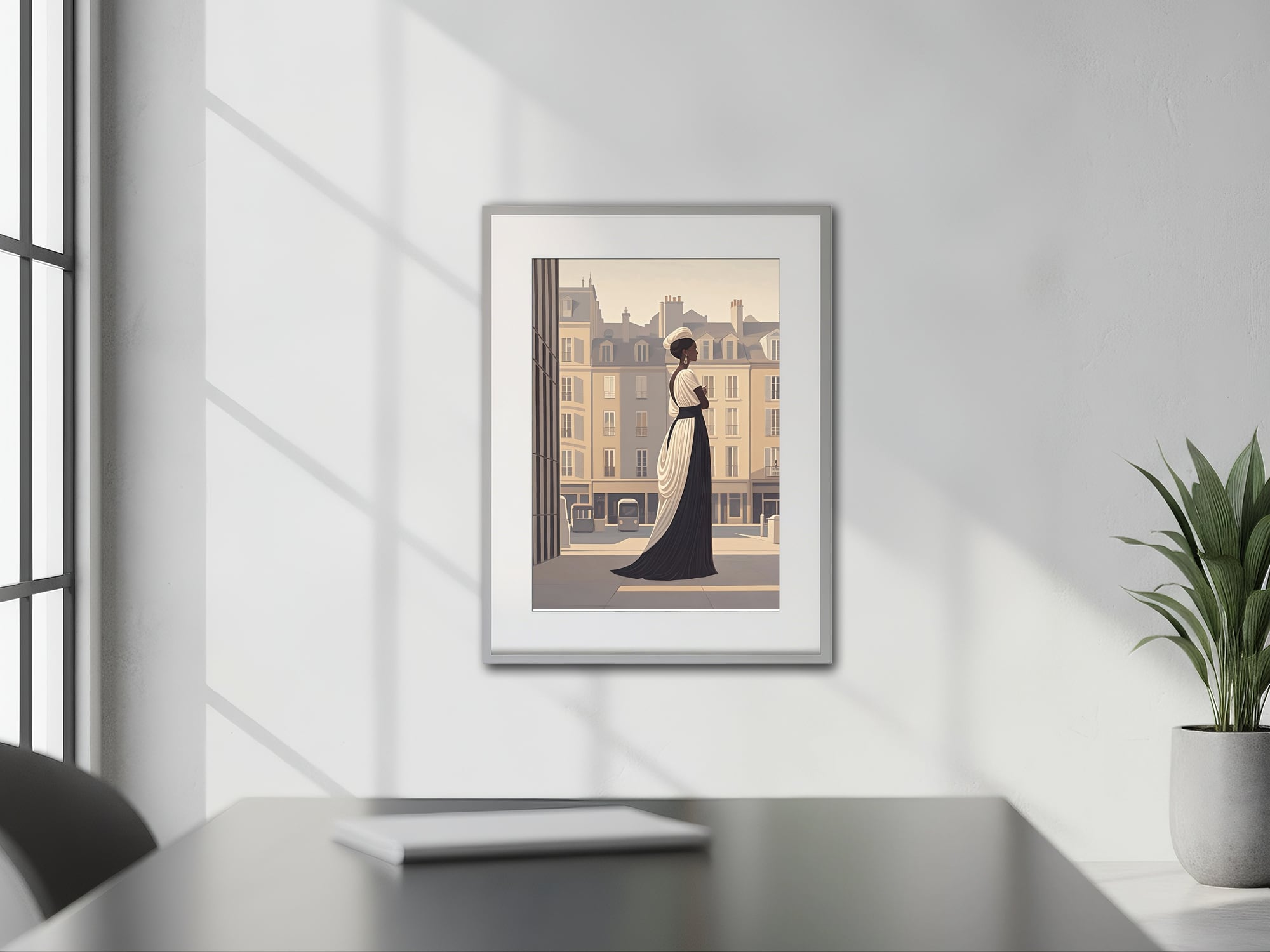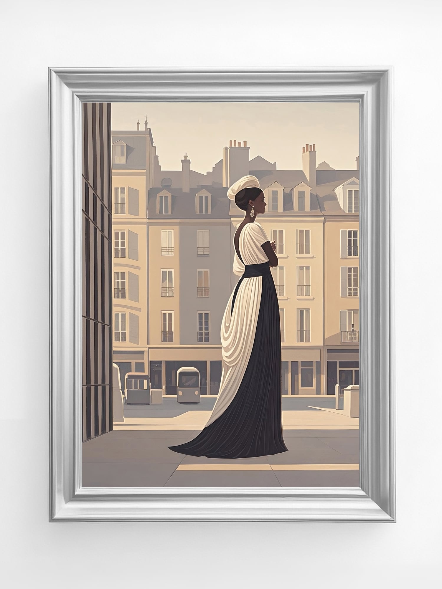 この作品は、静かな自信と時代を超えたエレガンスを表現しています。白・黒・ベージュを基調とした控えめな色調が上品で、女性の立ち姿からは内面の強さと落ち着きが感じられます。背景の建築群がパリ風の洗練された雰囲気を添え、全体として構図の均衡が美しいです。穏やかな光が輪郭を柔らかく浮かび上がらせ、ファッション画と美術作品の中間にあるような魅力を持つ一枚です。
