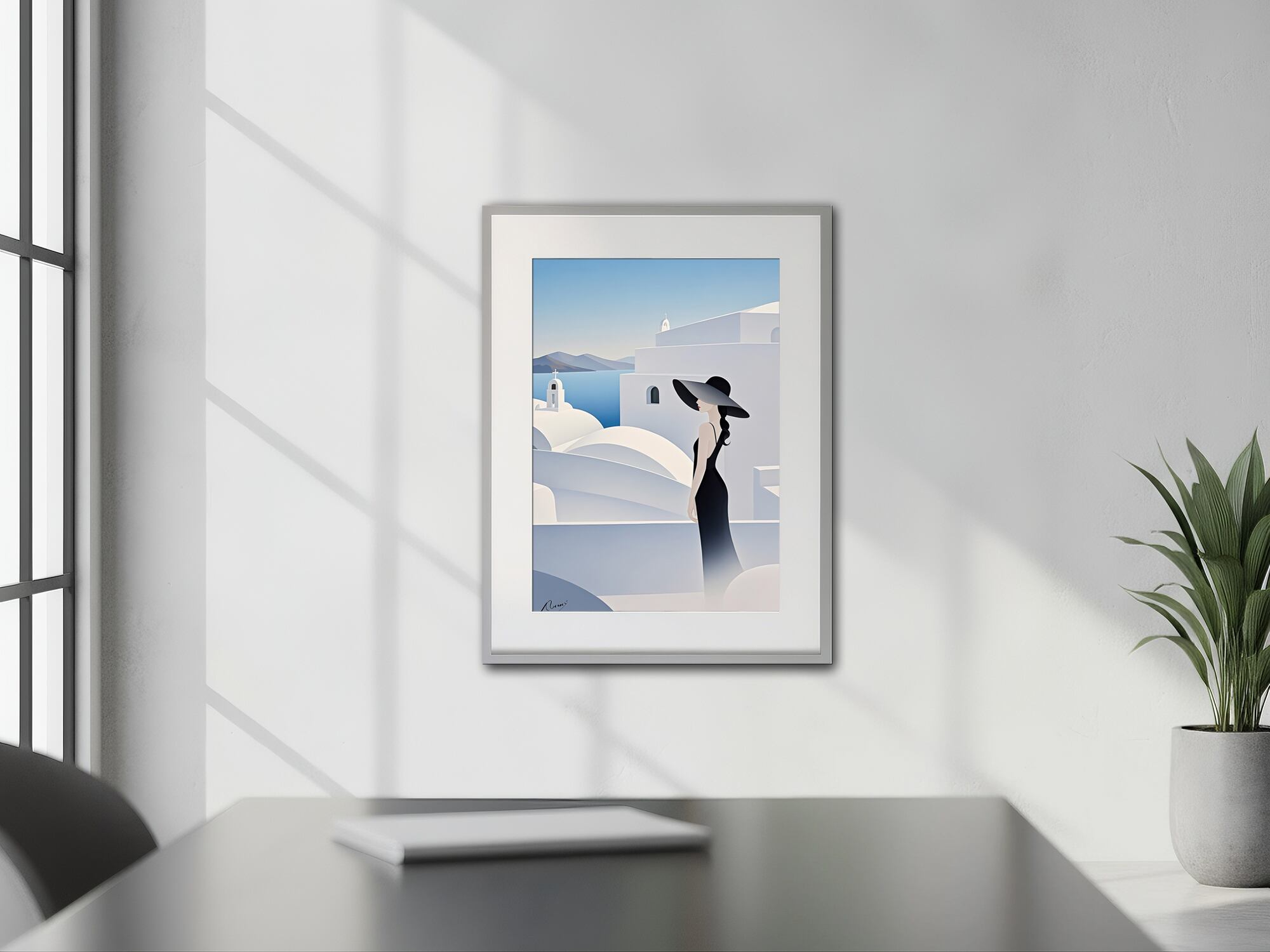 この作品は、エーゲ海を思わせる白い建物と青い海を背景に、黒いドレスと大きな帽子を身にまとった女性を描いた洗練されたアートです。