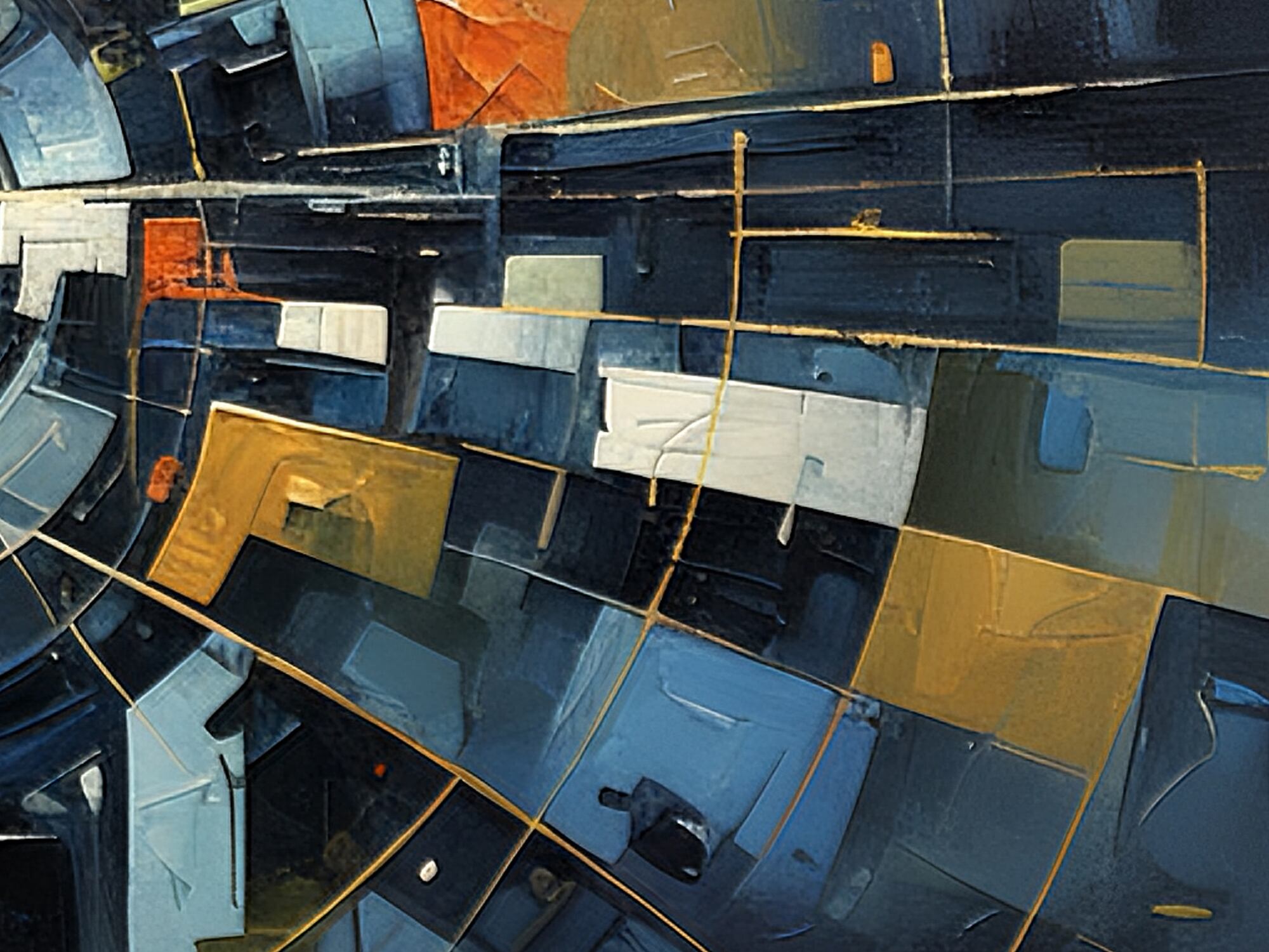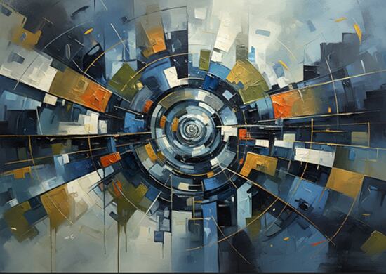 円環と色彩が響き合い、力強さと静けさが同居する抽象アートです。同心円的な中心が視点を固定し、角張った断片や筆致が外向きの動きを生み出しているのが効果的。中心部の細部と周辺の緩い筆触の対比が効いています。金属のような輝きとクールな色調が織りなす構成は、現代的な空間に洗練と深みをもたらす存在感ある一枚となっています。
