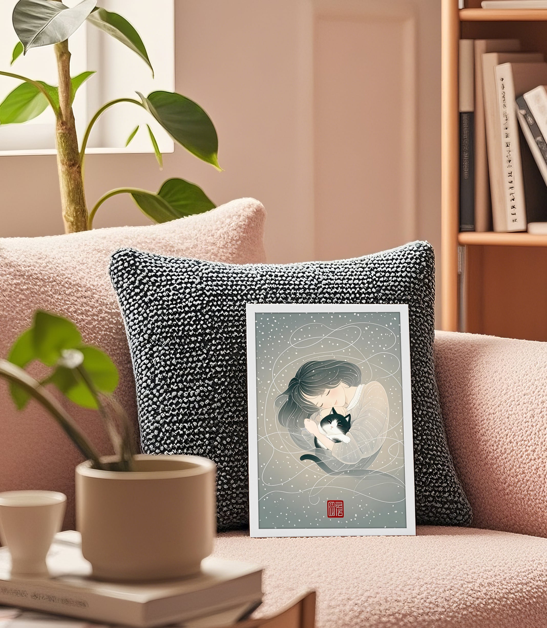 この作品は、柔らかな色調と繊細な線の流れが印象的なイラストで、冬の静寂と温もりを同時に感じさせます。背景に舞う雪の粒は、均一ではなく自然な散らばりを見せており、幻想的な雰囲気を醸し出しています。女性の穏やかな表情と黒白猫の安らぎの姿が、観る者に安心感を与えます。また、白い曲線の装飾は、風や思い出の流れを象徴しているようで、構図全体に動きと詩情を加えています。和風の落款印が作品に品格を添えています。