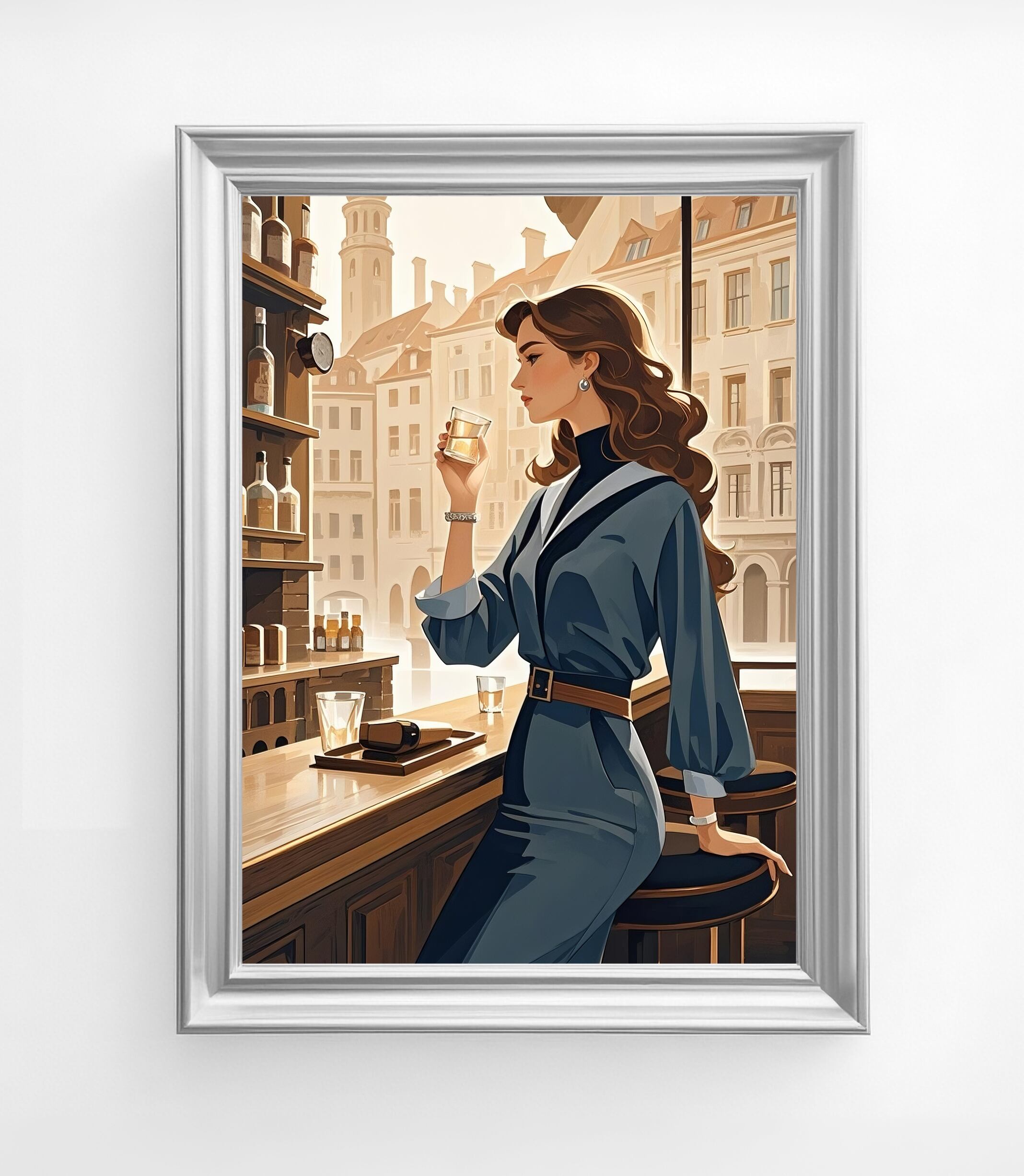この作品は、洗練された都会的な雰囲気を持つデジタルアートです。柔らかい光が窓から差し込み、背景のヨーロッパ風建築と女性の落ち着いた佇まいが調和しています。特に、女性の横顔のラインやドレスのシルエットが優雅に描かれており、知的でエレガントな印象を与えます。色彩は温かみのあるベージュと深みのあるブルーが対比されていて、上品かつクラシカルな雰囲気を演出しています。全体として、映画のワンシーンのようなストーリーテリングを感じさせる完成度の高いアートだと思います。