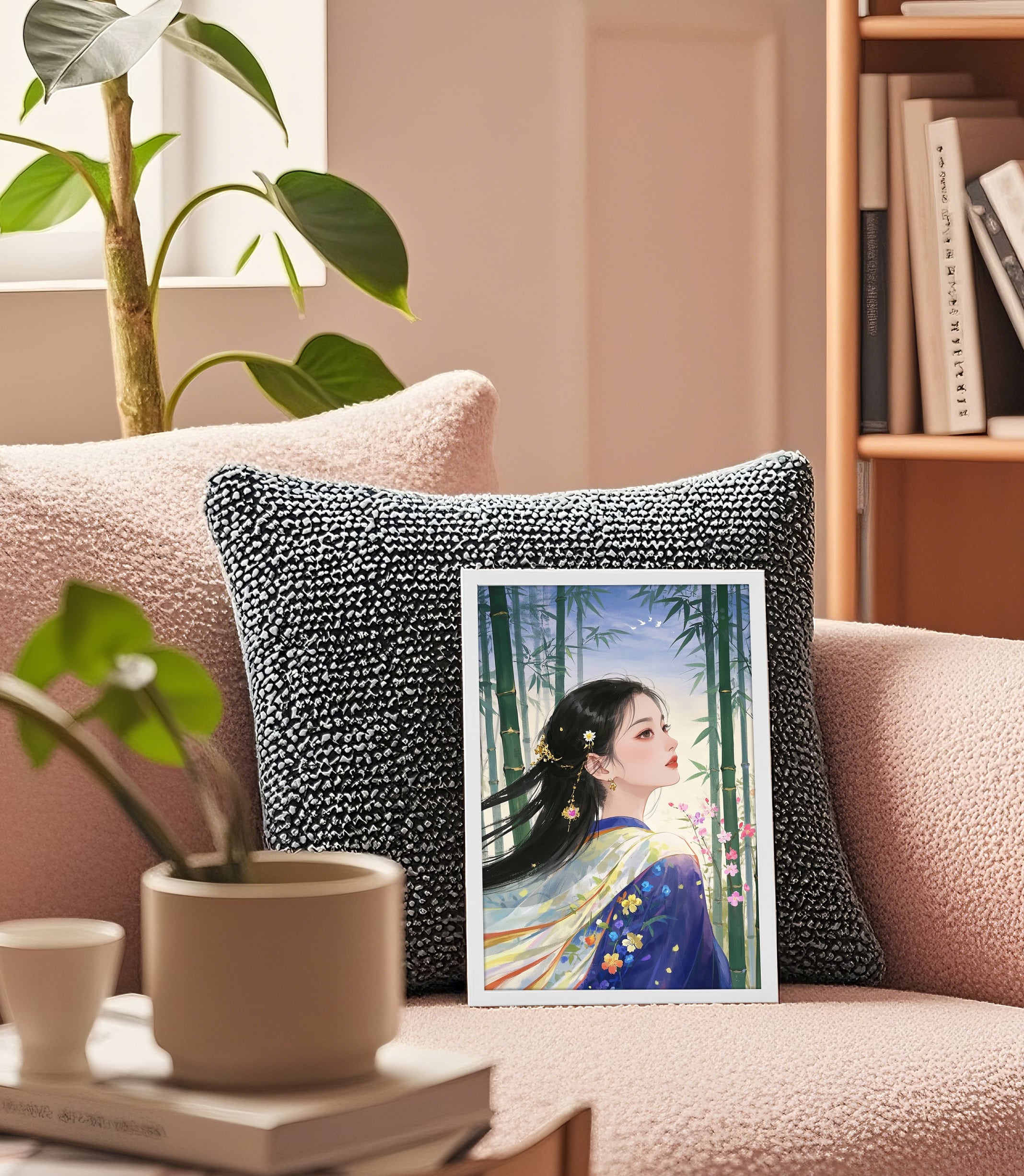 この作品は、伝統美と幻想性が融合したデジタルアートです。斜め上を見上げる女性の横顔と、背景の竹林が自然な奥行きを生み出し、静謐かつ幻想的な雰囲気を強調しています。着物の鮮やかな色合いと繊細な花柄、光を柔らかく反射する髪や装飾品が、非常に高い描写力で表現されています。春の花々と竹の深緑のコントラストも美しいです。女性の表情は内省的かつ優雅で、鑑賞者に静かな物語性を感じさせます。風になびく髪が動きを添え、儚さと生命感を両立させています。韓国の民画や中国の古典美人画、または和風イラストの影響を感じさせる、東アジア的な美意識が際立っています。