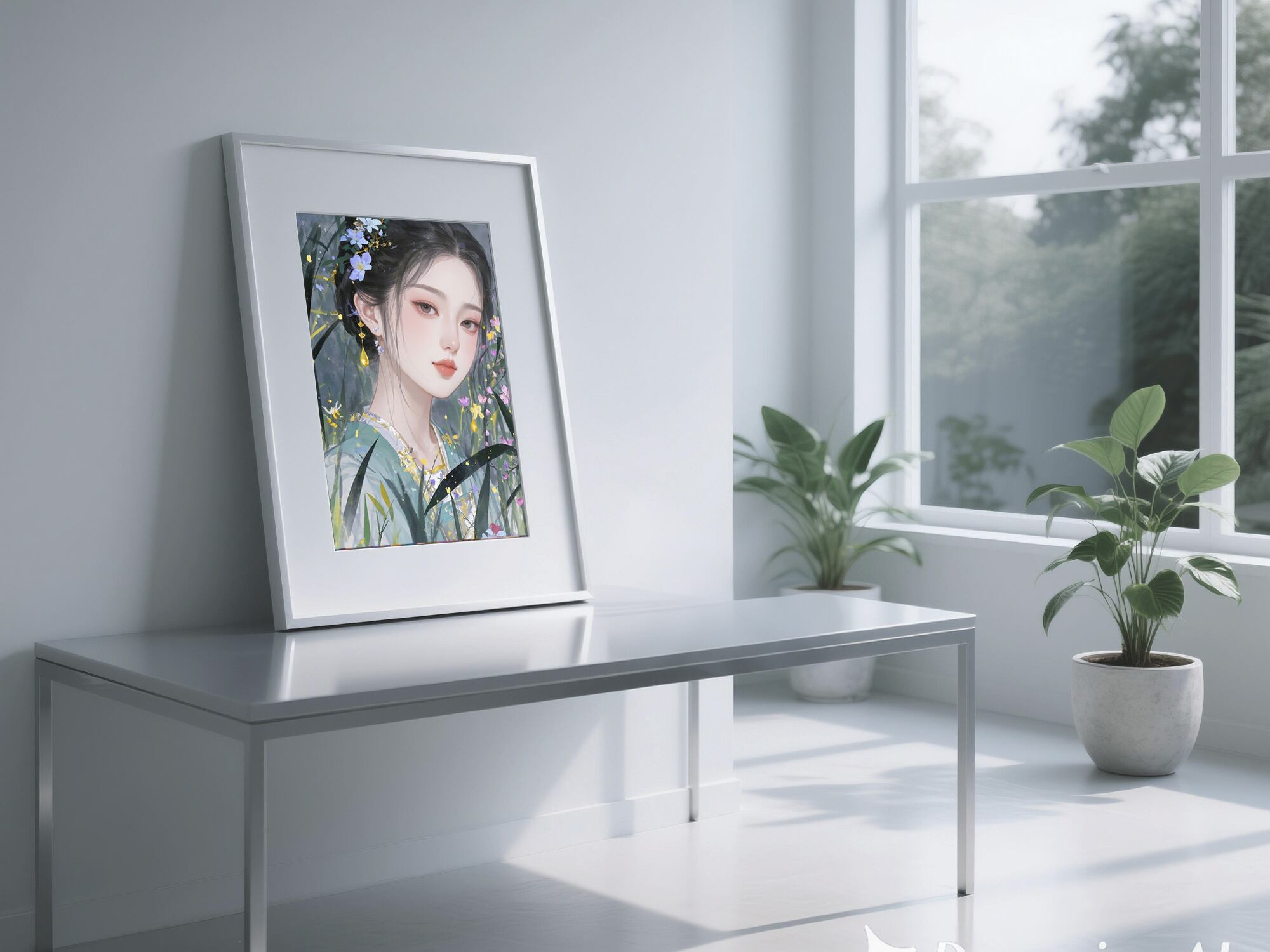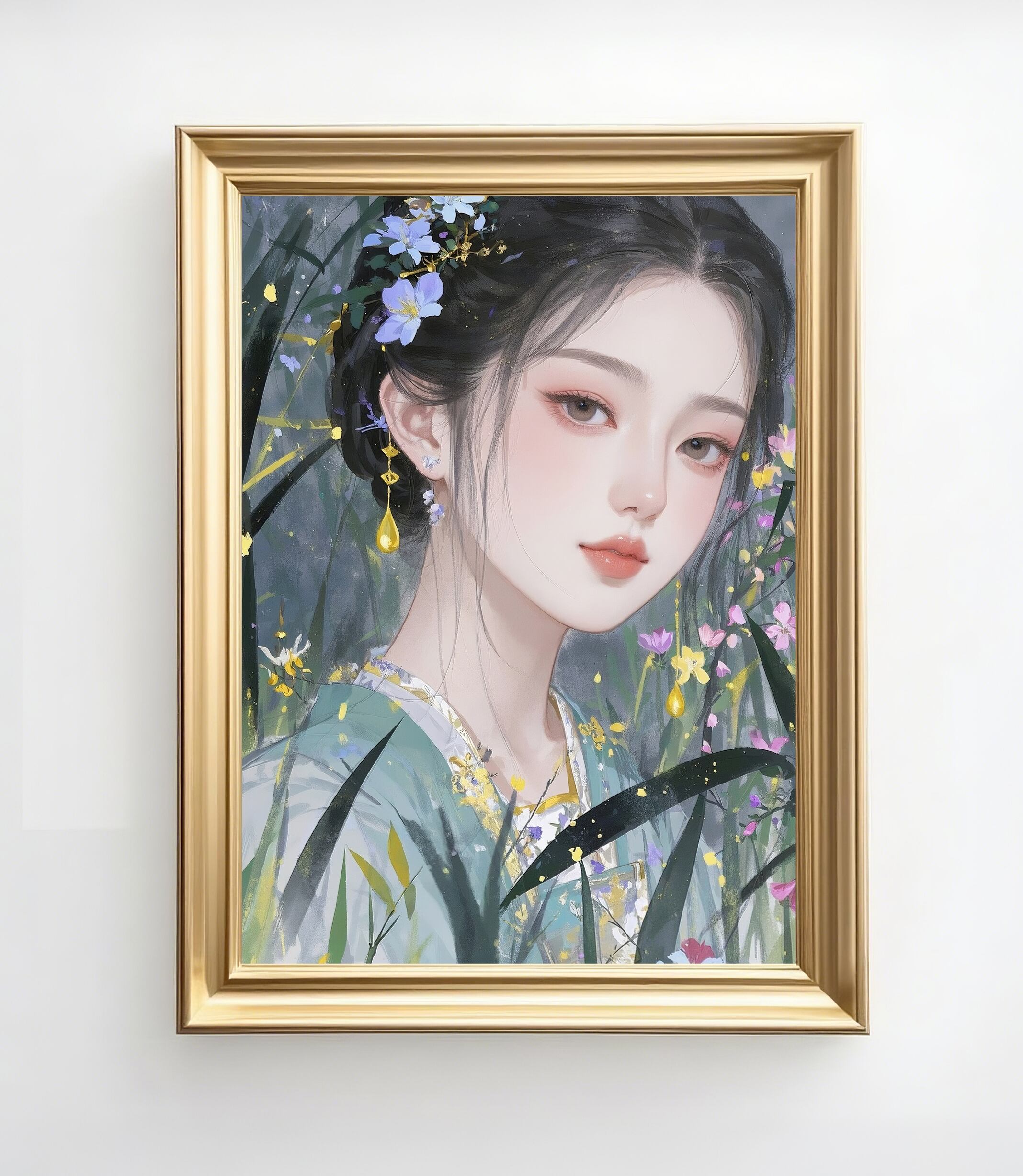 この作品は、現代のデジタルアート技術を駆使して生成された、美しい東洋的な肖像画です。淡いパステルカラーとビビッドな花の彩りが絶妙に調和しており、背景の落ち着いたトーンとのコントラストが主役の女性をより引き立てています。黄色のアクセントカラー(イヤリングや花)も構成にリズムを与えています。人物の顔が画面の中心に配置され、視線が自然と目元に引き寄せられる構図になっています。背景に花や葉が交差することで、平面的にならず、奥行き感が生まれています。女性の表情は非常に繊細で、穏やかで少し憂いを帯びた眼差しが見る者の感情を揺さぶります。AIならではのなめらかな肌や精緻な筆致は、イラストとリアリズムの間を行き来する魅力を持っています。