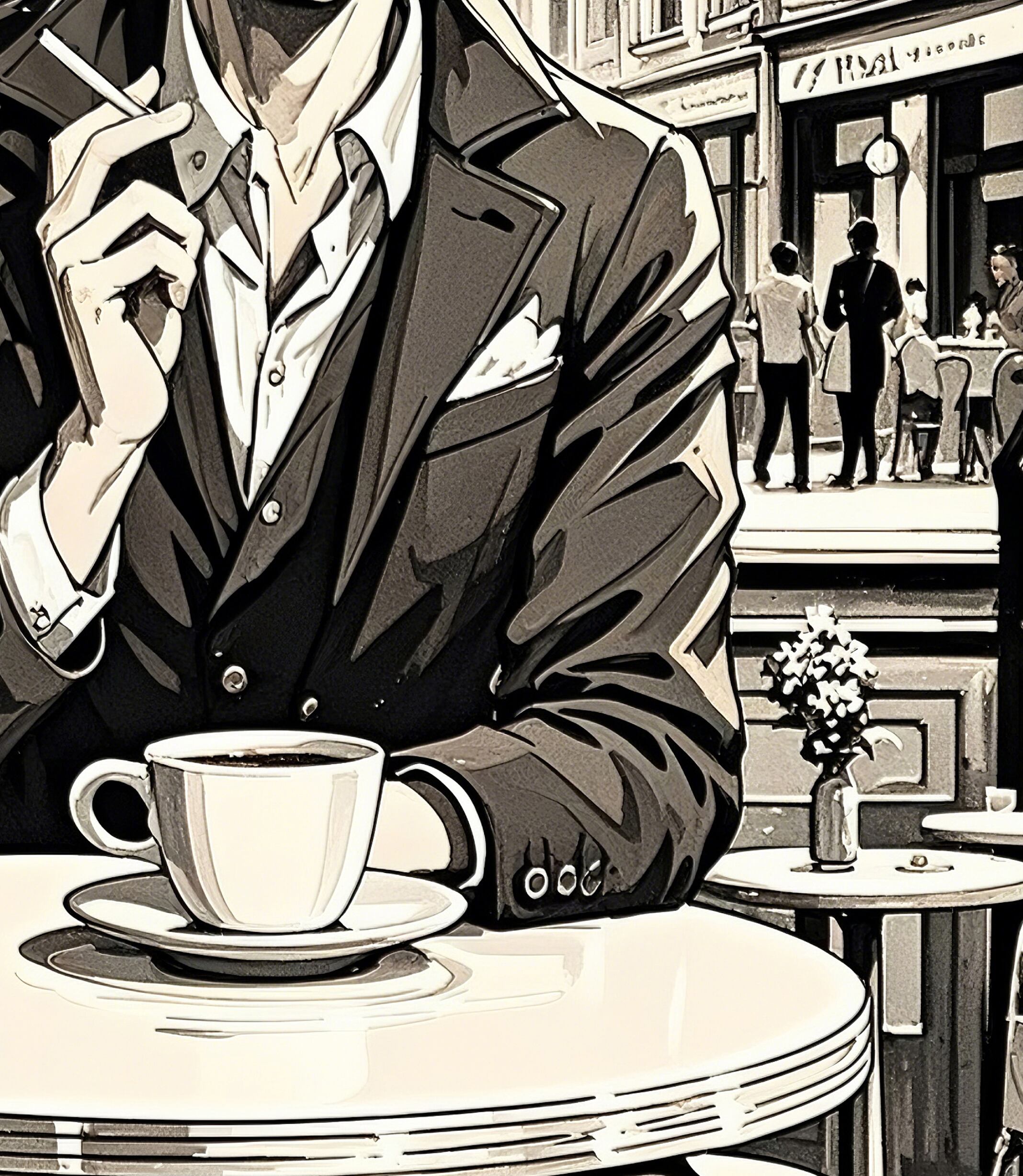 特に印象的なのは、男性の落ち着いた佇まいと視線です。スーツ姿に漂う洗練された気品があり、コーヒーカップや煙草といった小道具が、シネマティックかつ文学的な空気を作り出しています。背景の街並みやカフェのテーブルも丁寧に描かれており、「ヨーロッパの午後の一瞬」を切り取ったような完成度を感じます。