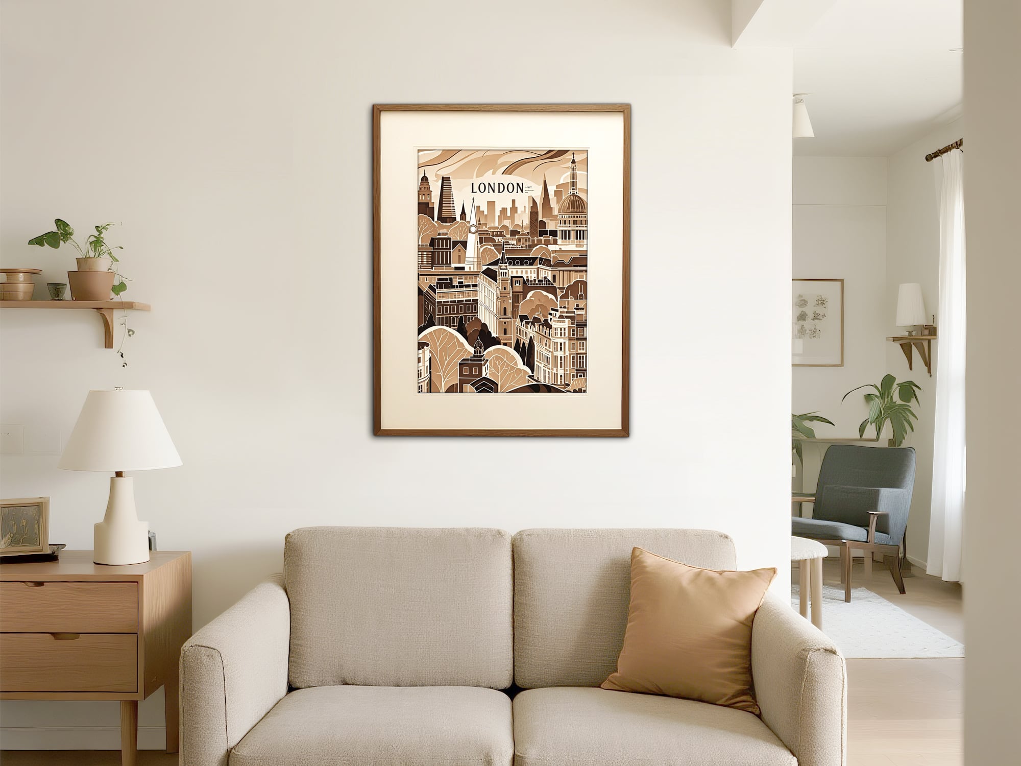 このアートは、ロンドンの街並みをスタイライズした作品で、クラシカルかつモダンな雰囲気を併せ持っています。モノトーンのセピア調でまとめられているため、全体に統一感があり、懐かしさと温かみを感じさせます。