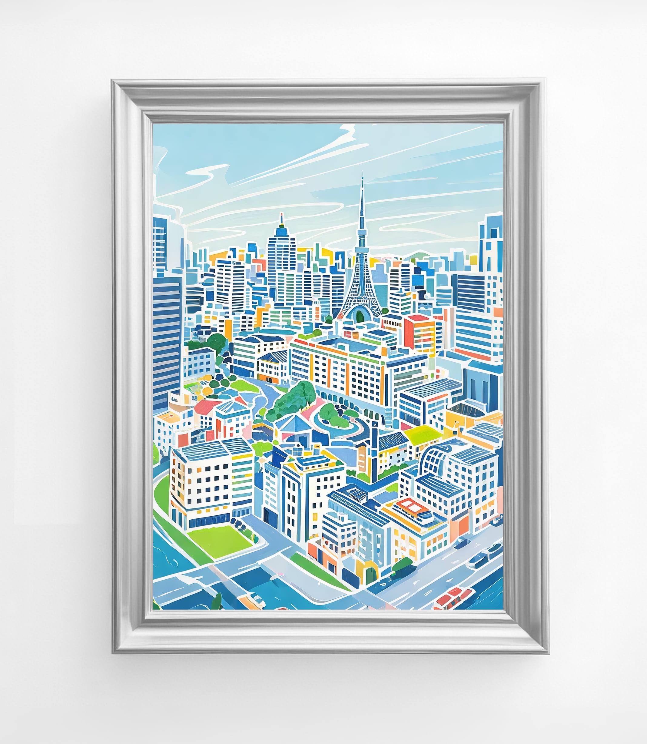 また、東京タワーを中心に据えた構図は象徴性が強く、観る人に「都市のランドマーク」としての安心感と親近感を与えます。細部の表現もシンプルながら情報量が豊富で、都会のリズムや多様性を感じさせる仕上がりです。
