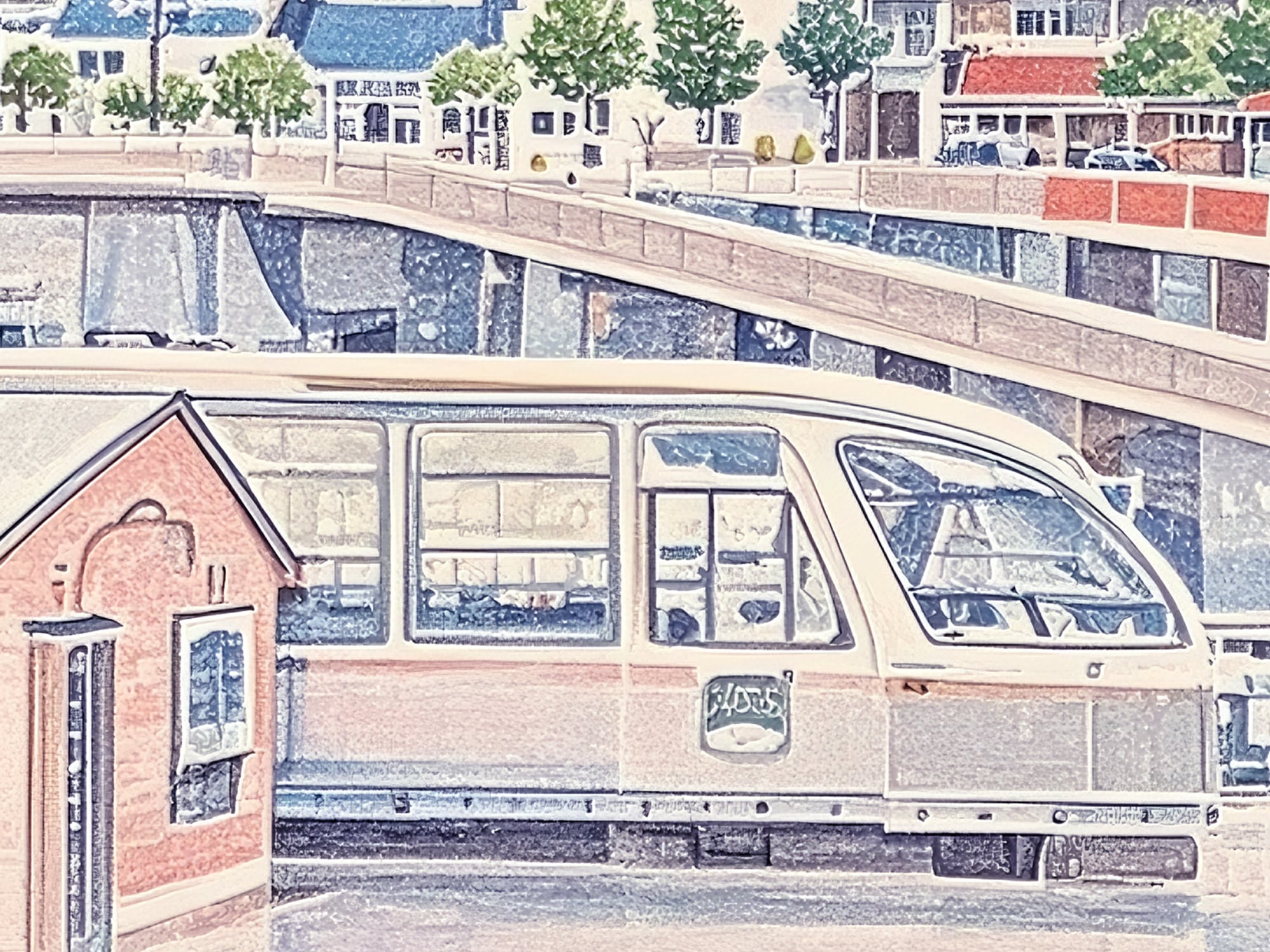 この作品は長崎市街の風景を精緻なタッチで描いたノスタルジックな一枚です。遠景のビル群と近景のバスや電車の描写が丁寧で、過去と現在が穏やかに共存するような雰囲気があります。柔らかな色調と淡い光が、まるで記憶の中の風景を思い出させるようで、どこか懐かしさと温かみを感じます。構図のバランスが安定しており、静かな日常の美を見事に切り取った作品です。
