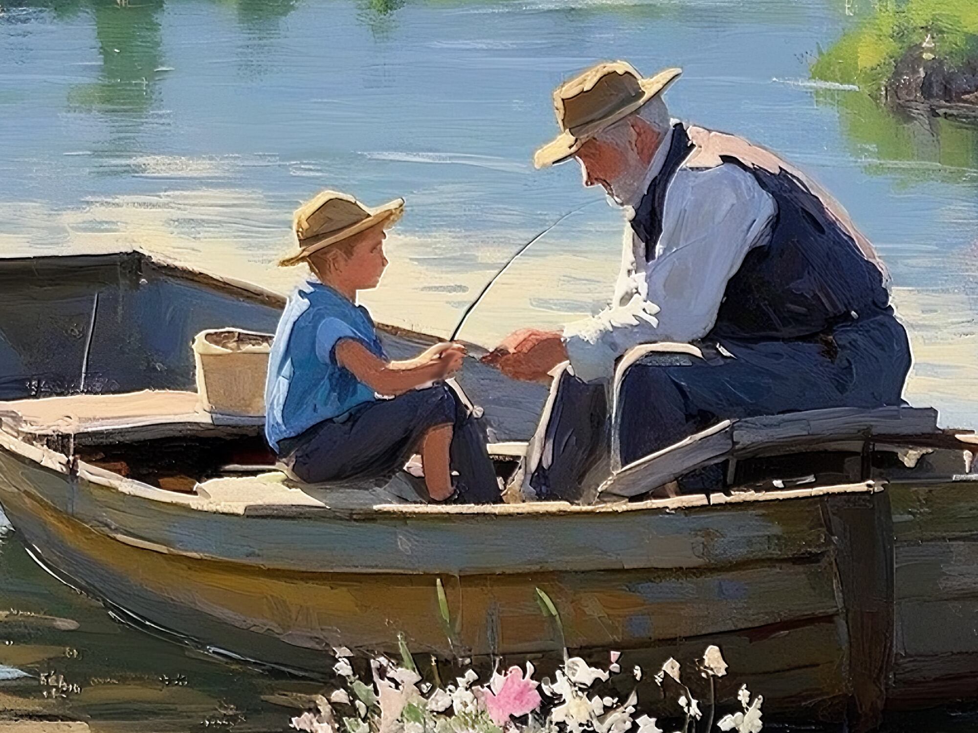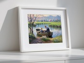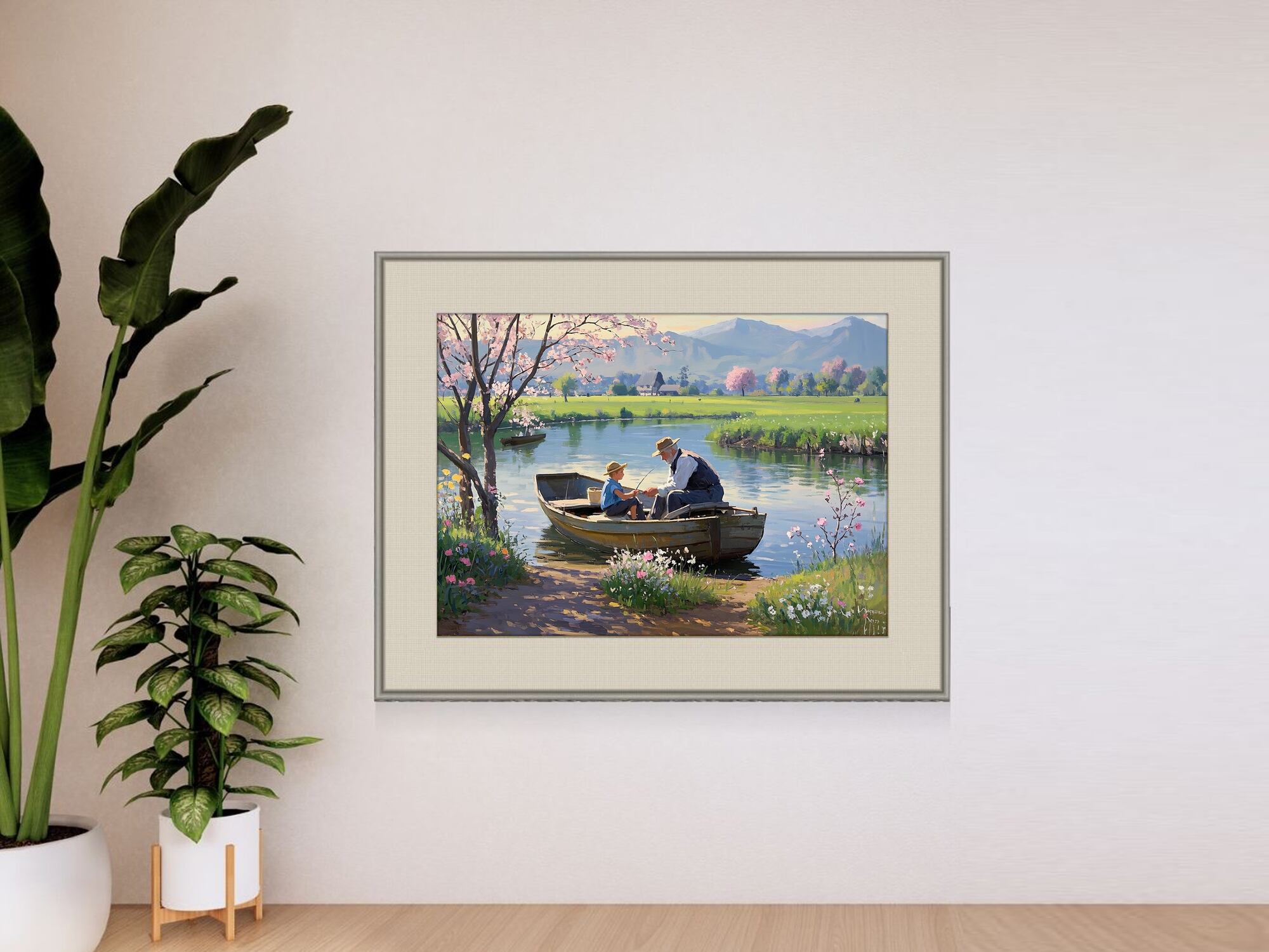 この作品は、穏やかな春の風景と人間関係の温かさを見事に表現したアートです。桜の花が画面を彩り、手前の草花と奥行きのある山並みが構図に深みを与えています。特に印象的なのは、ボートに乗る祖父と孫と思われる二人の姿です。釣り糸を手にしながら交わされる仕草には、世代を超えた絆や学びの瞬間が感じられます。光の使い方も柔らかく、懐かしさや安心感を呼び起こします。牧歌的で心に安らぎを与える優れた作品といえます。