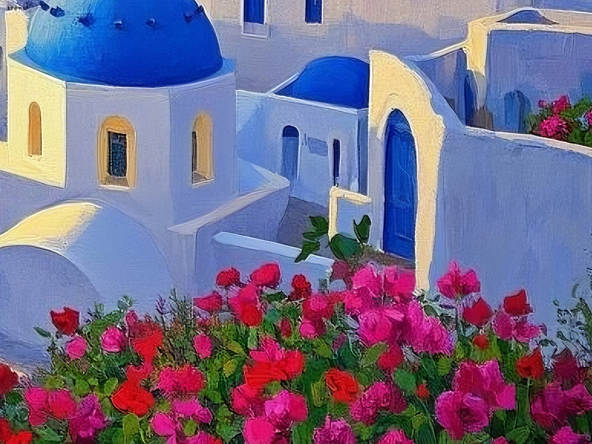このアートは、サントリーニ島の夕景を幻想的かつ詩的に描いた印象派的なデジタル作品です。