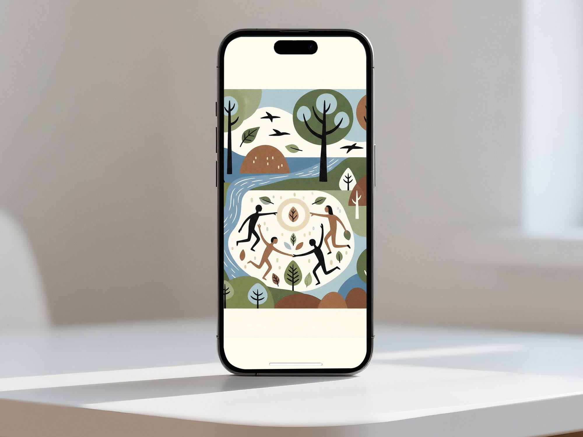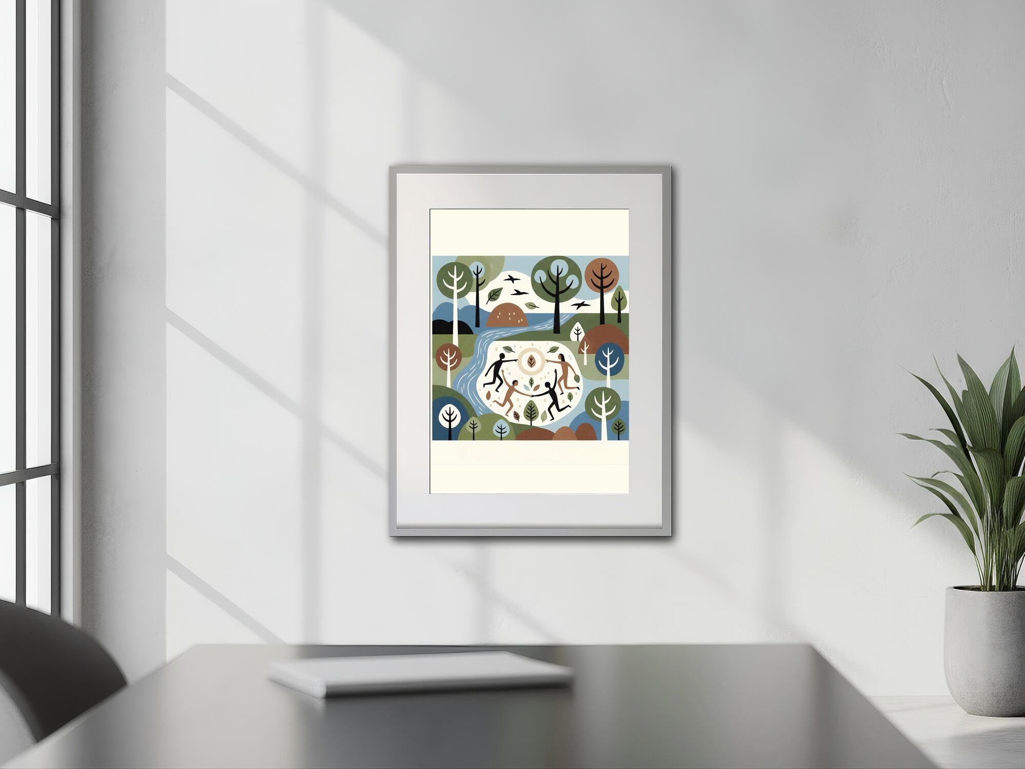 この作品は、都市ではなく自然をテーマにした柔らかいタッチのアートです。中央で手をつなぐ人々と、周囲を囲む森と川の構図が調和を象徴しています。色彩はやや淡く落ち着いており、自然との共生やスローライフを感じさせる癒し系の雰囲気です。幾何学的でありながら有機的なラインが融合していて、静けさと躍動感が共存する印象的な作品です。