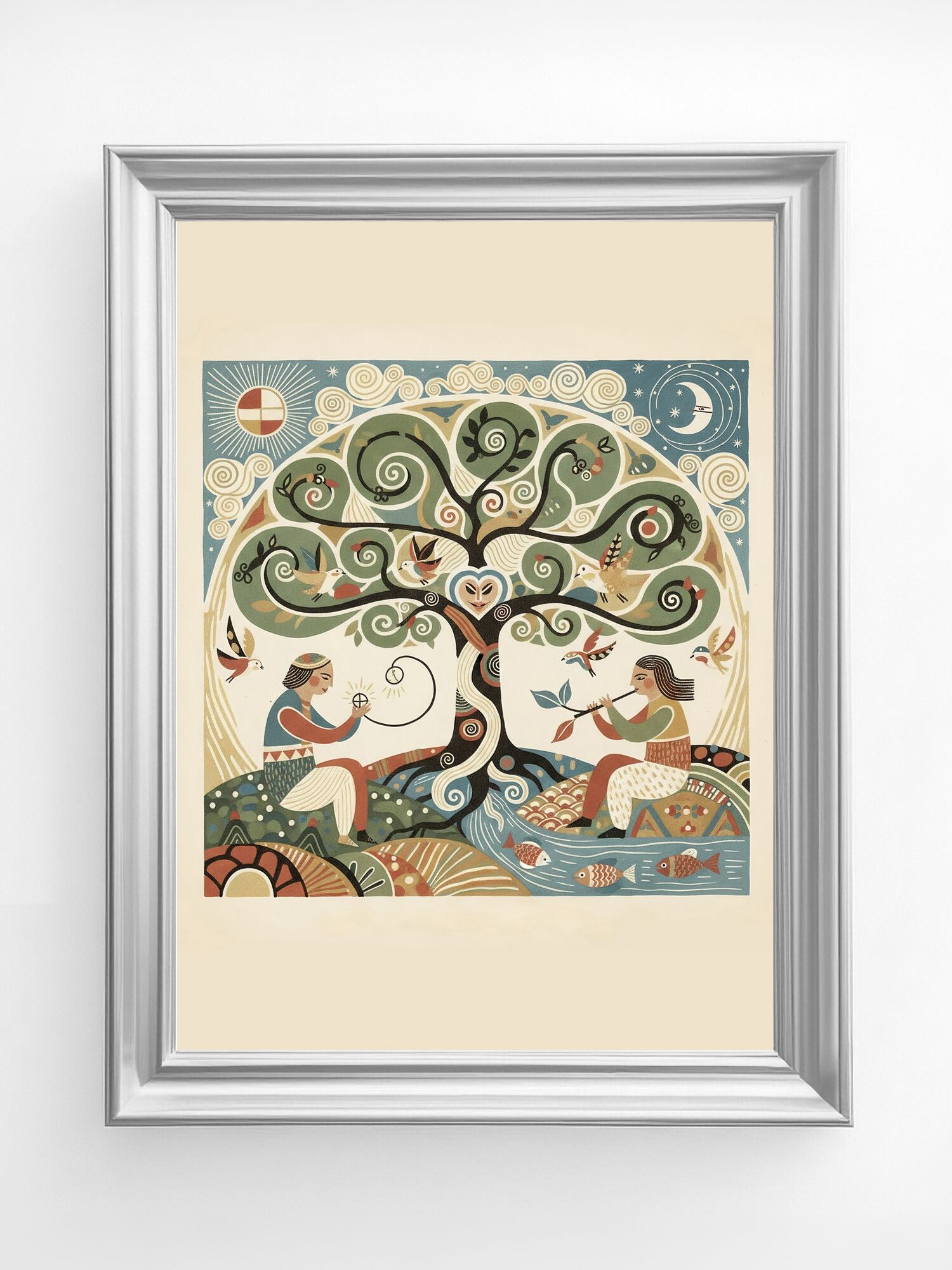 この作品は「生命の樹」をモチーフにしたシンボリックな構成が特徴です。木の曲線的な枝と葉が全体を包み込むように広がり、人と自然、昼と夜のバランスが巧みに描かれています。温かみのあるアースカラーと細やかな文様が民芸的な雰囲気を醸し出しており、非常に完成度が高いです。構図・配色・象徴性が調和していて、ヒーリングアートやスピリチュアルな表現にも向いています。