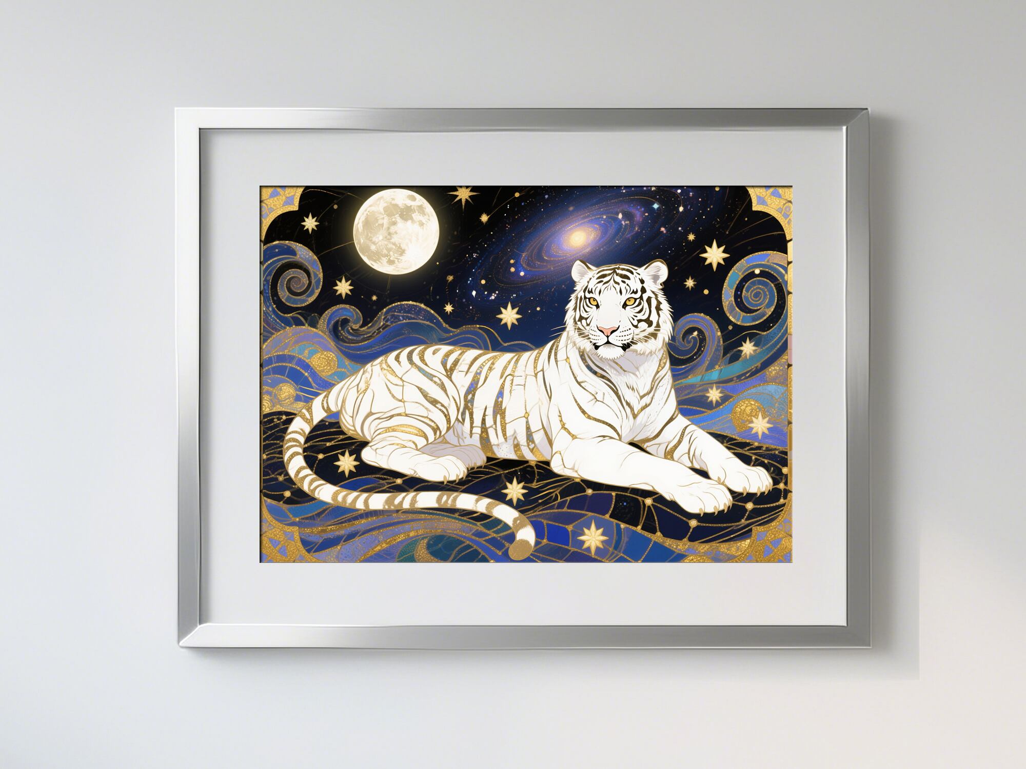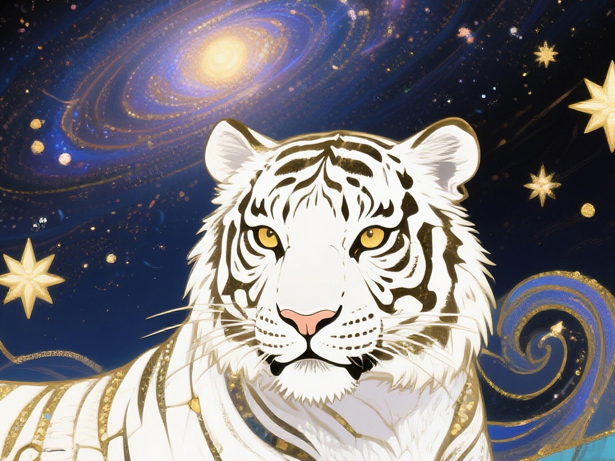 白虎は、月の女神の化身とも伝えられ、子宝、安産の神様という面も持ち合わせている強さと優しさを兼ね備えた四神といえます。また、その力強い姿から、邪気を払い、家庭を守護する力も備えていると言われています。星、満月、宇宙の波、銀河、渦巻き、そして豪華な天体模様に囲まれた美しい白虎のファンタジーイラスト。
