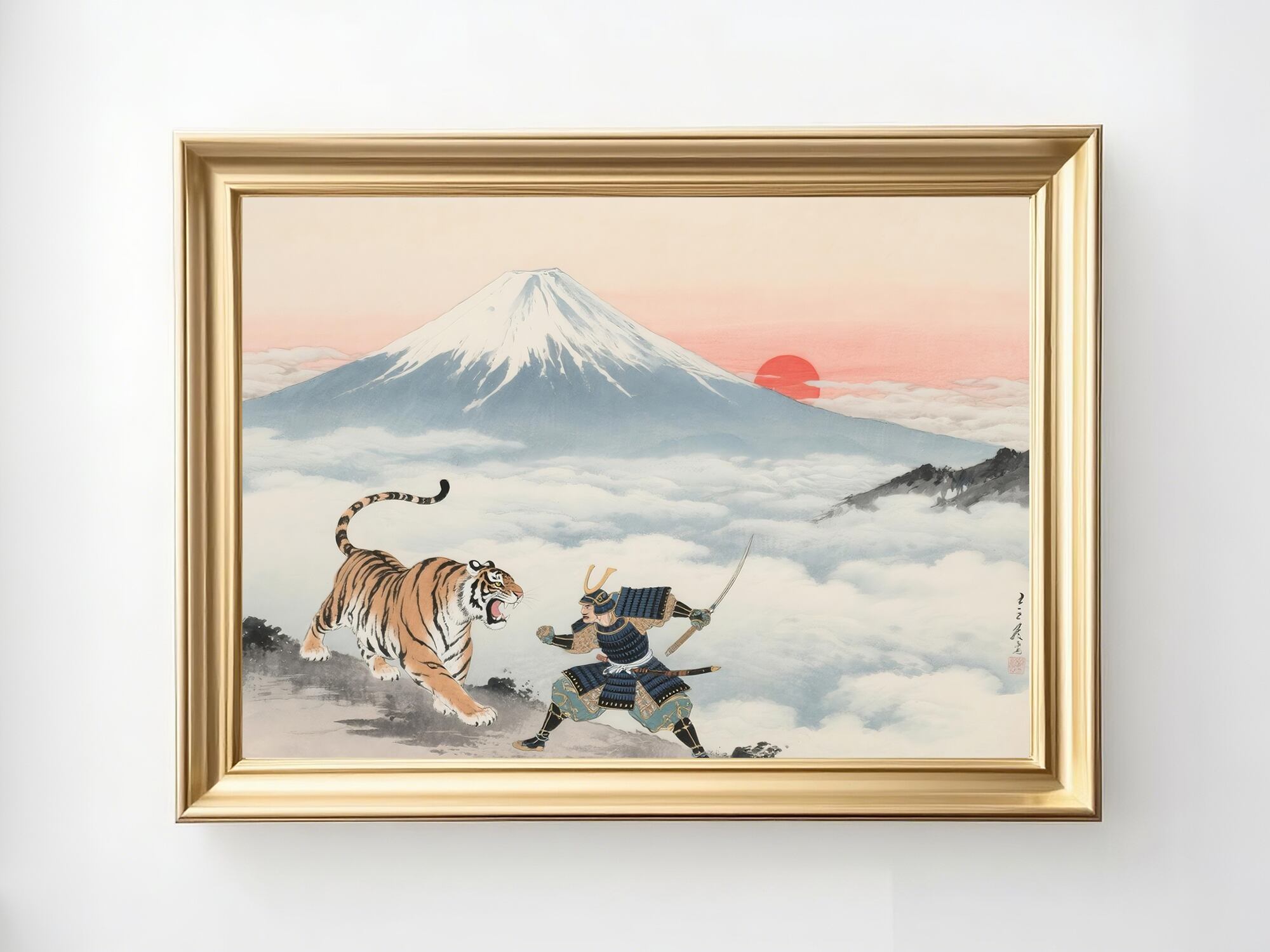 虎は金運と守護、侍は決断と勇気を象徴し、風水的にも繁栄や厄除けの意味を持ちます。日本文化とスピリチュアルな要素を融合させた、空間に活力と精神的強さをもたらす一枚です。