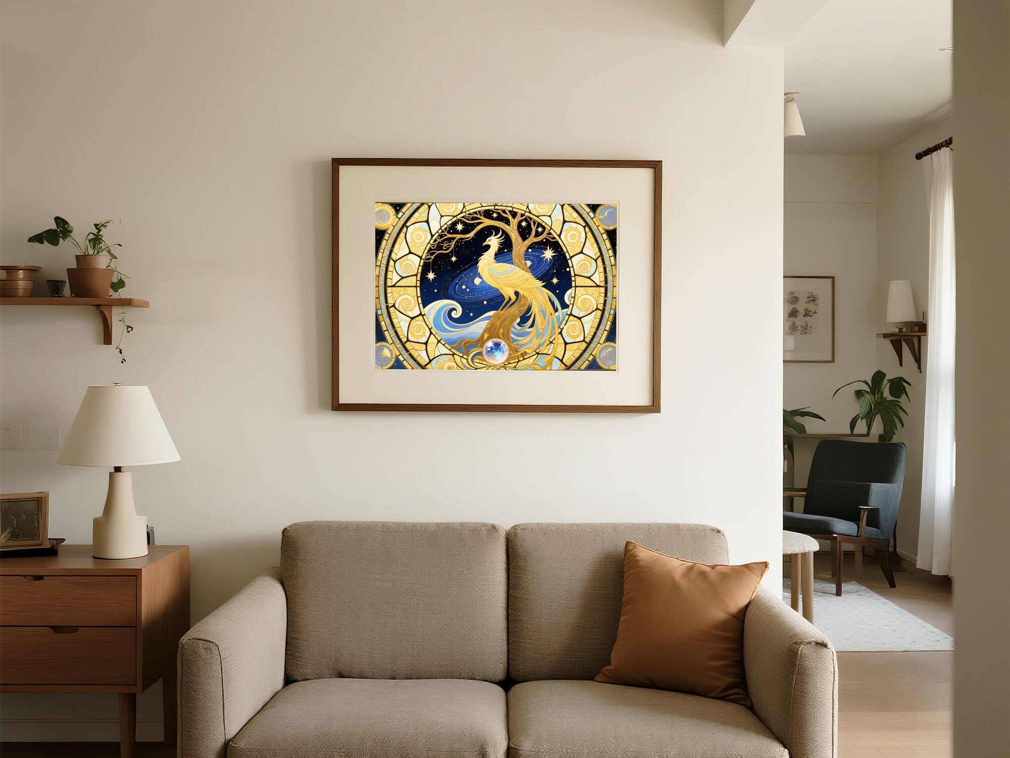星々に包まれた宇宙の中で輝く、黄金の鳳凰のデジタルアートで空間に天の調和をもたらしましょう。