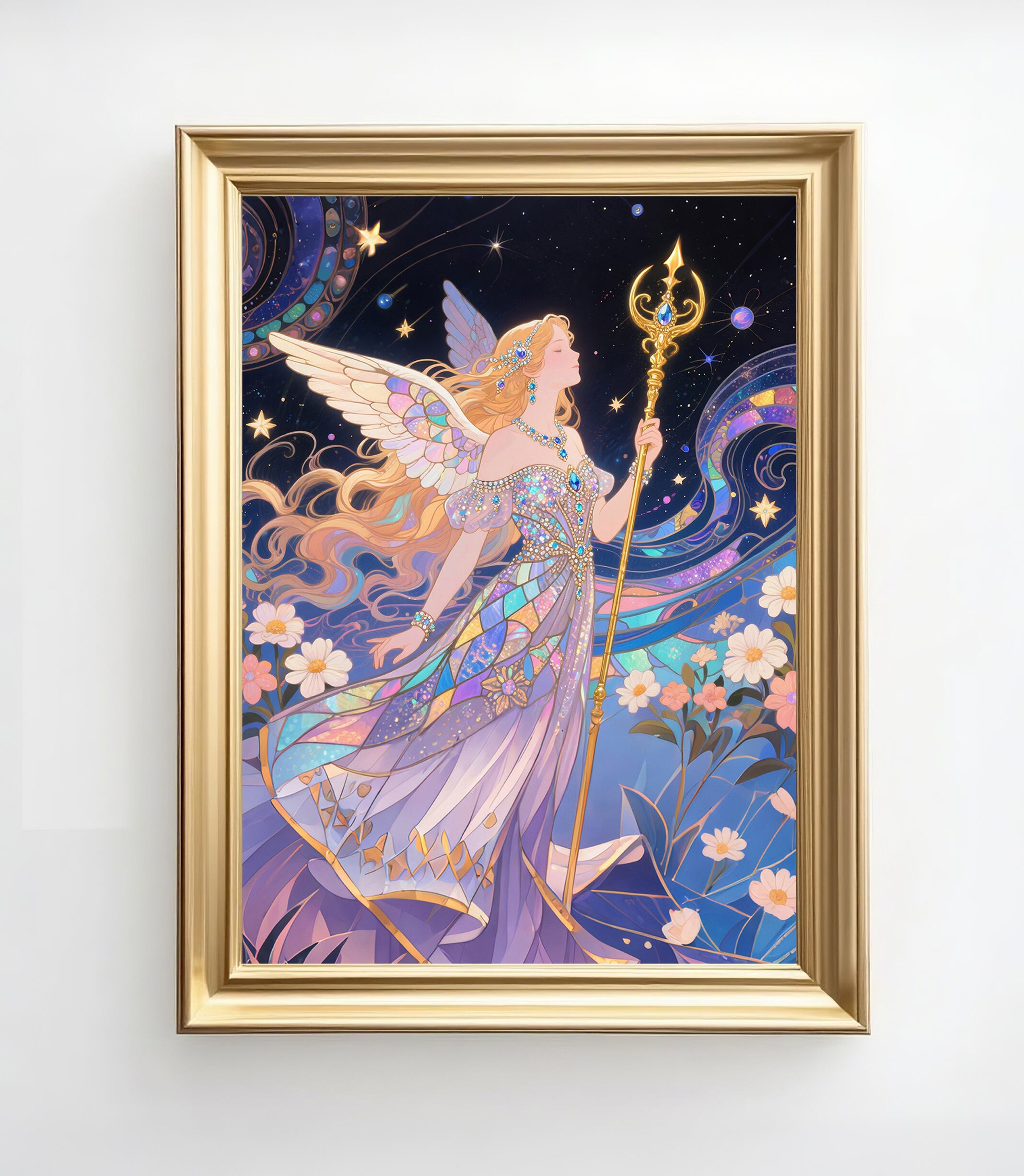 この天使のアートは、風水において非常に縁起がよく、「金運」と「守護」の両面で強力な開運効果をもたらします。特に金色を基調とする天使は「繁栄」と「豊かさ」の象徴であり、家やオフィスに飾ることで、空間全体のエネルギーを高め、持ち主の金運を育ててくれるパワーアートです。