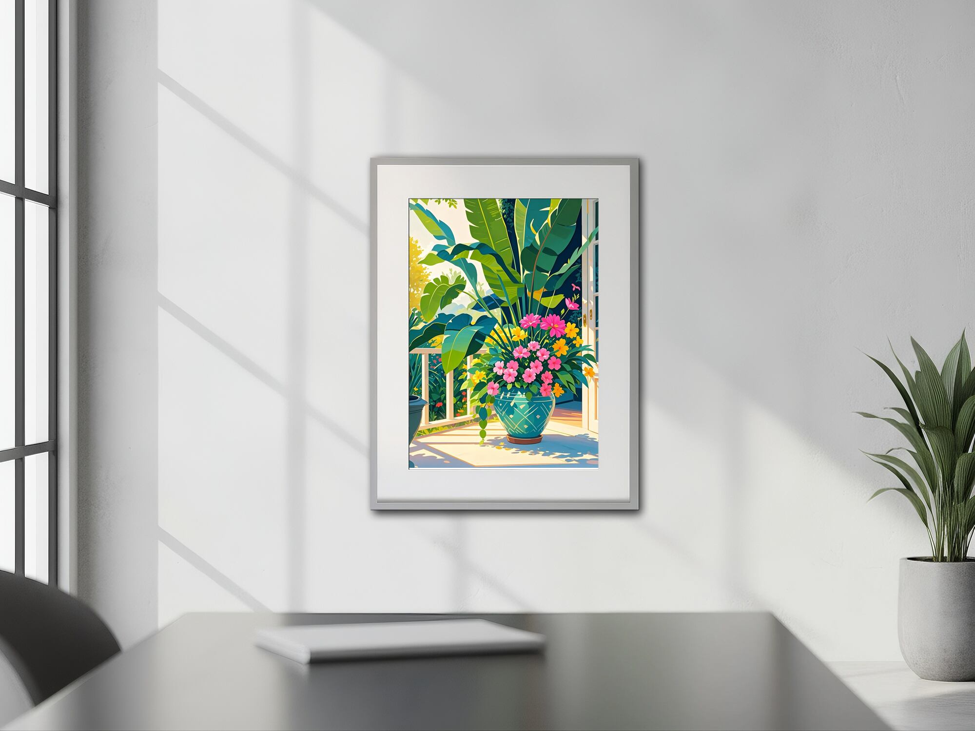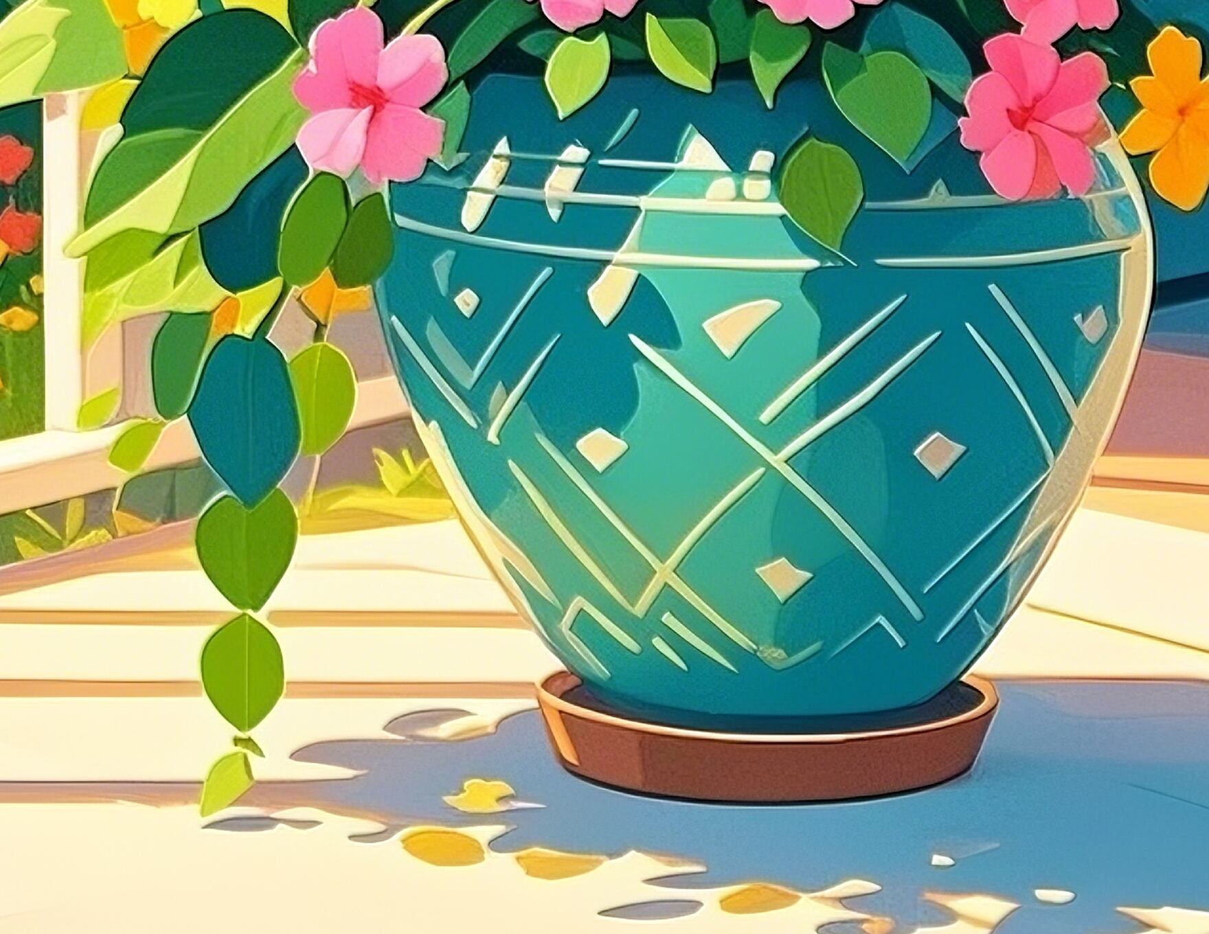 柔らかな朝の光が差し込むバルコニーに、生命力あふれる植物たちが静かに息づく一枚。緑の濃淡と花々の鮮やかな色彩が、空間に心地よいリズムを生み出します。見るたびに気持ちが晴れ、自然と深呼吸したくなるような穏やかなアートです。リビングや玄関に飾ると、日常にやさしい癒しをもたらします。