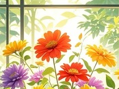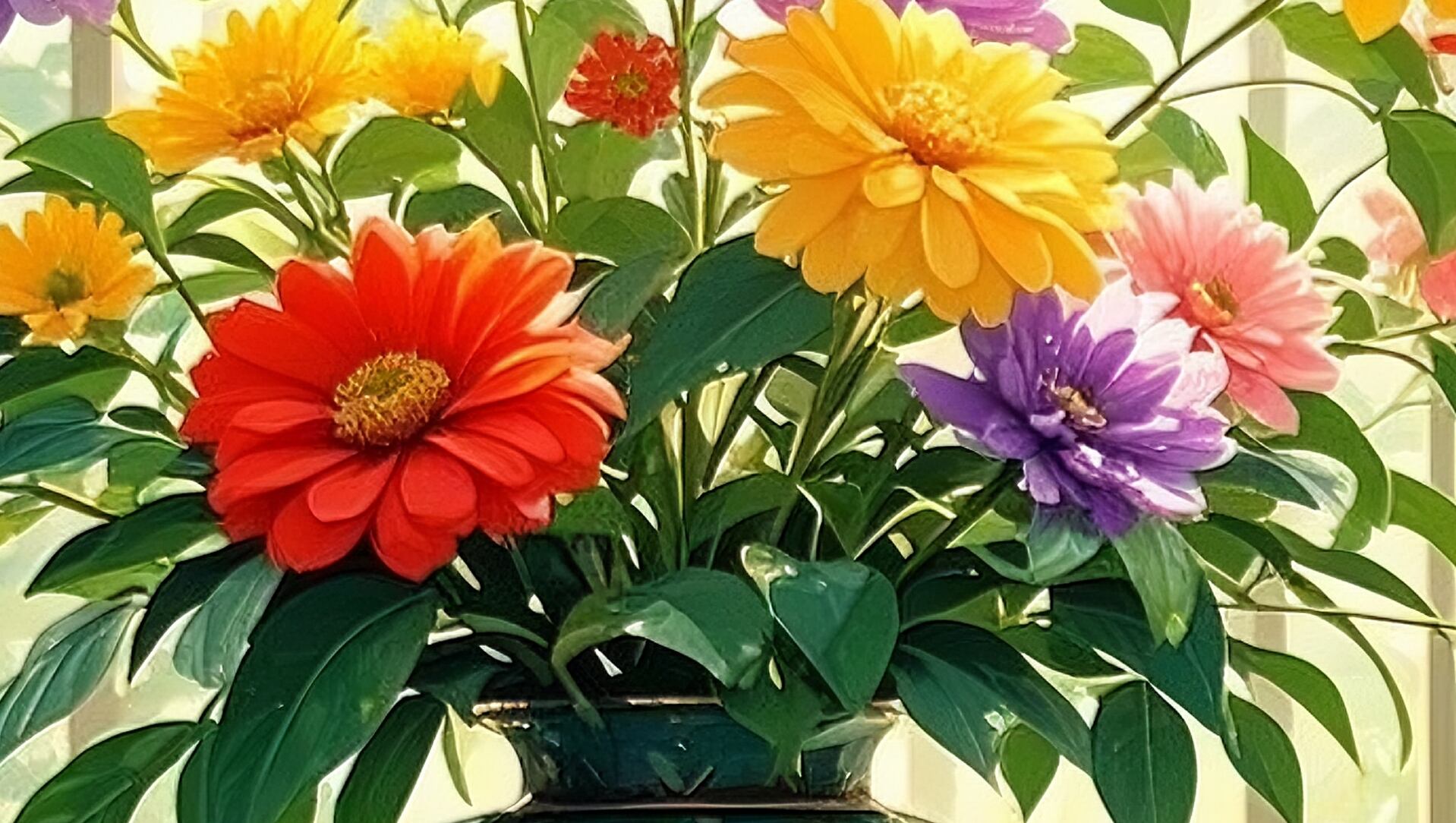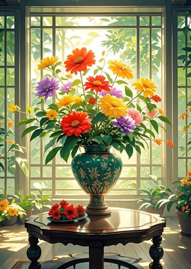 室内の窓辺に置かれた花瓶と色鮮やかな花々を主題にした、光と空気感を重視した写実寄りの装飾画。窓から差し込む柔らかな逆光が花の輪郭を際立たせ、ガラス越しの緑やハイライトが豊かな奥行きを生み出しています。花材の描写は葉の手触りや花弁の厚みまで意識した筆致が見え、陶器の質感やテーブル面の反射まで丁寧に処理されているため、油彩または高級印刷に見合う質感があります。構図は中心に据えた静的安定感があり、クラシカルな室内装飾画として落ち着いた存在感。光の時間帯(朝〜午前)の清澄な空気感がインテリアプリントとして非常に好ましい出来です。