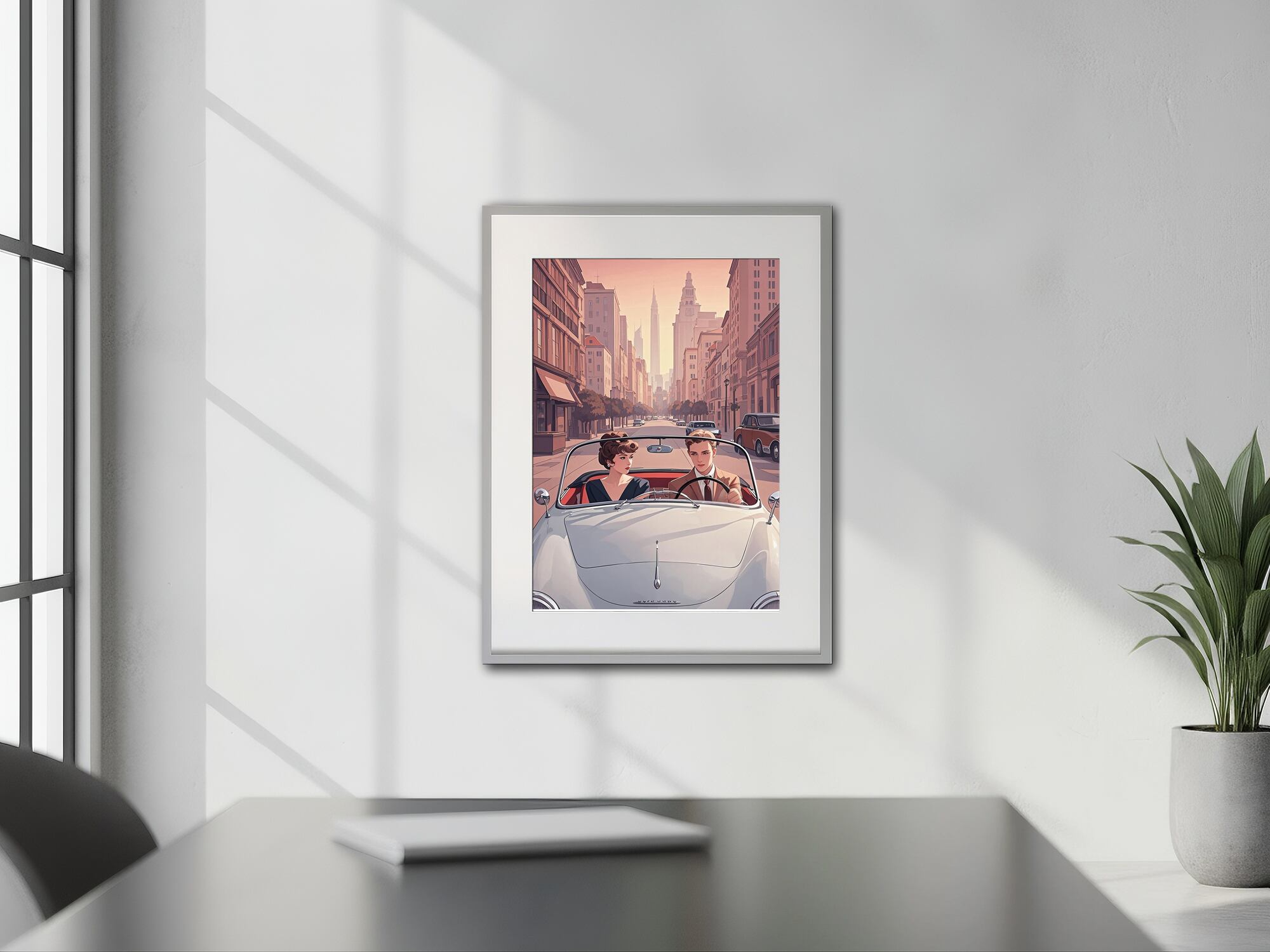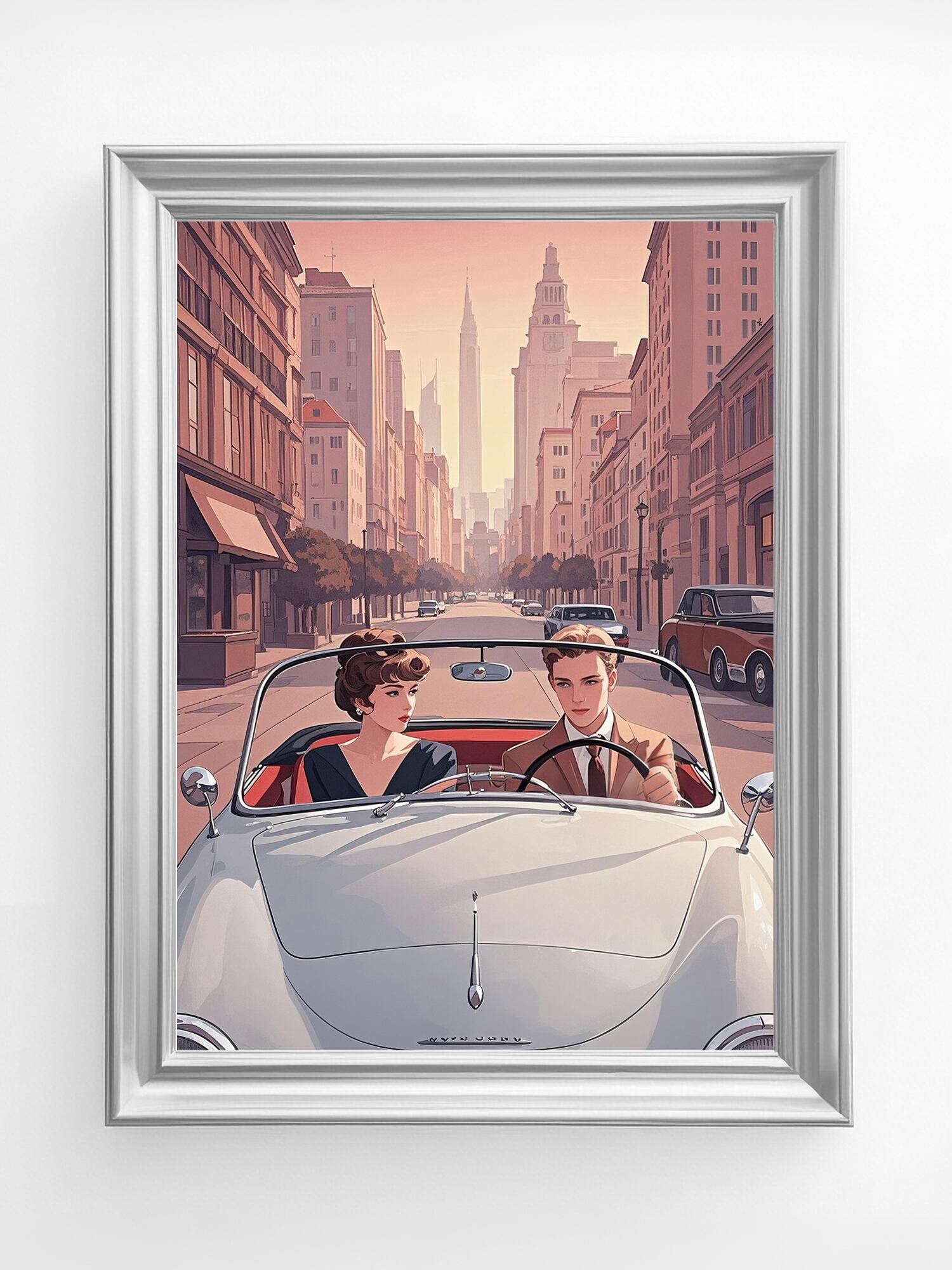 淡いピンクと夕光に染まる都市が遠くまで続き、一本の大通りが静かに地平線へと導いている。白いオープンカーに乗る二人のあいだには言葉以上の空気が流れ、街の喧騒が遠ざかる中で、わずかな緊張と静けさが共存している。やわらかな光は映画のワンカットのように車体を包み、ボディに映る反射は過ぎ去った時間の記憶のように淡く揺れる。整然とした建築と穏やかな空の対比が、心の奥の静かなざわめきを際立たせ、物語は語られぬまま余韻として残る。華やかさよりも内面の機微を描いた、詩的で成熟した情景である。