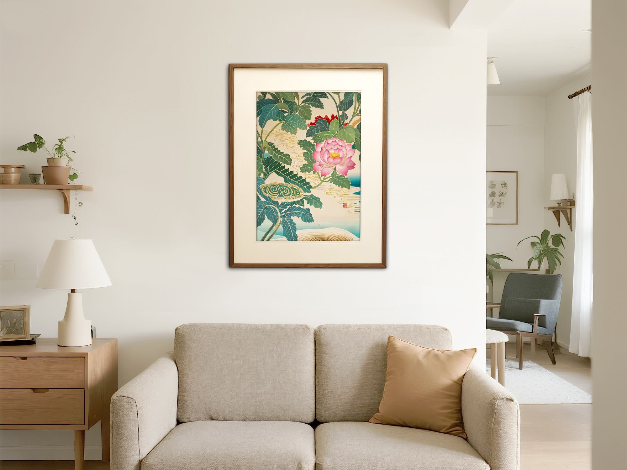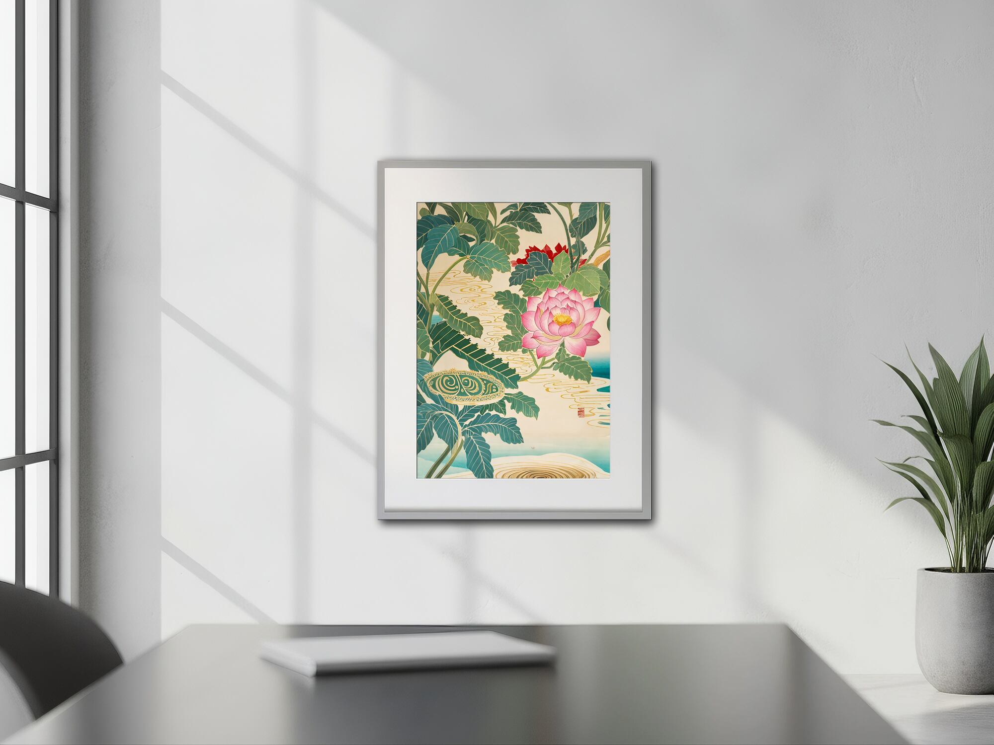 凛と咲く蓮と、水面に広がる金のさざ波。日本画を思わせる構図と余白の美が調和し、静けさと気品を兼ね備えた一枚です。落ち着いた緑青と淡い生成りの色調が、心を静め、空間に穏やかな高貴さを添えます。和室やモダンインテリアにも馴染む、伝統と現代が融け合うデジタルアートです。