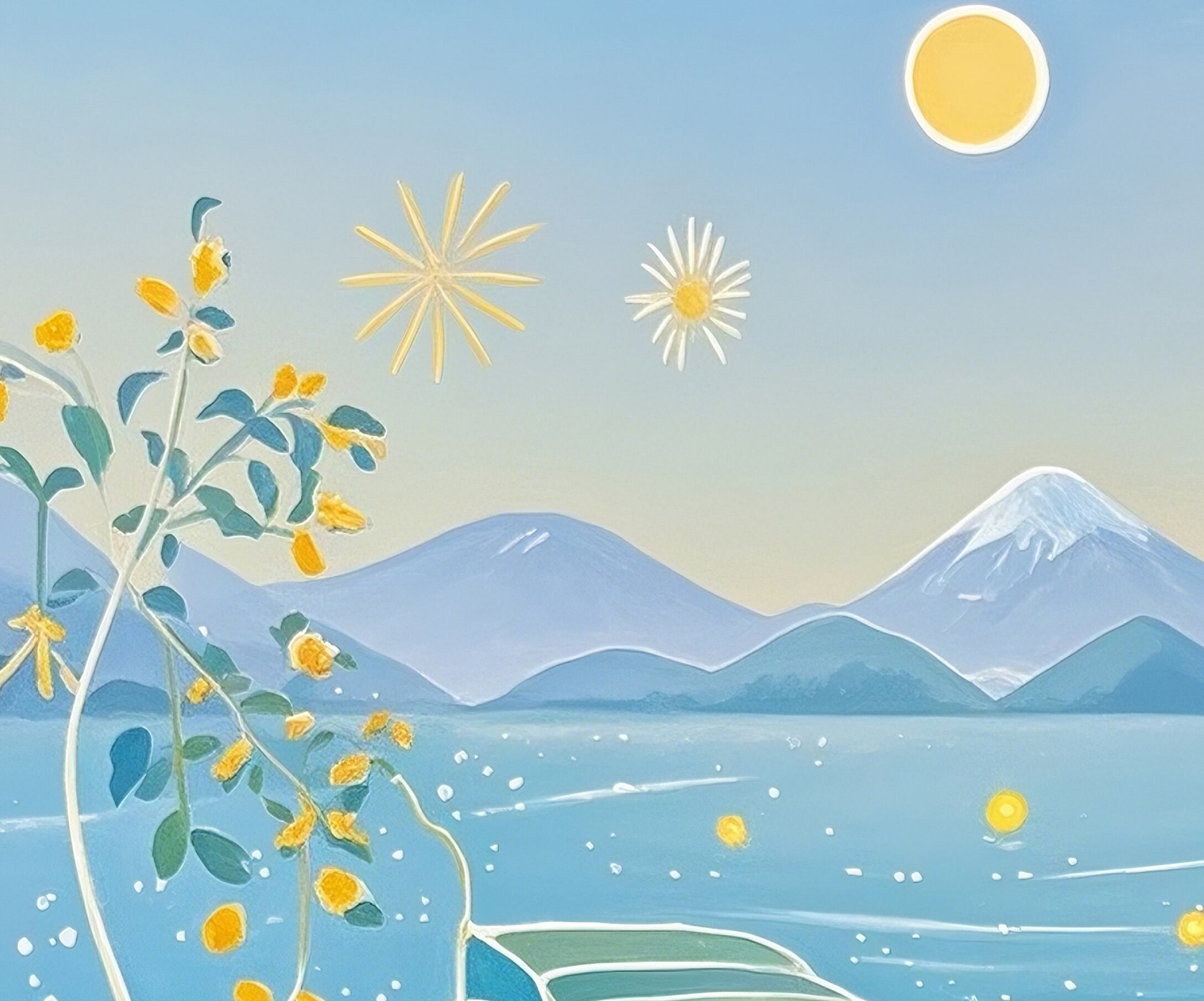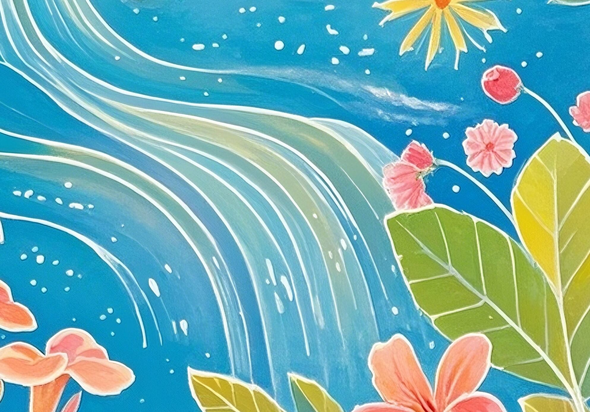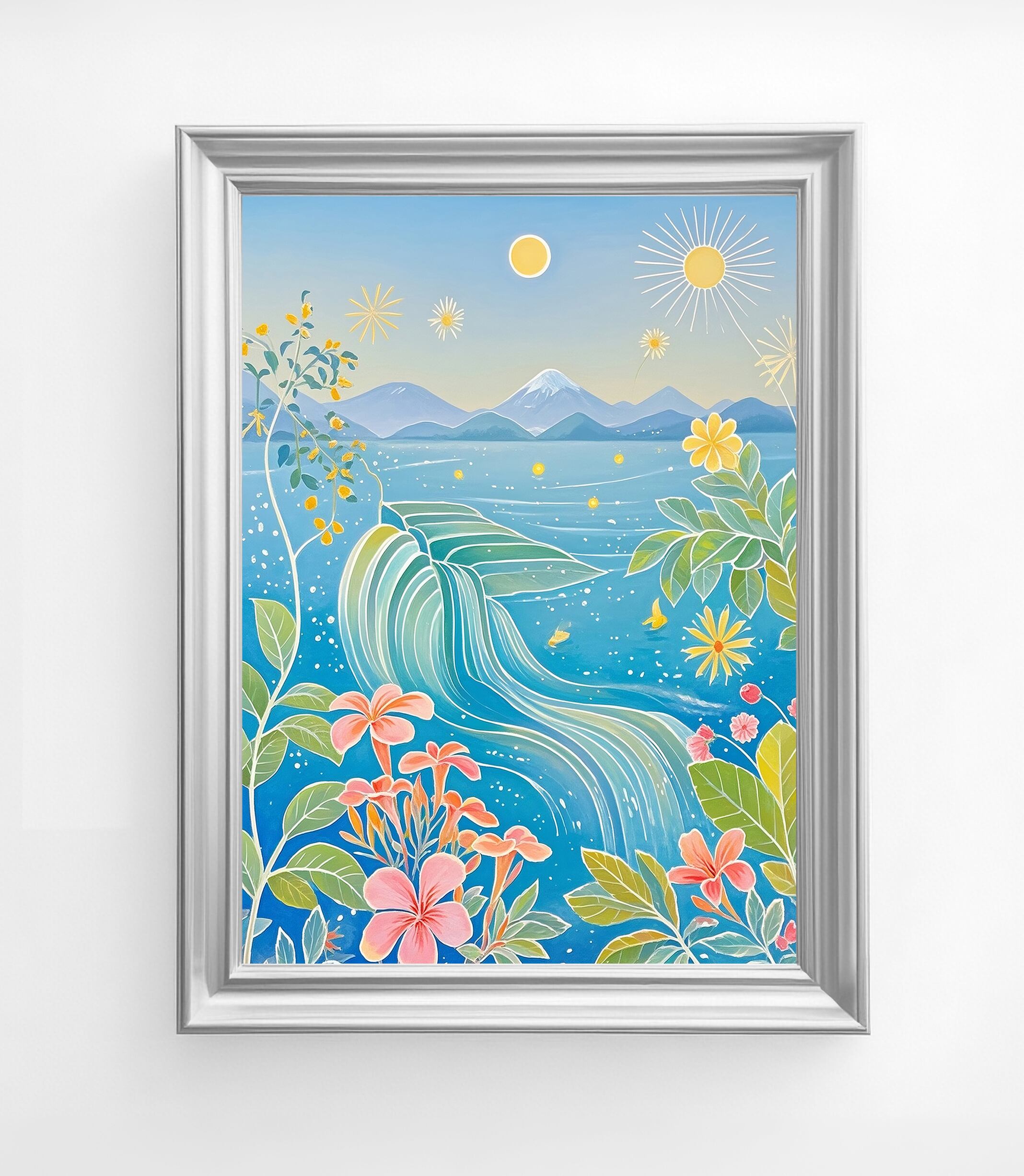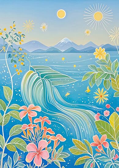 透き通る青に包まれた海と空。波の流線、星のような光、咲き誇る花々が調和し、どこまでも続く夢の景色を描きます。眺めるほどに心が澄み渡り、創造力が広がるような幻想的な一枚。ワークスペースや寝室など、静かな時間を過ごす場所にぴったりのデジタルアートです。