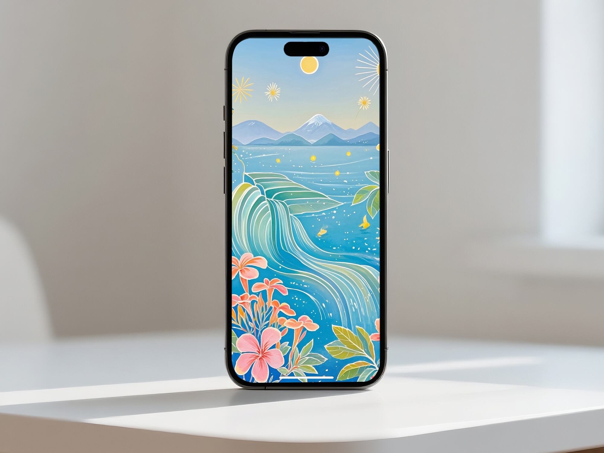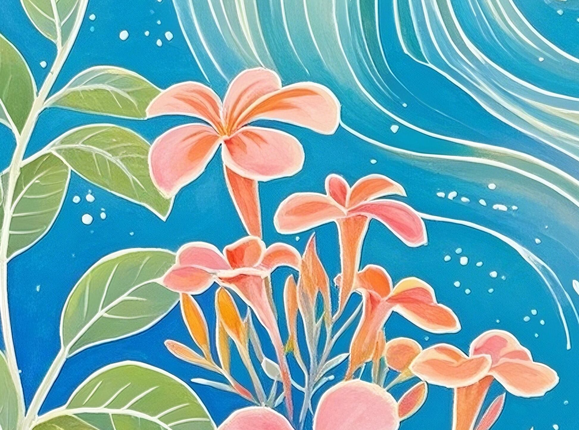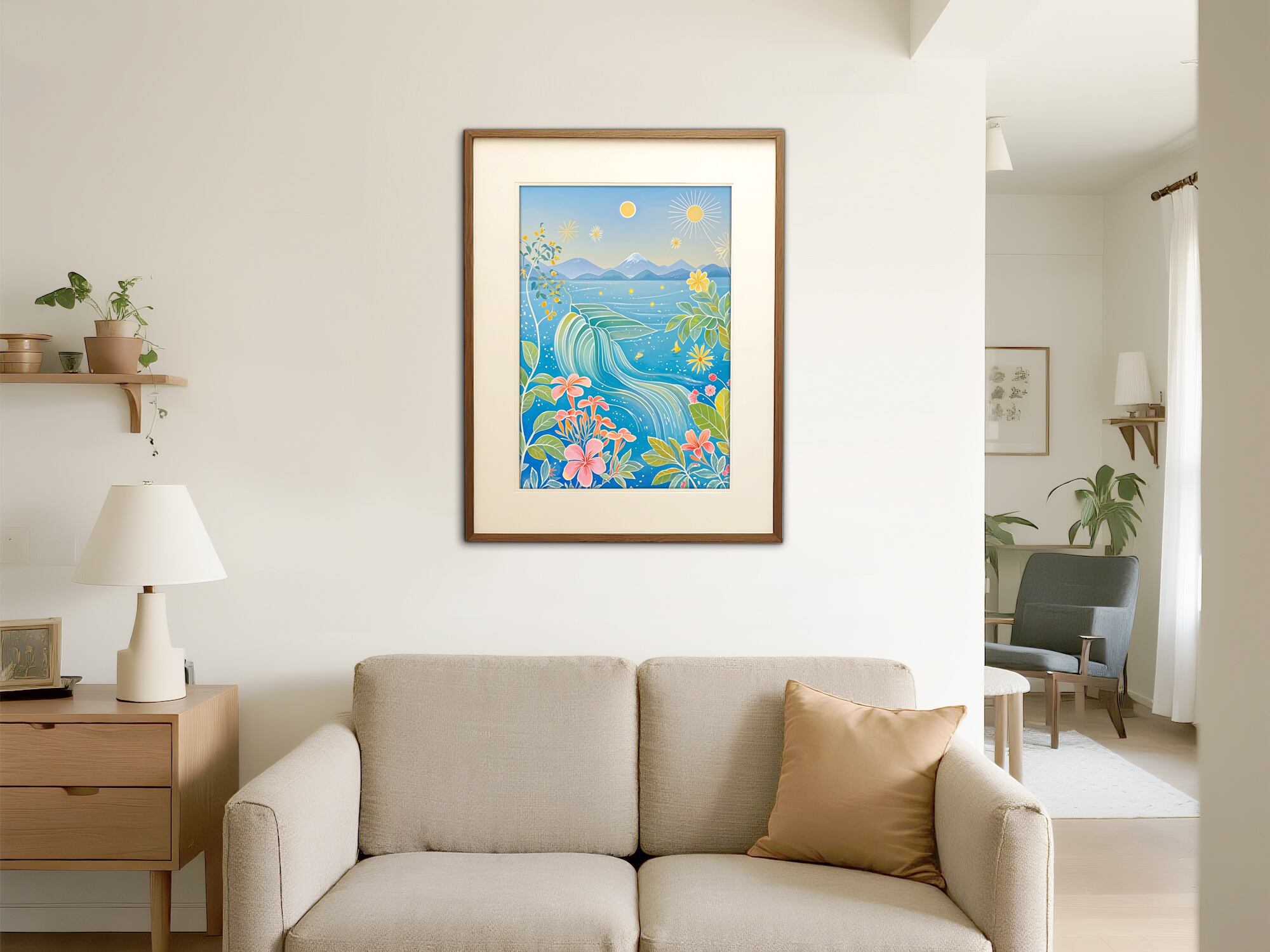 透き通る青に包まれた海と空。波の流線、星のような光、咲き誇る花々が調和し、どこまでも続く夢の景色を描きます。眺めるほどに心が澄み渡り、創造力が広がるような幻想的な一枚。ワークスペースや寝室など、静かな時間を過ごす場所にぴったりのデジタルアートです。