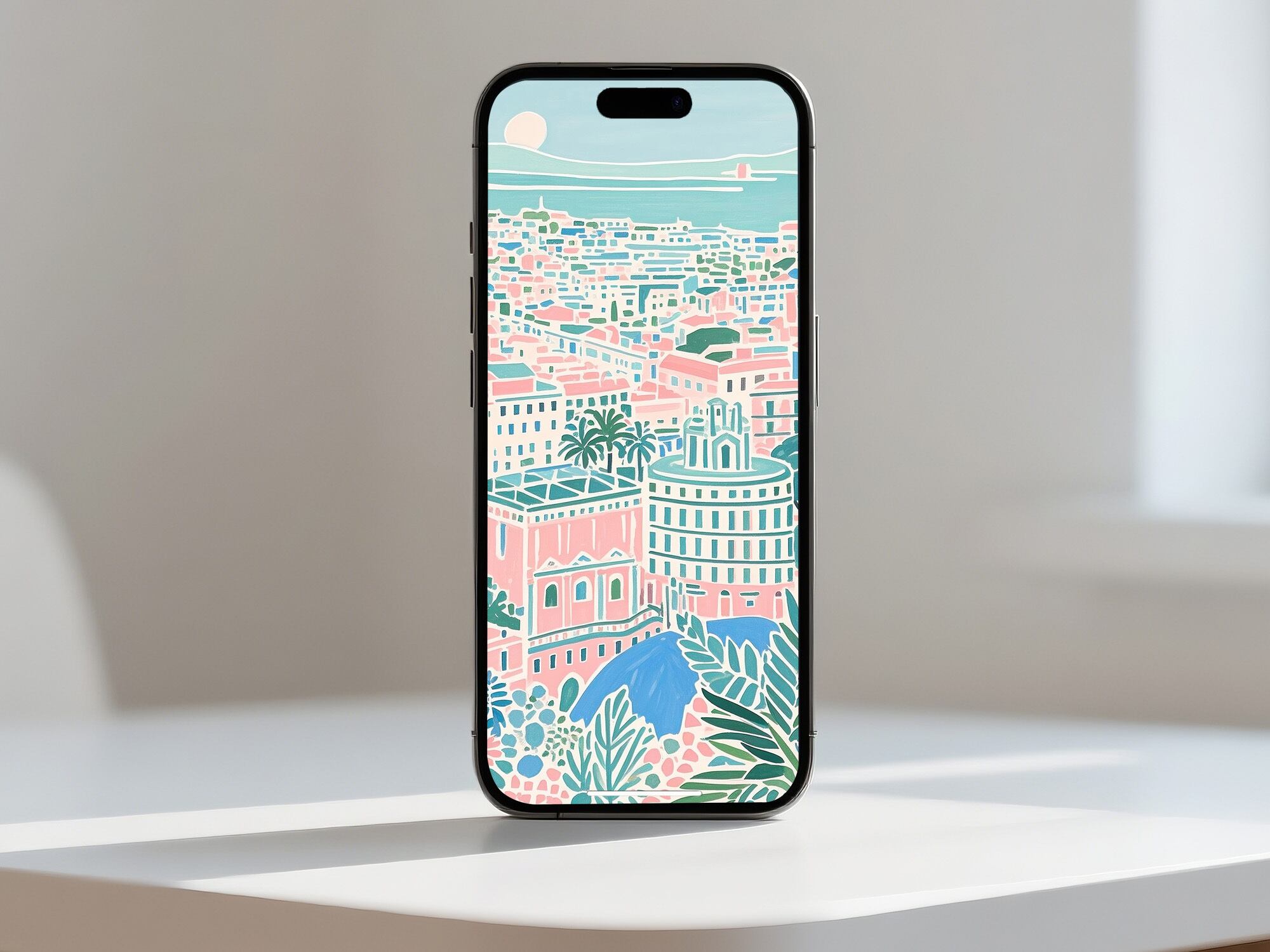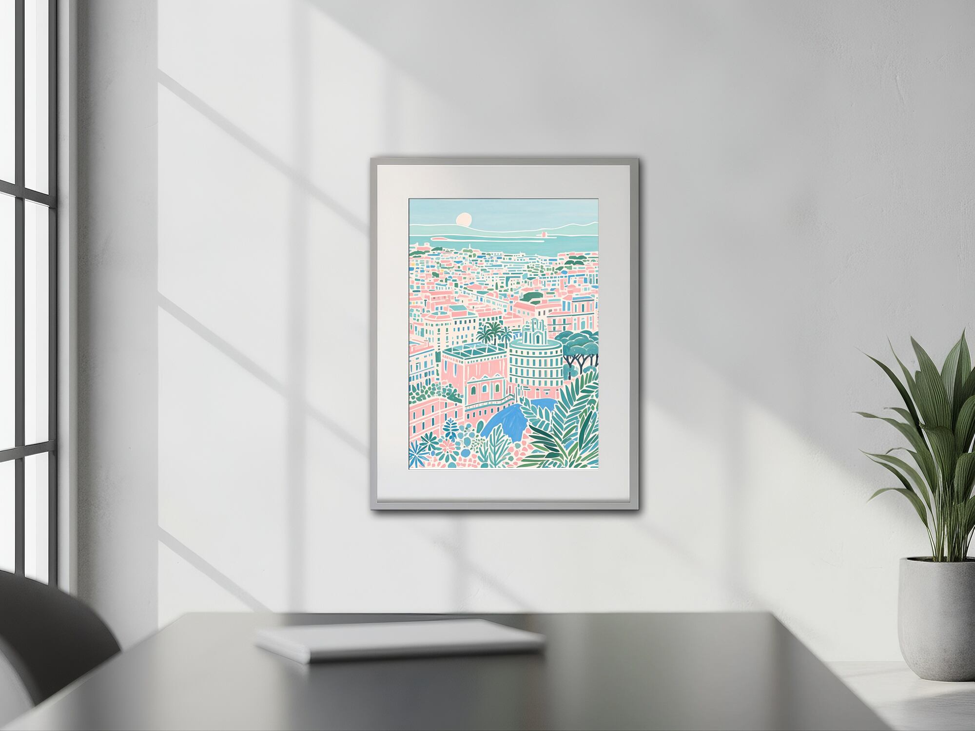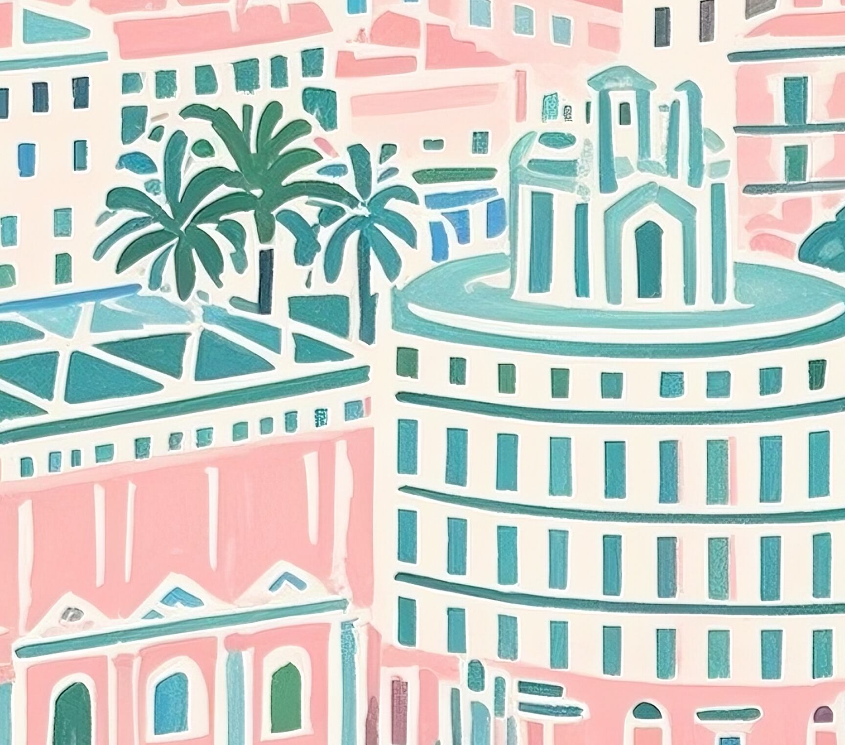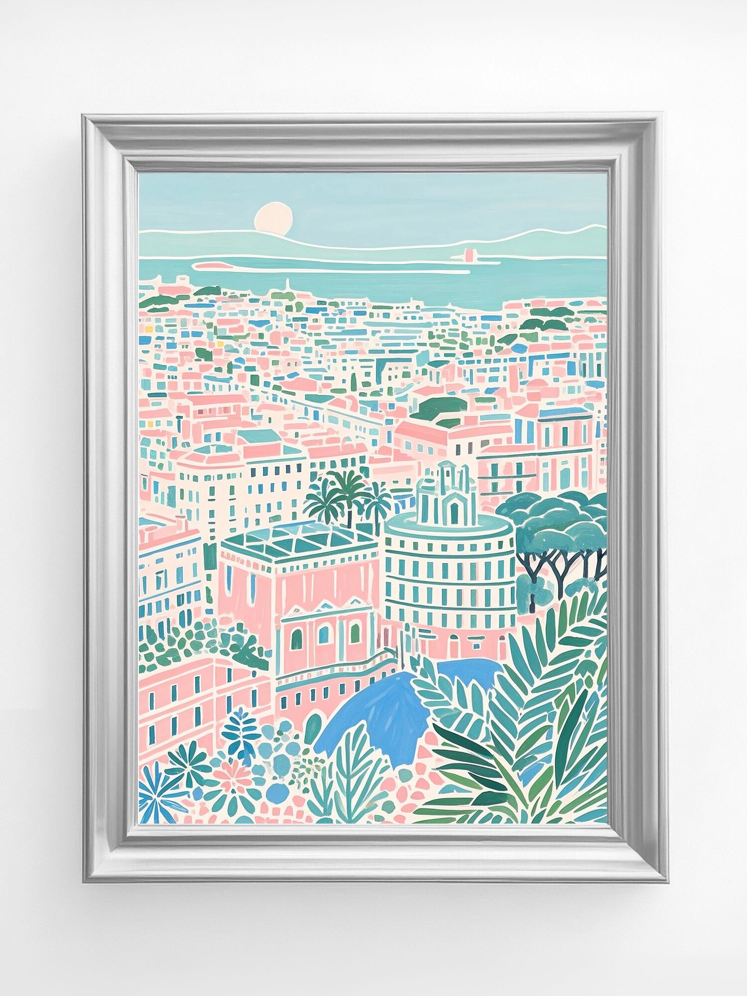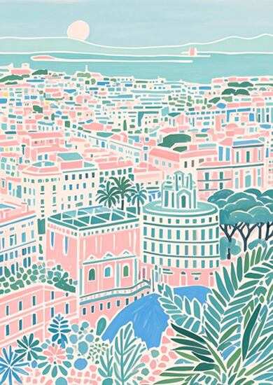 この作品は、地中海沿岸の都市描いた明るく穏やかな色彩が特徴です。全体にパステルトーンが用いられ、ピンク、ミントグリーン、アクアブルーなどの柔らかな配色が調和し、陽光を受けた街並みの心地よさを表現しています。構図は上方からの俯瞰視点で、奥行き感がありながらも、細部を簡略化して統一感を維持しています。葉のモチーフが前景に配置され、遠景の海や太陽と呼応するように都市の穏やかさを強調。ロマンチックで静穏な雰囲気が強く、リビングやサロンに飾るのに最適な癒し系アートといえます。