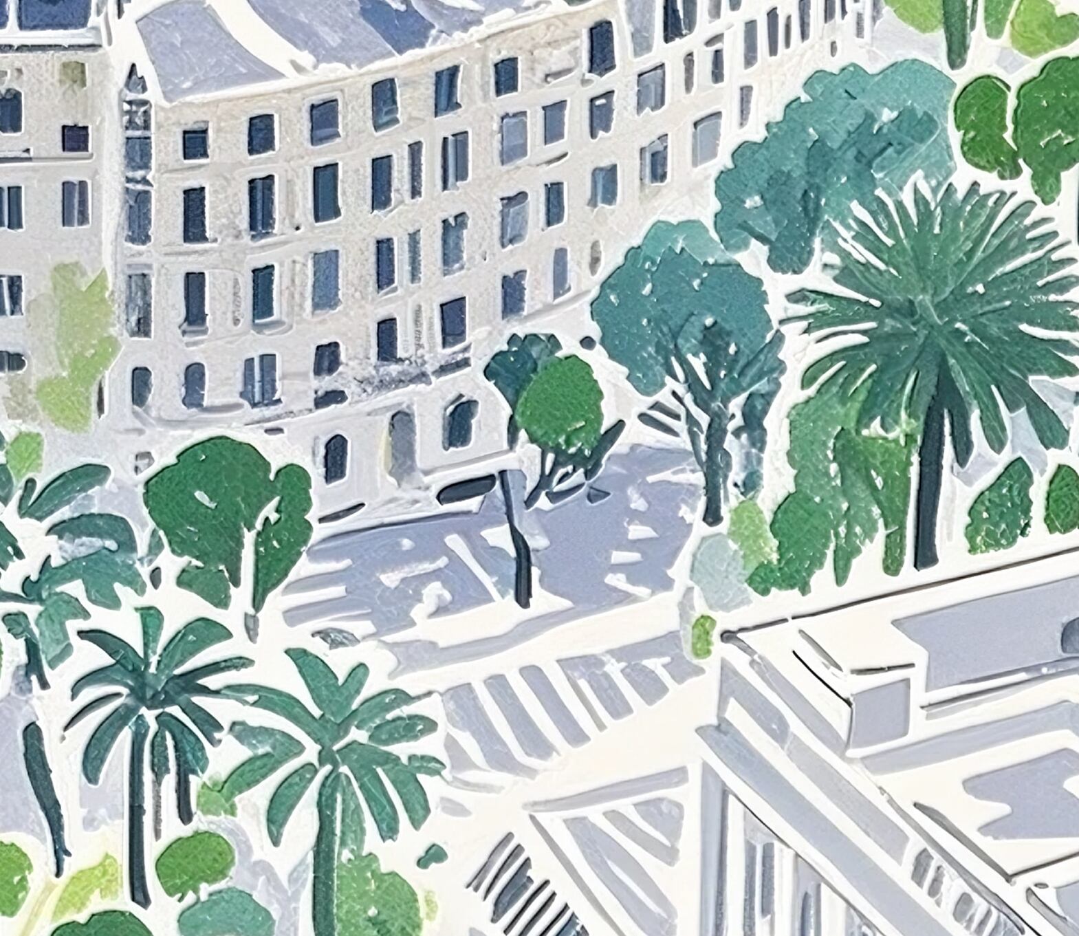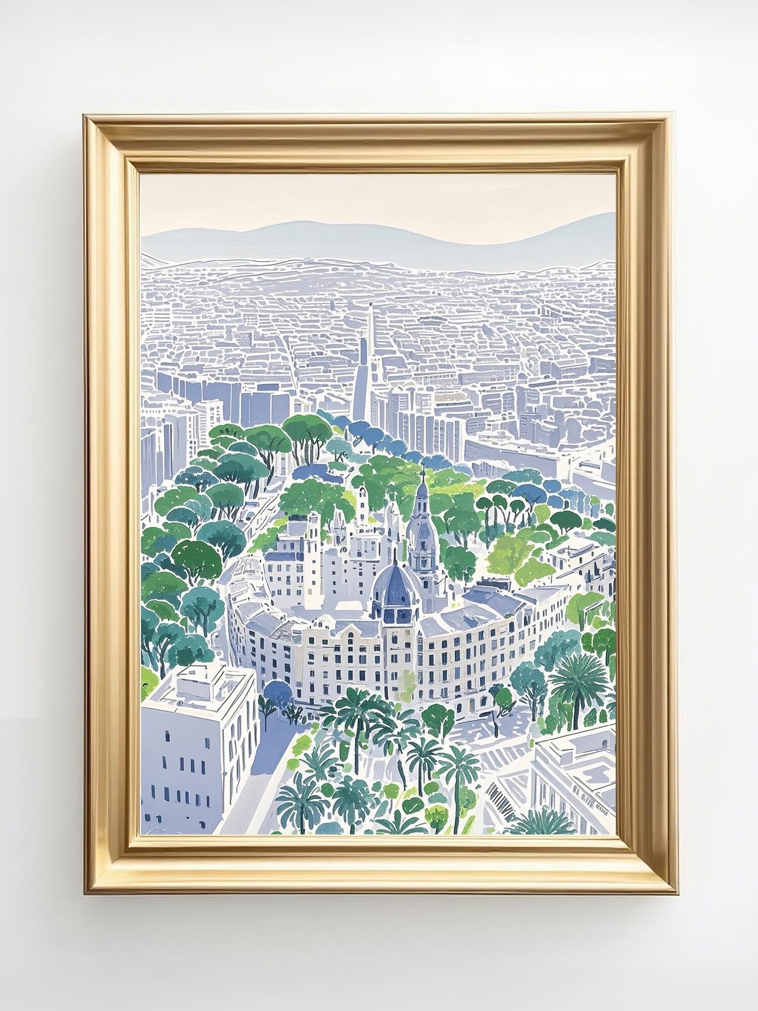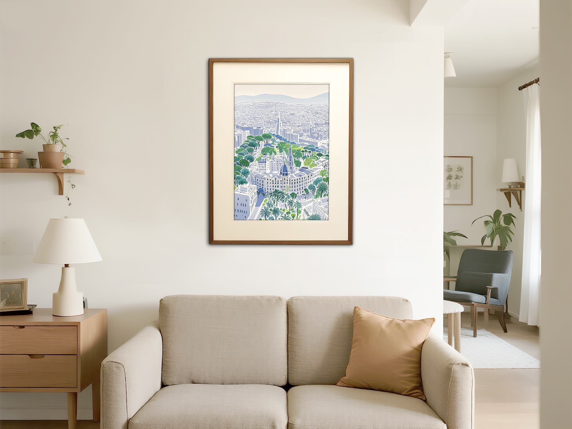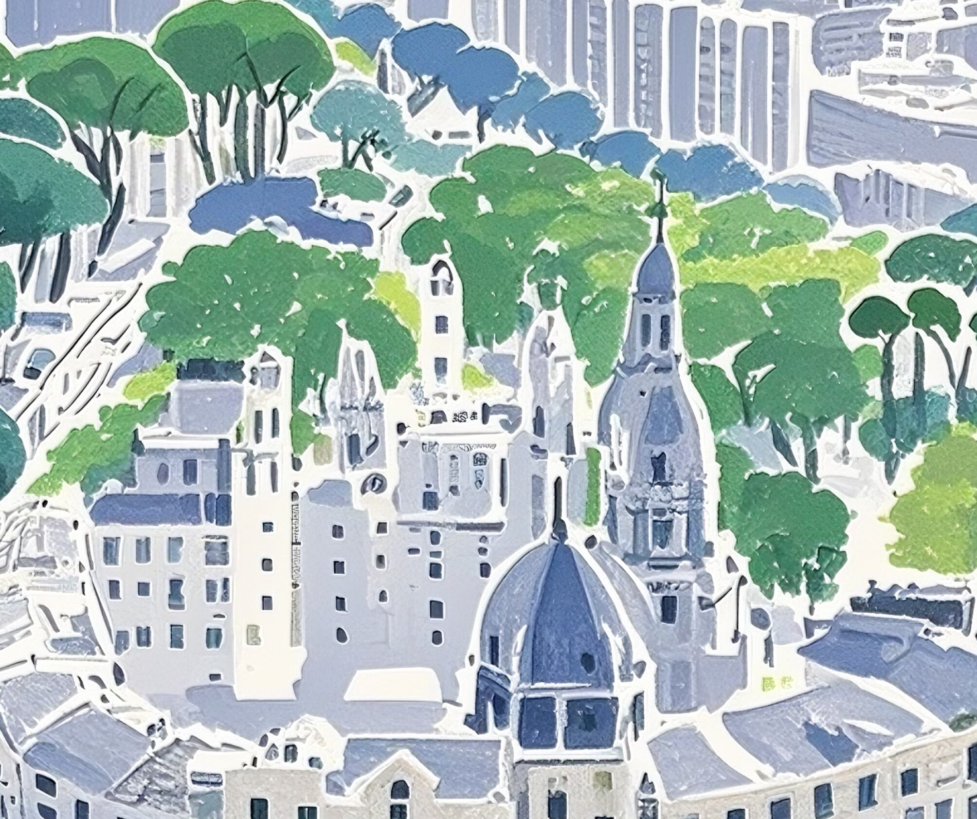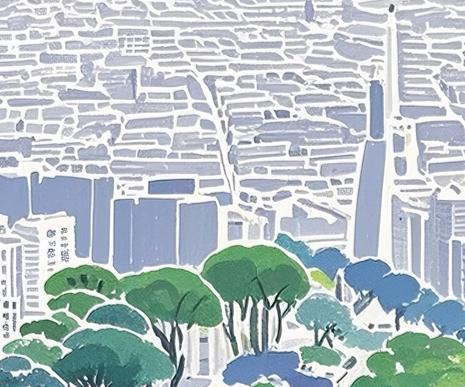 この作品は構図が非常に秀逸で、都市の広がりと中央の公園エリアのコントラストが美しく表現されています。クールトーン(ブルーとグリーン)を主体とし、落ち着きと知的な印象を与えます。建物のディテールは繊細ながら整理され、遠景の霞む山々と都市のリズムが調和しています。俯瞰構図ながら、奥の空間がゆるやかに広がり、開放感と静けさを両立。アートとして完成度が高く、都会の中の緑の象徴的表現としても秀でています。