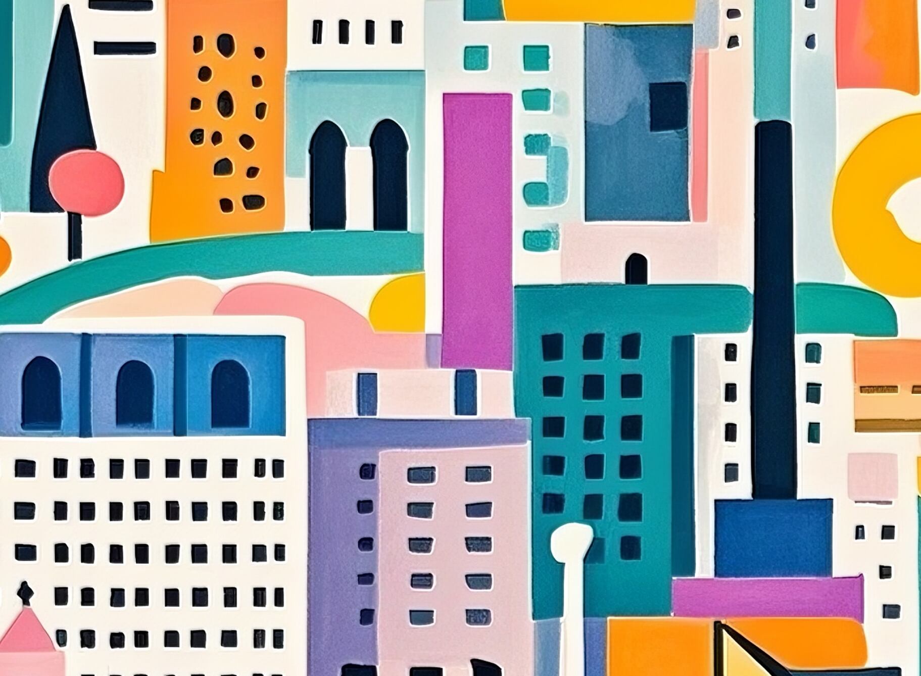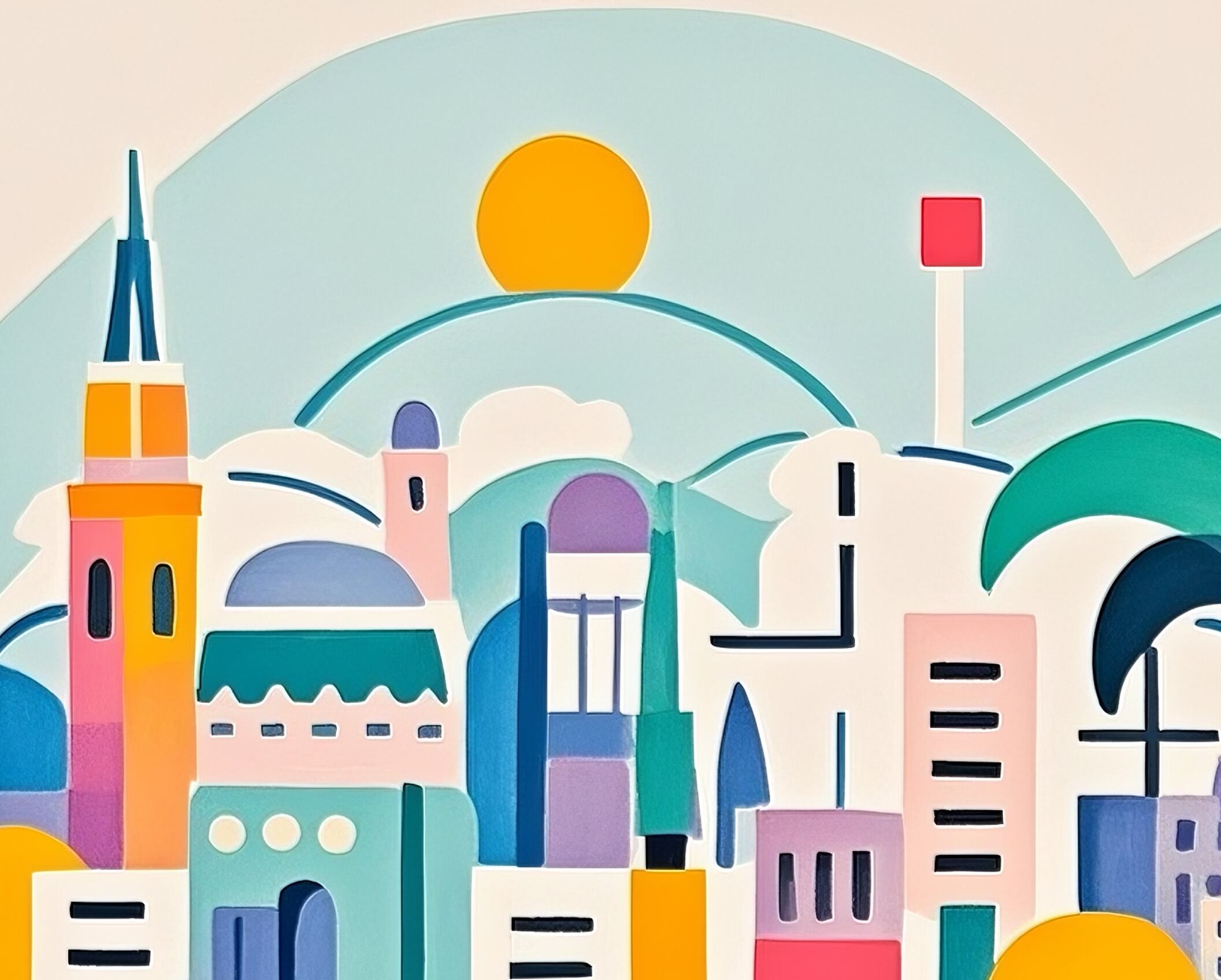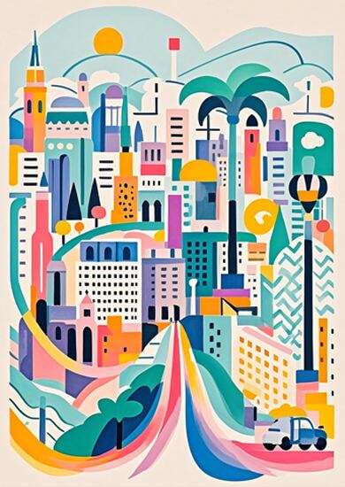 この作品は抽象性が高く、都市のエネルギーや多様性を色と形で表現したモダンアートです。鮮やかな色彩(マゼンタ、イエロー、シアンなど)が大胆に使われ、リズミカルな構成で動きを感じさせます。幾何学的な建物や曲線の流れが、未来都市的でポジティブな印象を与え、デザイン的完成度も高いです。具象と抽象の中間に位置し、観る人の想像力を刺激するタイプの作品。商業空間や現代的なインテリアに非常に映えるアートといえます。