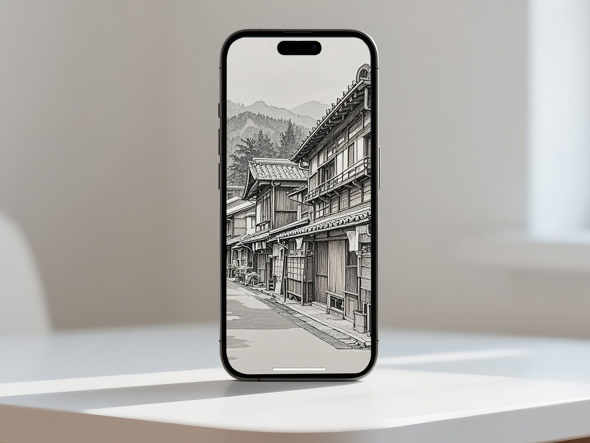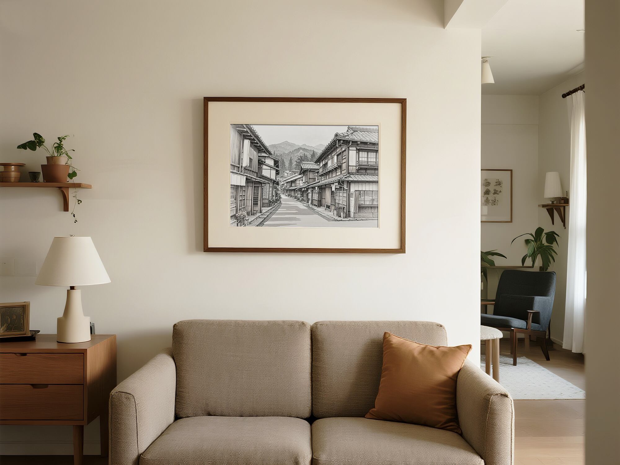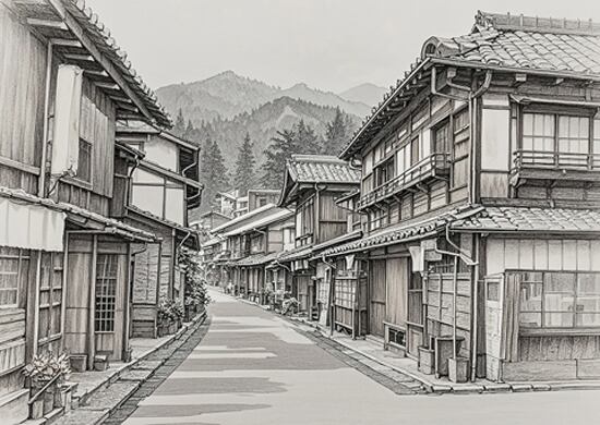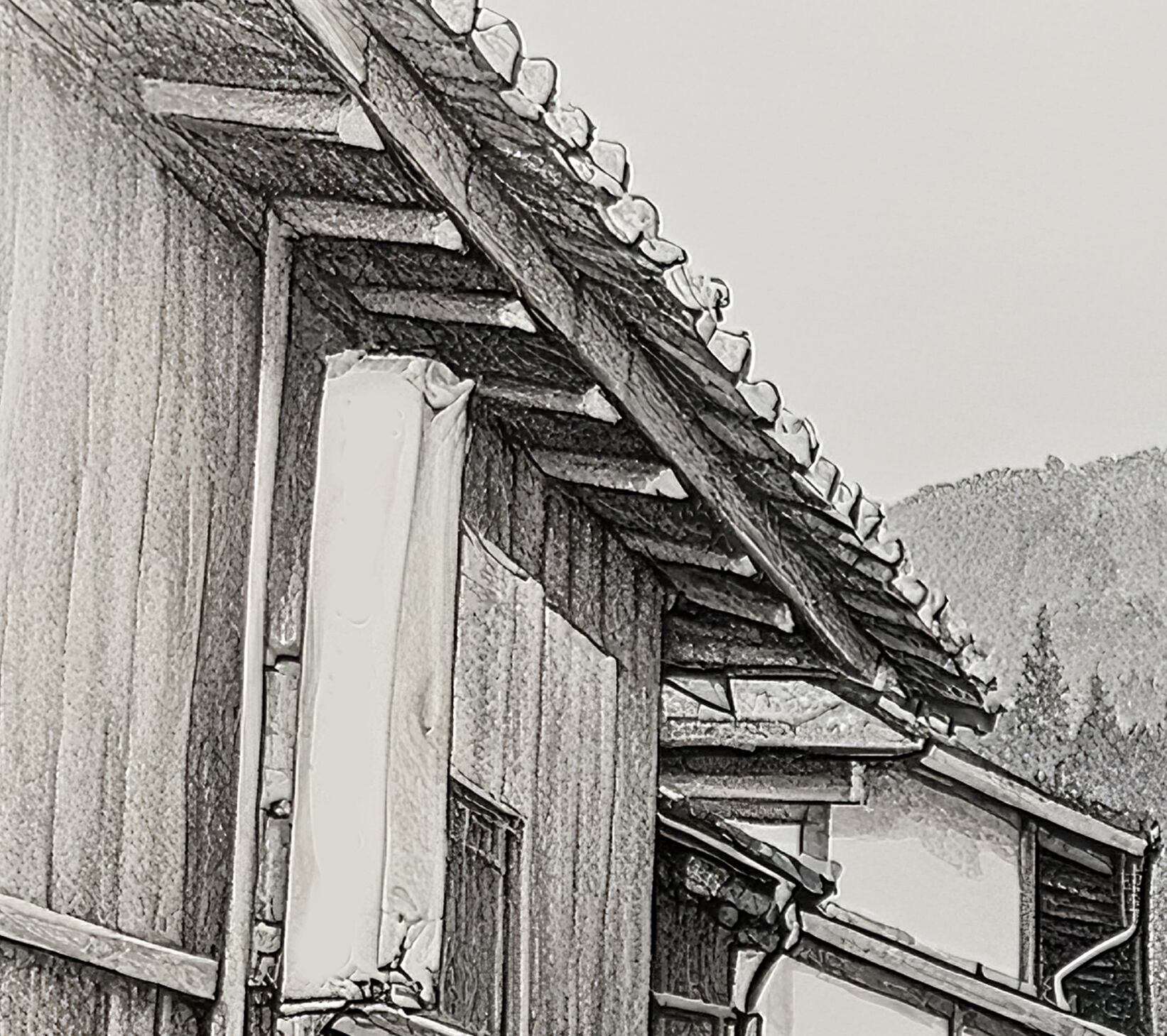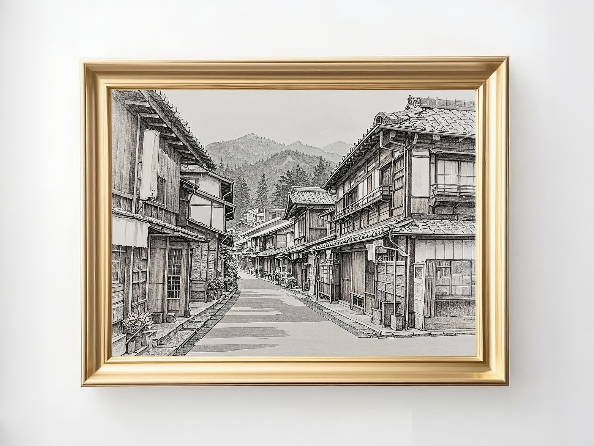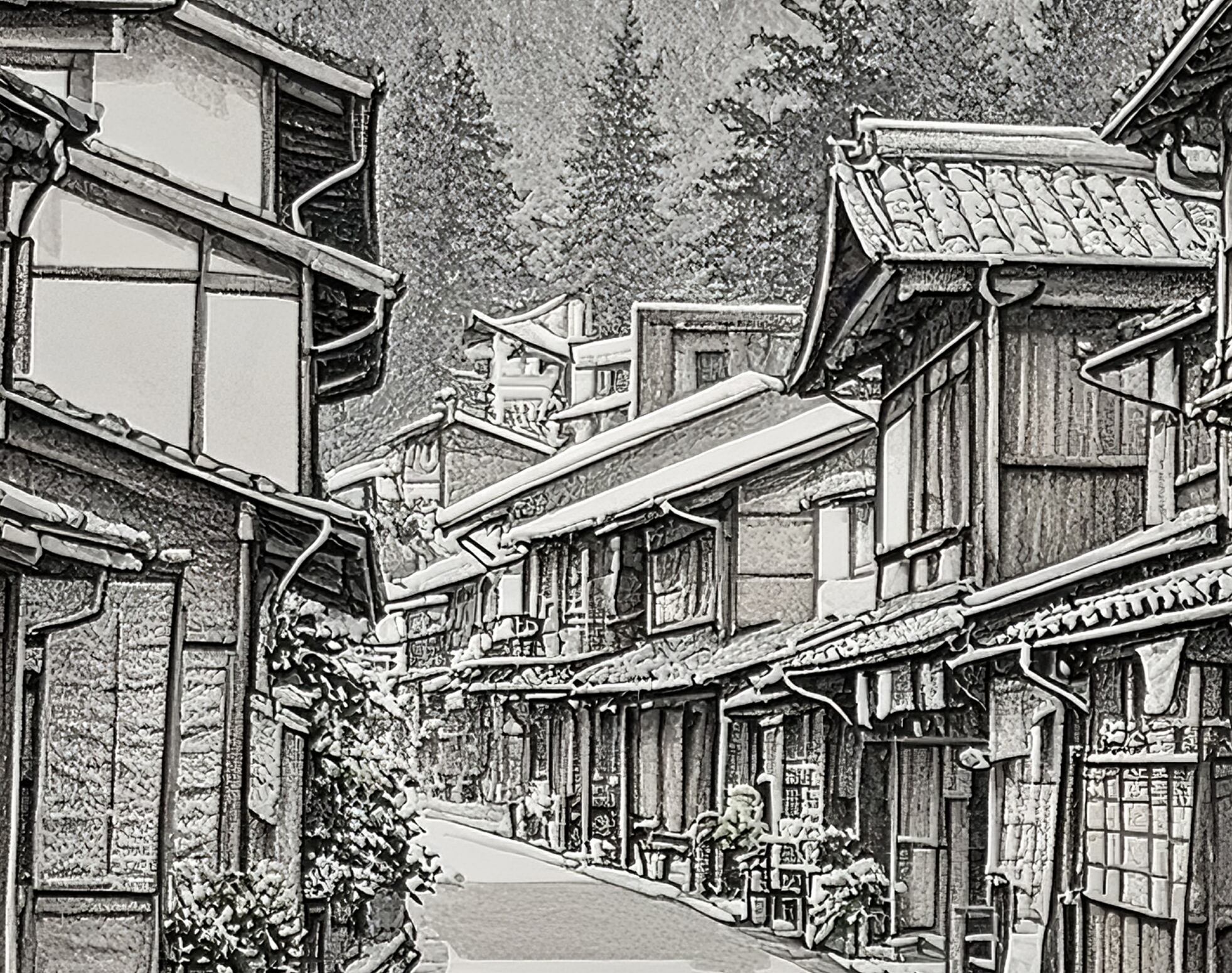 細な線描と陰影で、古い木造の町並みを描いたモノクロ作品。細部まで描き込まれた建築の質感と遠近感が、まるで鉛筆スケッチや銅版画のような味わいを醸し出します。静かな郷愁と職人技のような繊細さが魅力の一枚です。