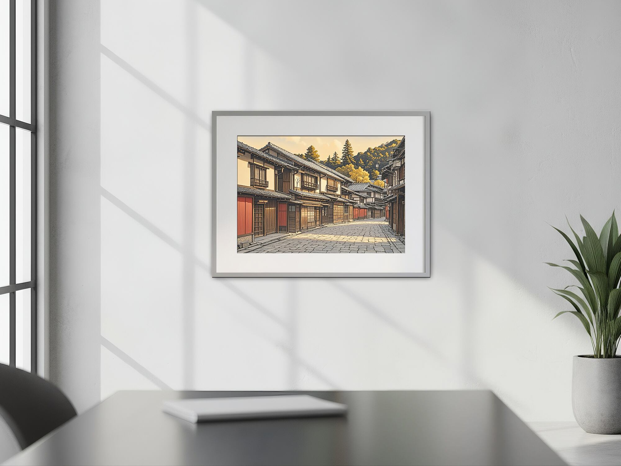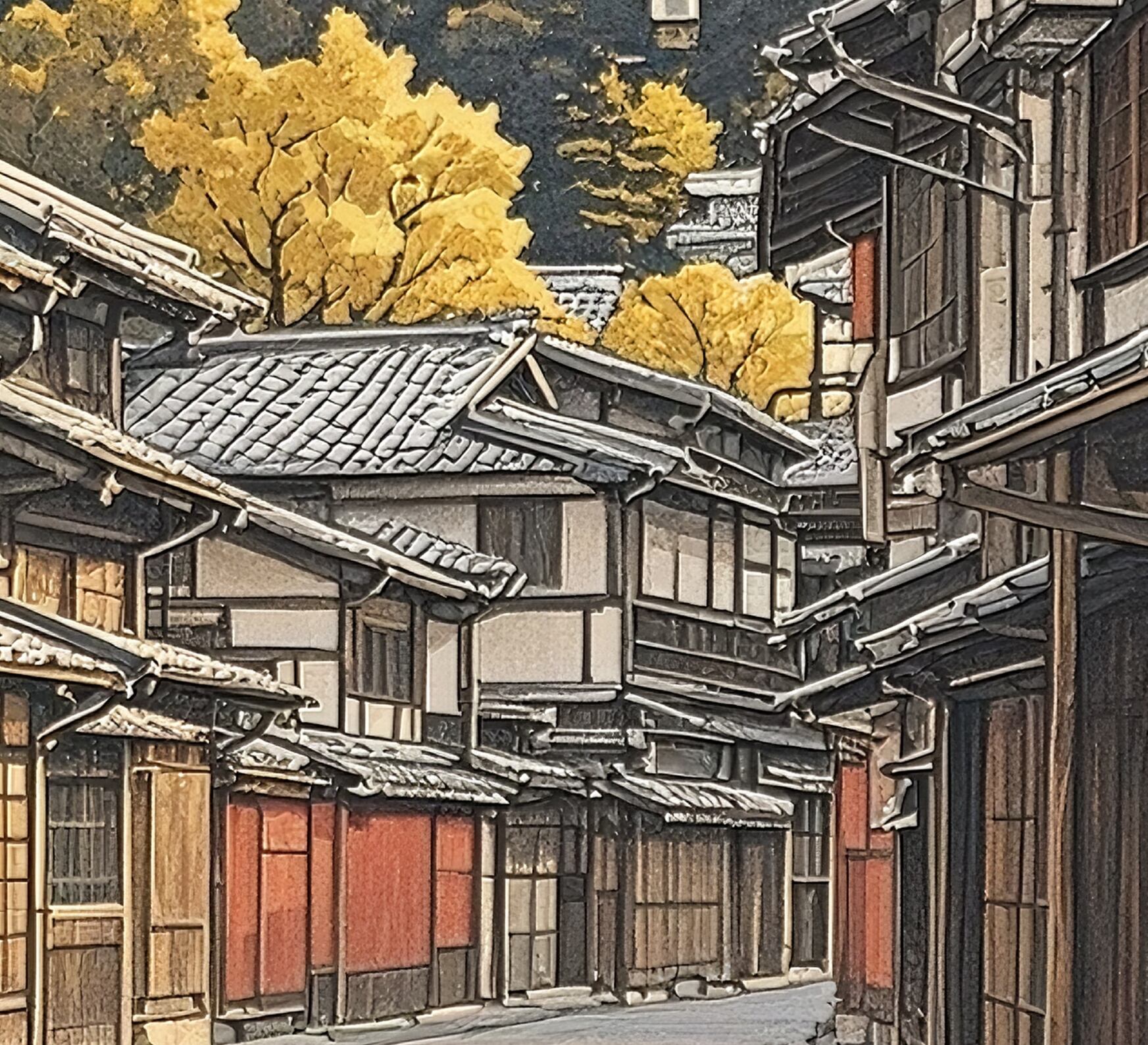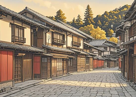 石畳の路地に差し込む午後の光、木造の家々が並ぶ穏やかな古都の街並み。時を超えて残る建築の温もりと、暮らしの記憶を感じさせる一枚です。