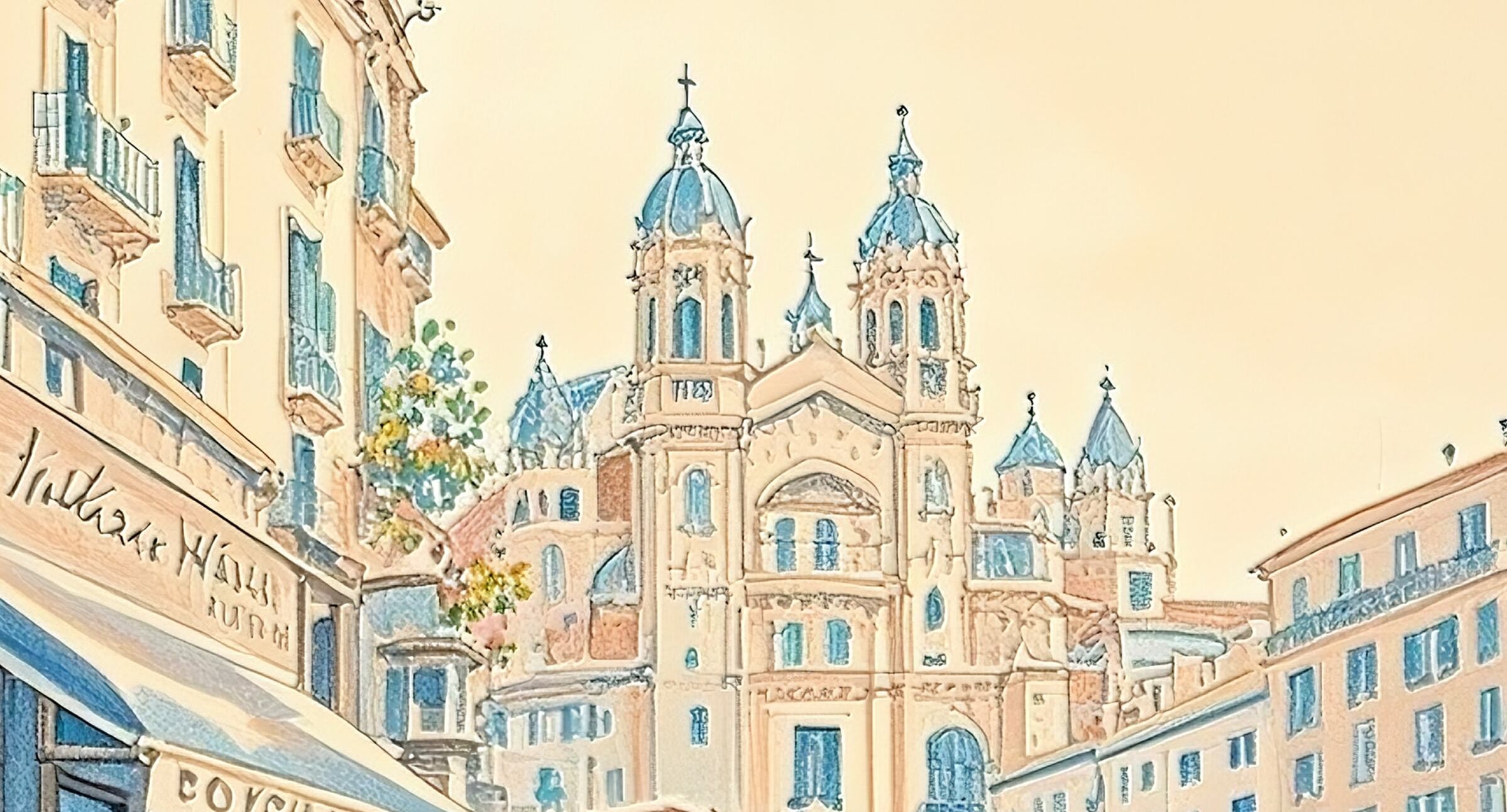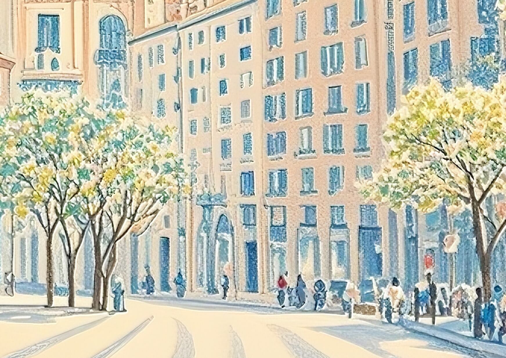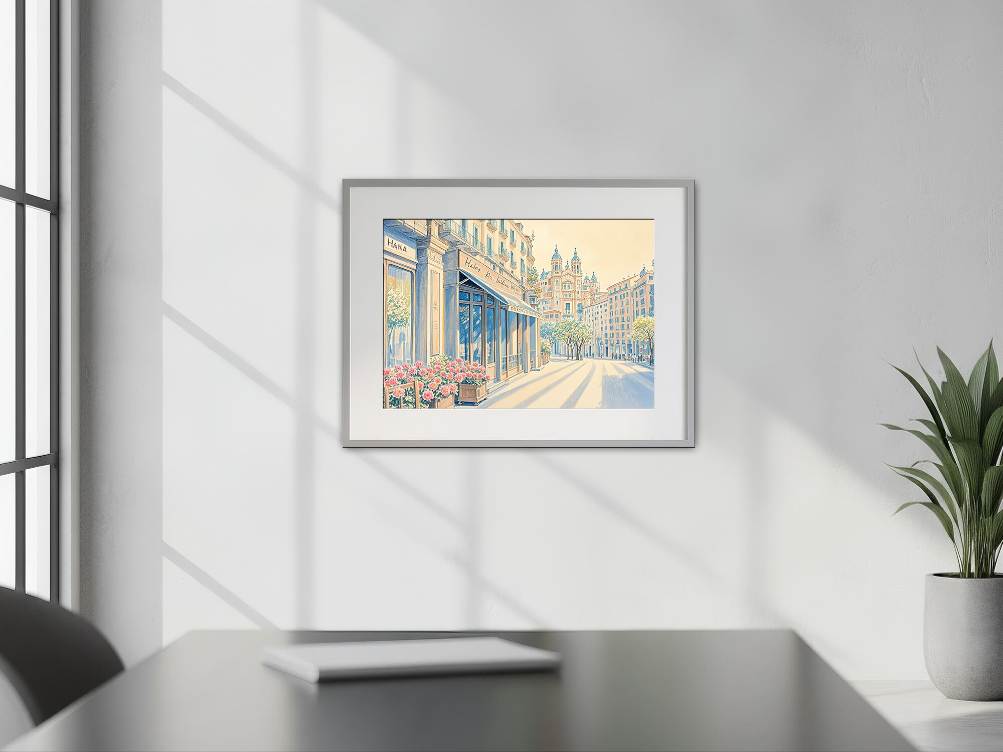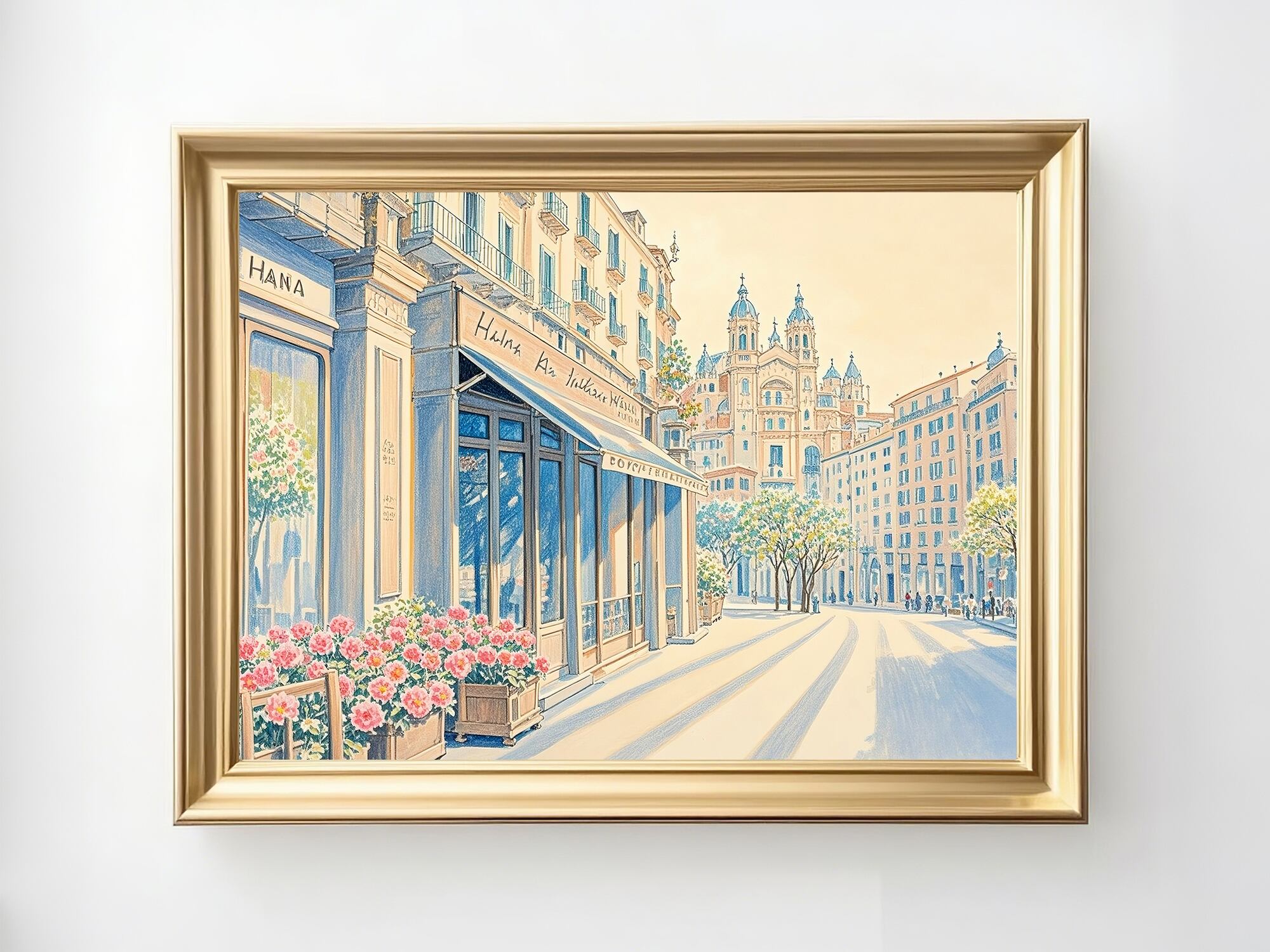 この作品は、ヨーロッパの穏やかな午後を描いた温かな街景アートです。柔らかい光に包まれたヨーロッパの街並みが描かれており、淡いパステルカラーが印象的です。建築の細部まで丁寧に描かれており、穏やかで幸福感のある雰囲気を演出しています。構図は奥行きが強く、街路の消失点に向かう遠近法が巧みに使われ、観る者を自然に画面の中へ引き込みます。優れた空気遠近法により、午後の柔らかい陽光が漂う情緒を感じさせ、静けさと活気が共存する都市の詩情を表現しています。