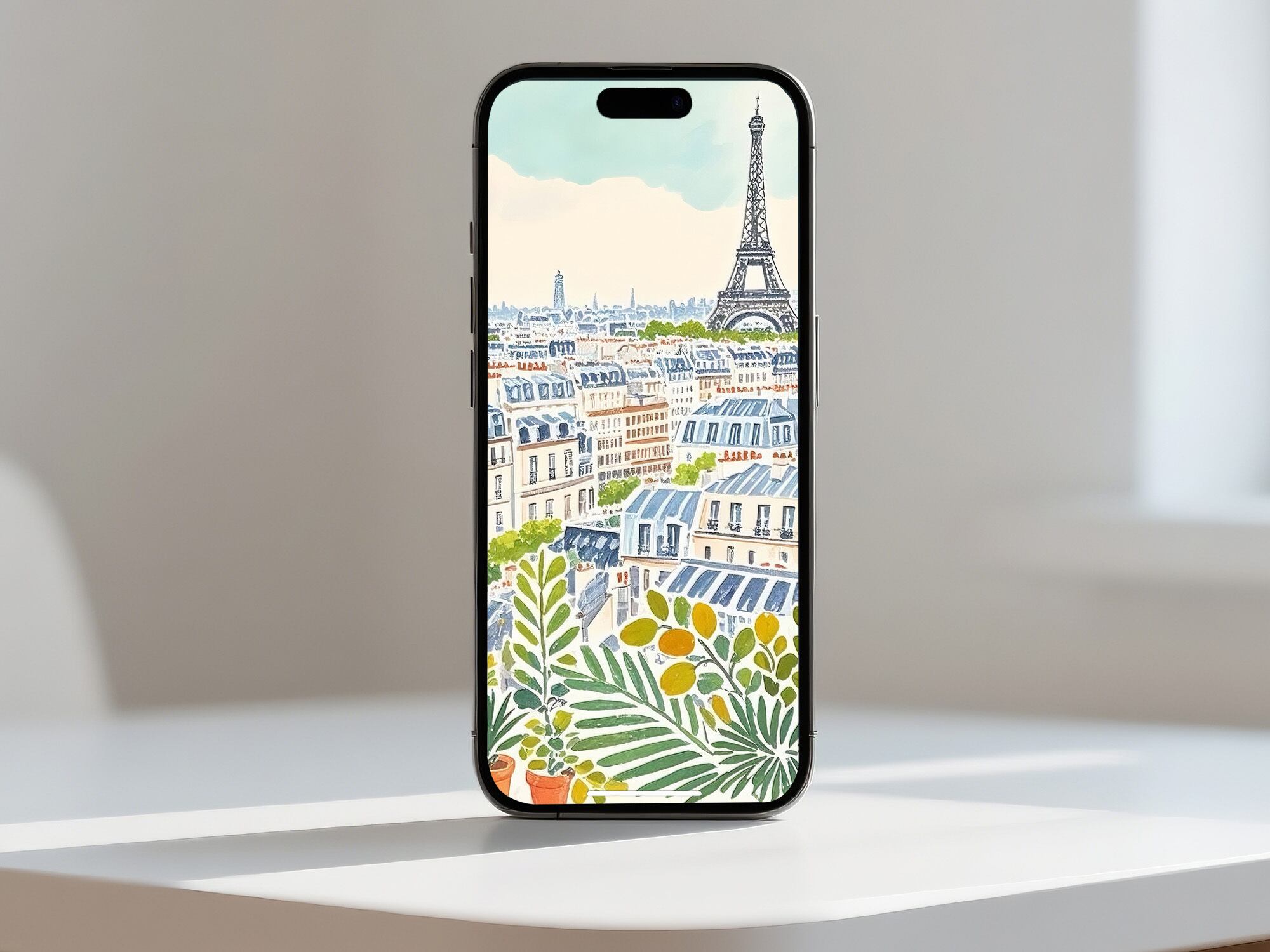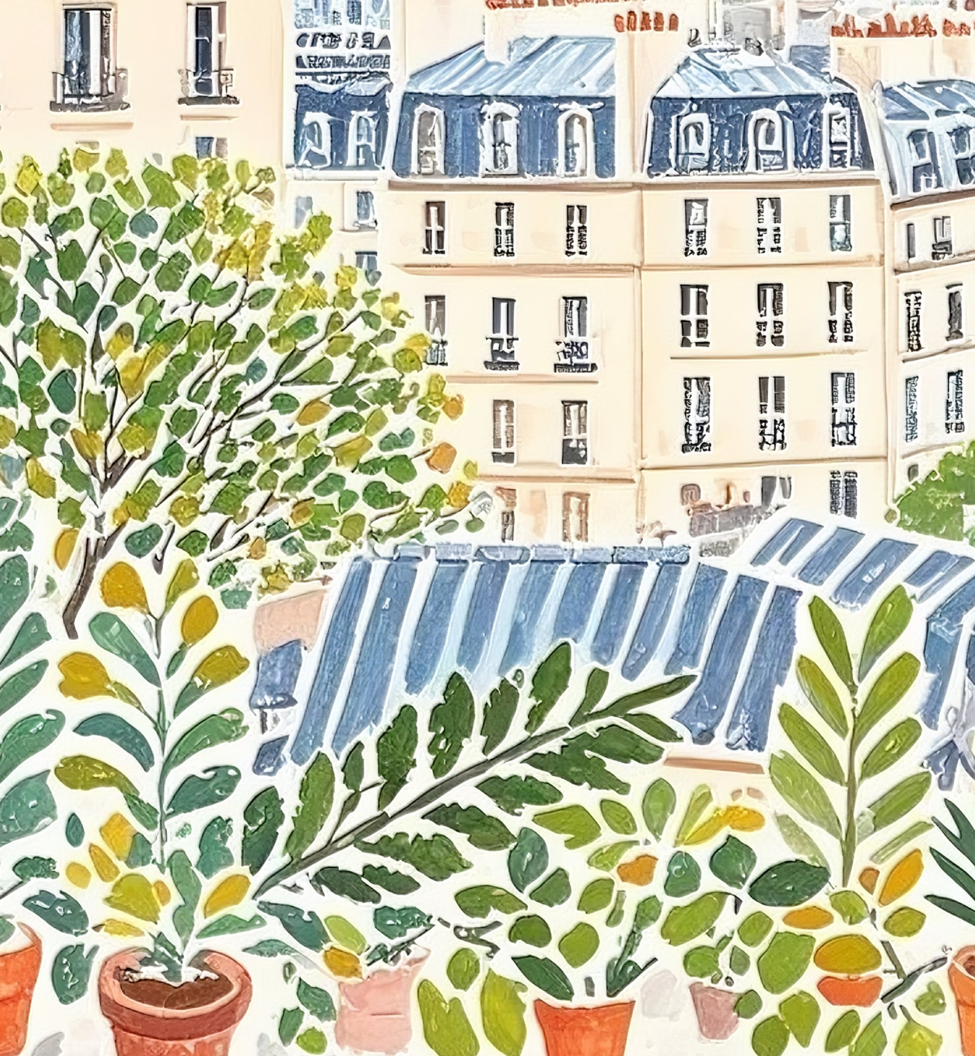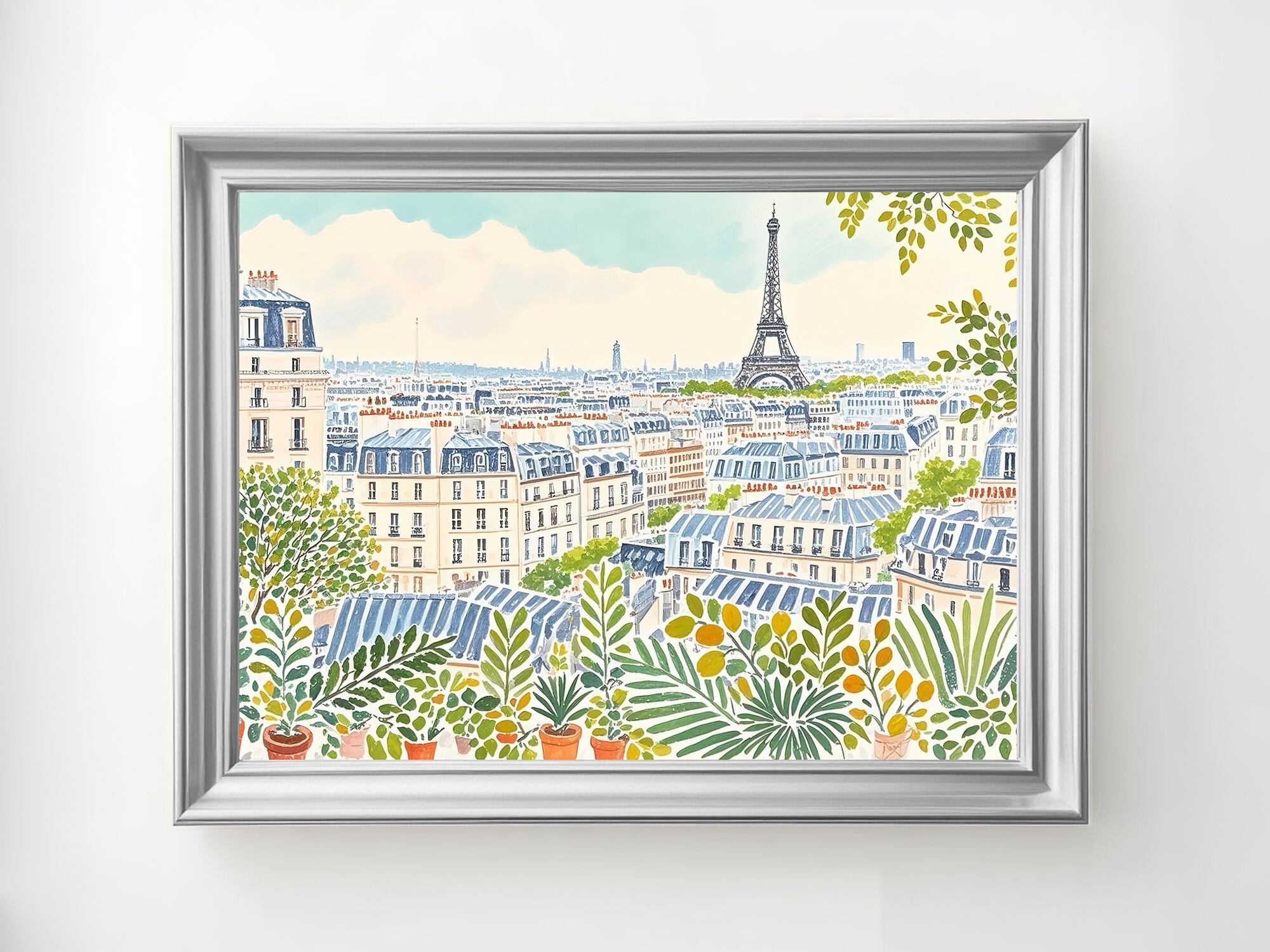 この作品は、パリの街並みを穏やかに見渡す情景を描き、バルコニーの植物がエッフェル塔を額縁のように包み込んでいます。パステル調のやわらかな色合いと、澄んだ昼の光が穏やかな空気をつくり、都市の喧騒の中にある静けさを感じさせます。幾何学的に並ぶ屋根のリズムと、自由に広がる草葉の形が絶妙に調和しており、構築性と生命感の両方を併せ持つ作品です。ベランダから吹く風に触れながら、日常の中にある幸福を見つめるような情感が漂い、観る人に安らぎを与えます。装飾的でありながら、生活の温度を感じさせるアートです。