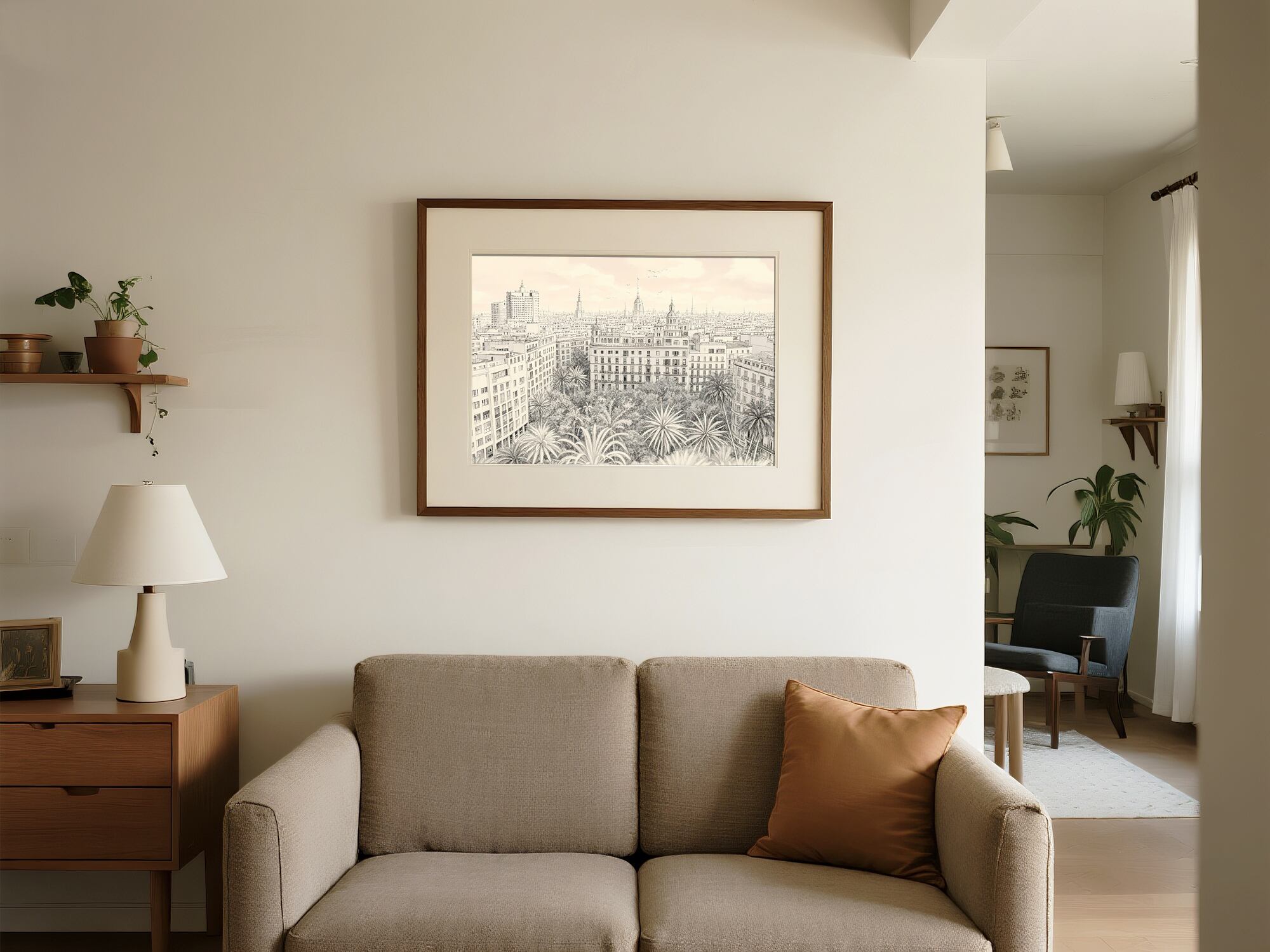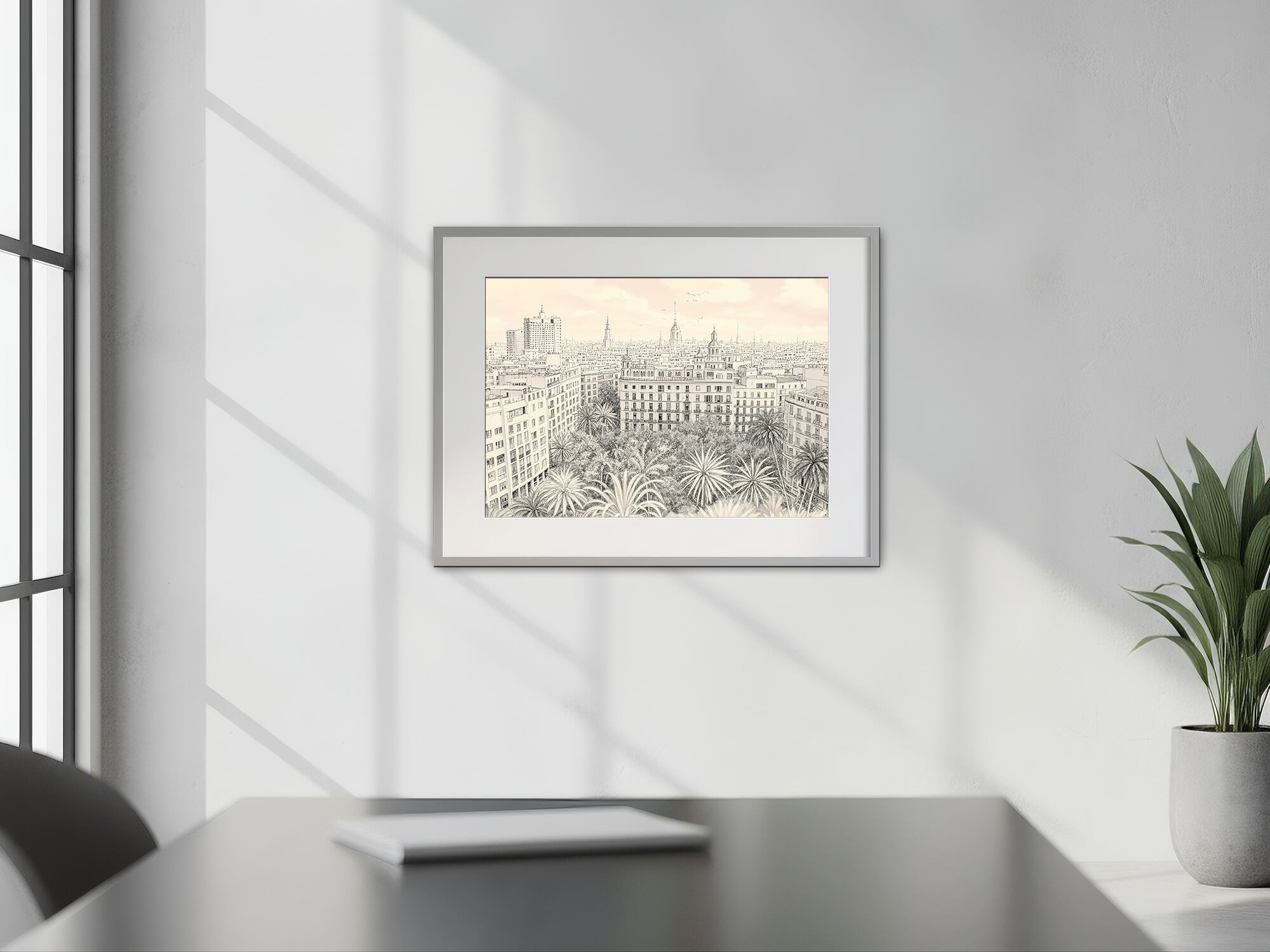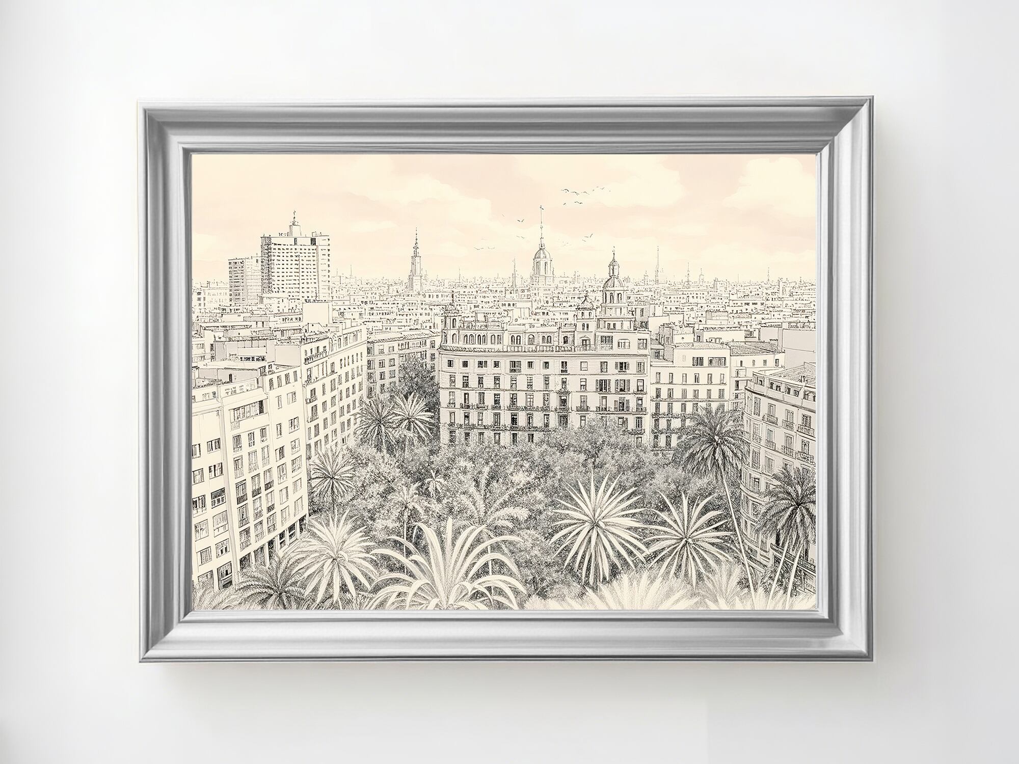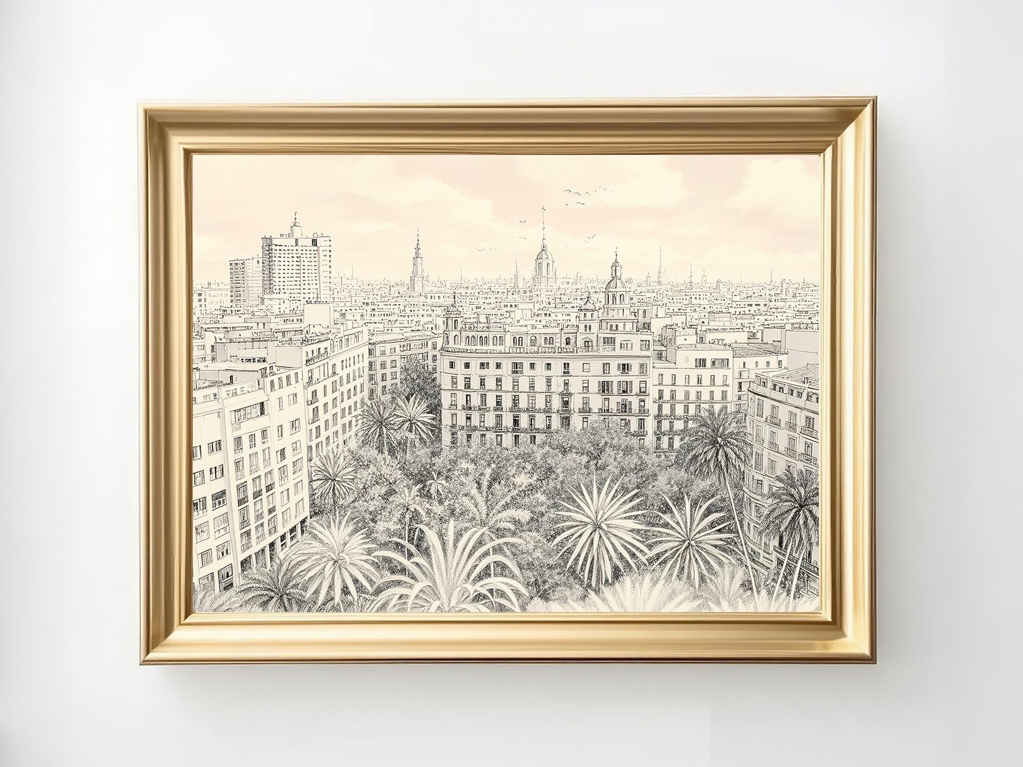この作品は、まるで古い銅版画が息を吹き返したかのような、緻密で静かな都市風景です。整然と並ぶ建物群の直線と、手前に広がるヤシの樹冠の柔らかいリズムが、人の営みと都市の壮大さを同時に語ります。色に頼らず、細やかな線と微妙な濃淡の変化によって空気と時間の流れを描き出しており、静寂の中に確かな生命感が漂います。記録的でありながら詩的で、今この瞬間だけでなく永続する都市の姿を、観察と忍耐の筆致で丁寧に表現した作品です。