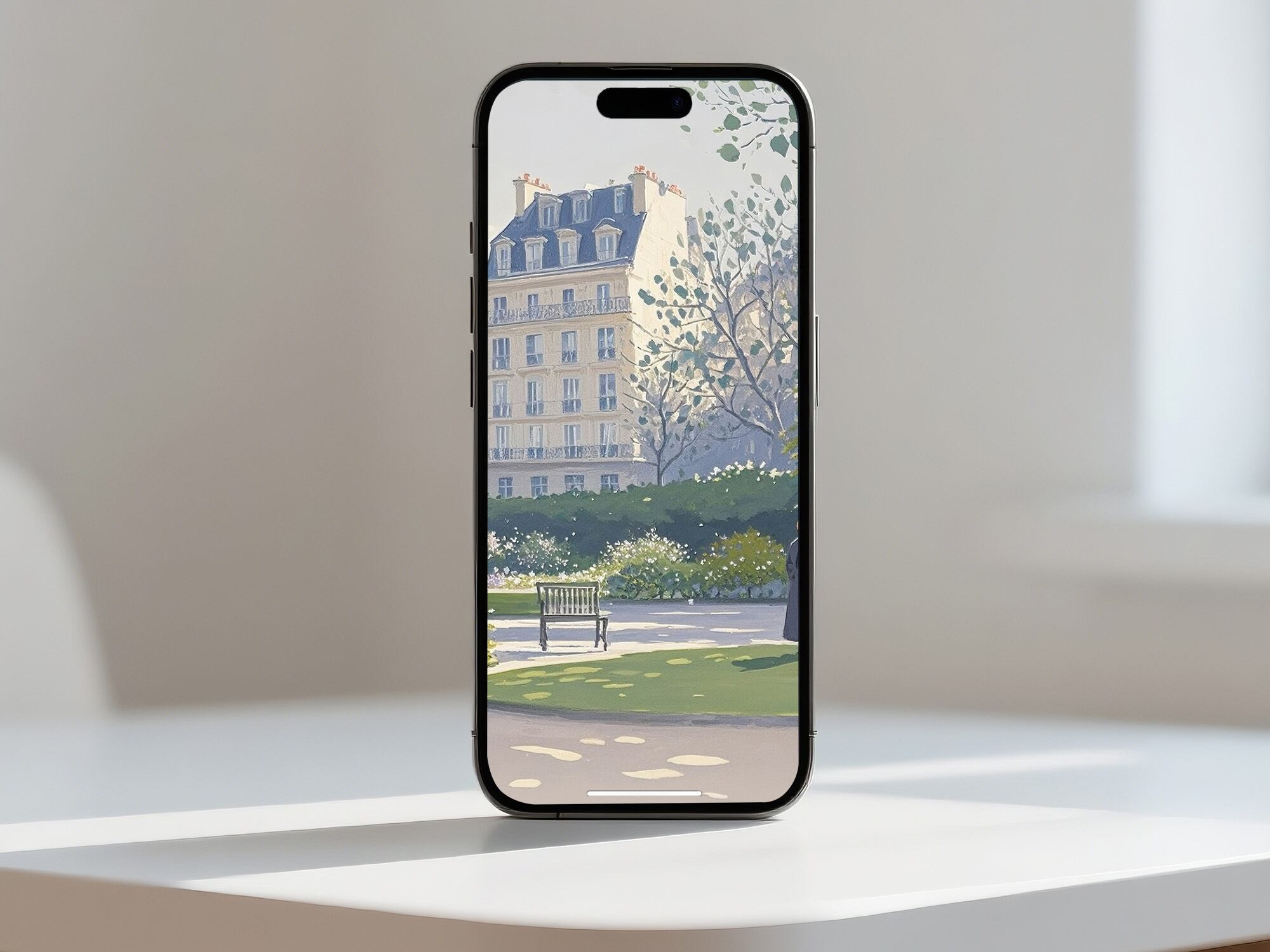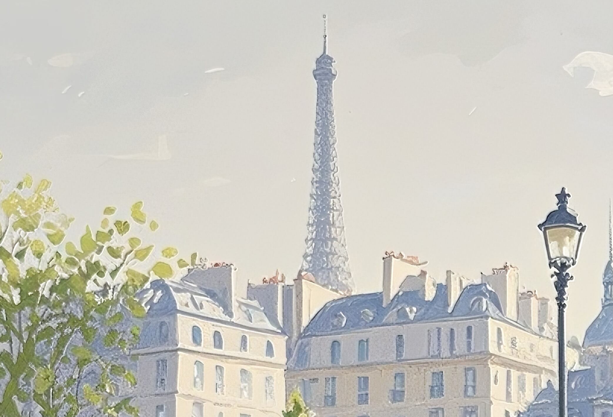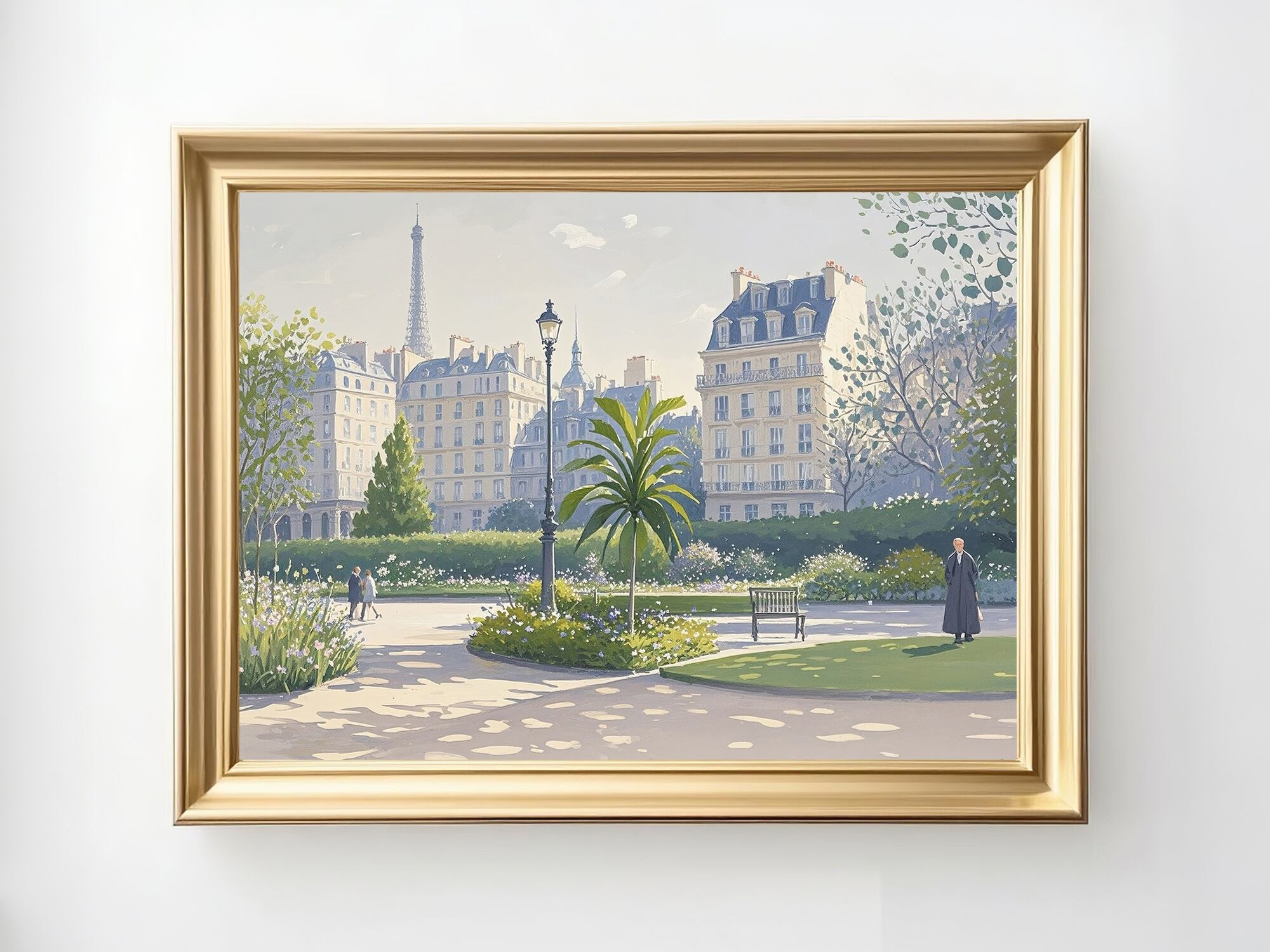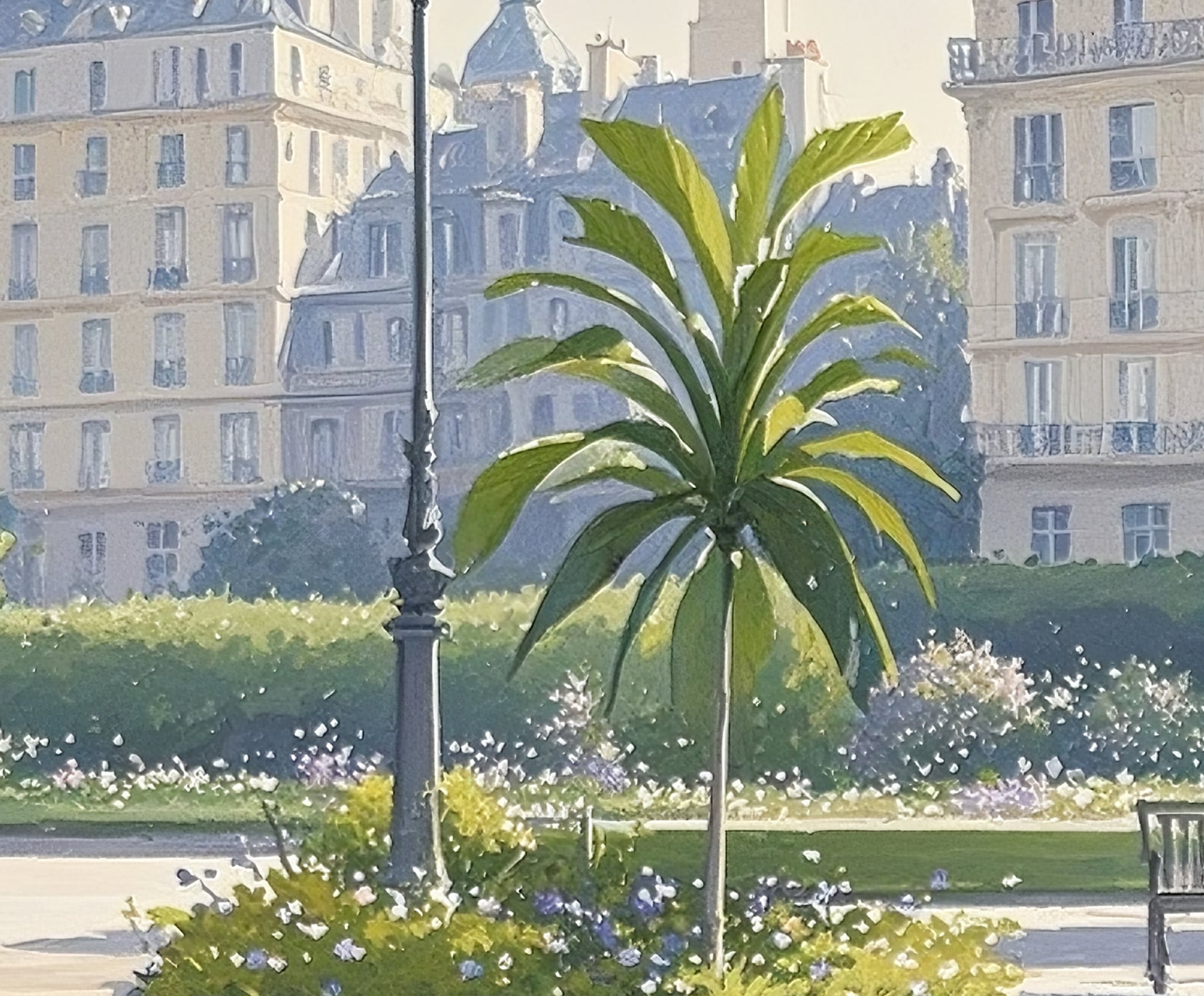 都心の公園を描いたこの作品は、木漏れ日が芝生と小道を優しく照らし、その先にエッフェル塔を望む静謐な情景を描き出しています。彩度を抑えた落ち着いた色合いと、柔らかな空気の描写が深い静けさを生み、鑑賞者の呼吸を自然と穏やかにします。道を歩く人々の小さな姿や整然とした建物の並びが、都会の中の安らぎと時間の流れを感じさせます。派手さを抑えたその静かな表現が、むしろ詩的な強さを放ち、穏やかな美しさを永続させる印象的な作品となっています。