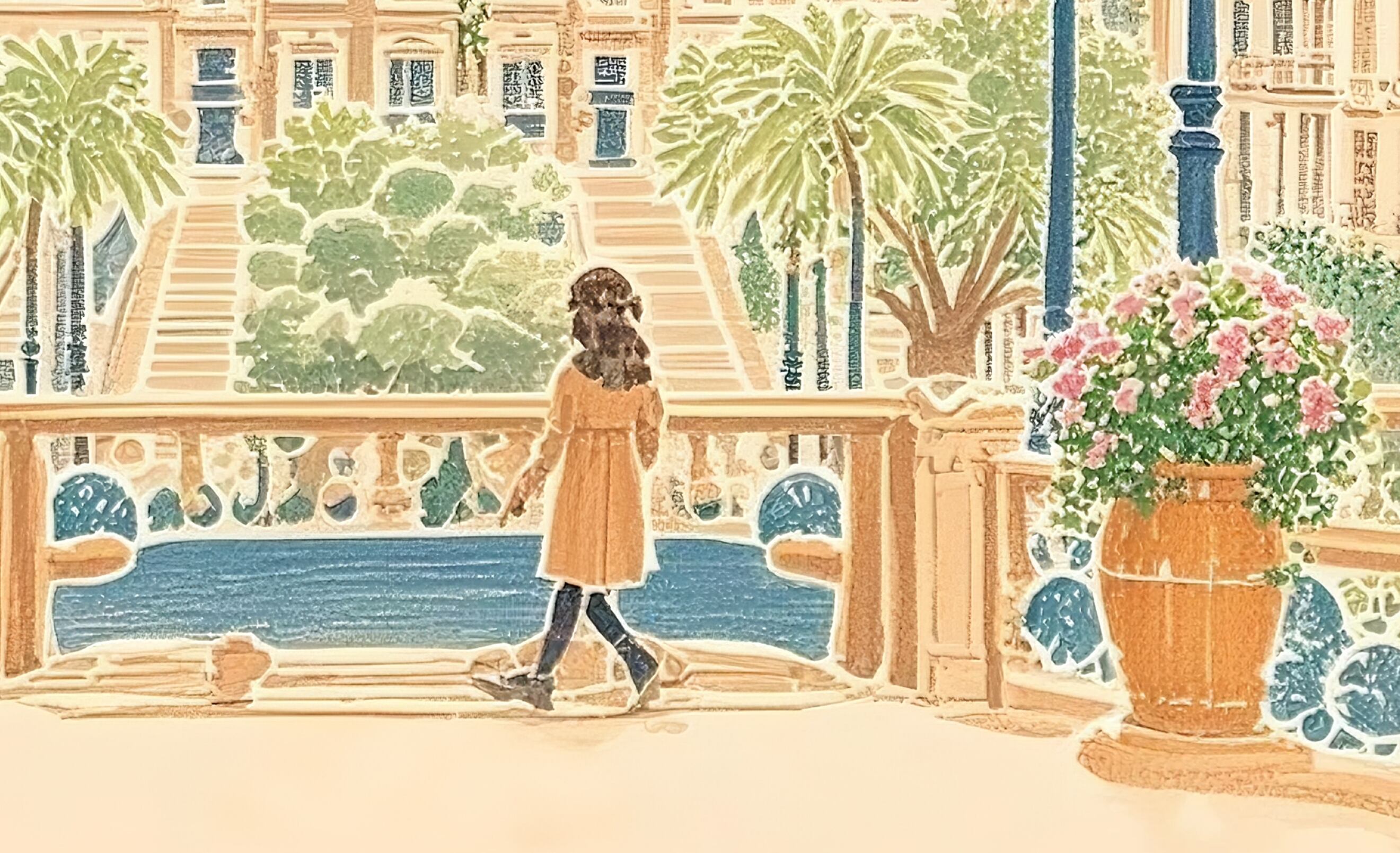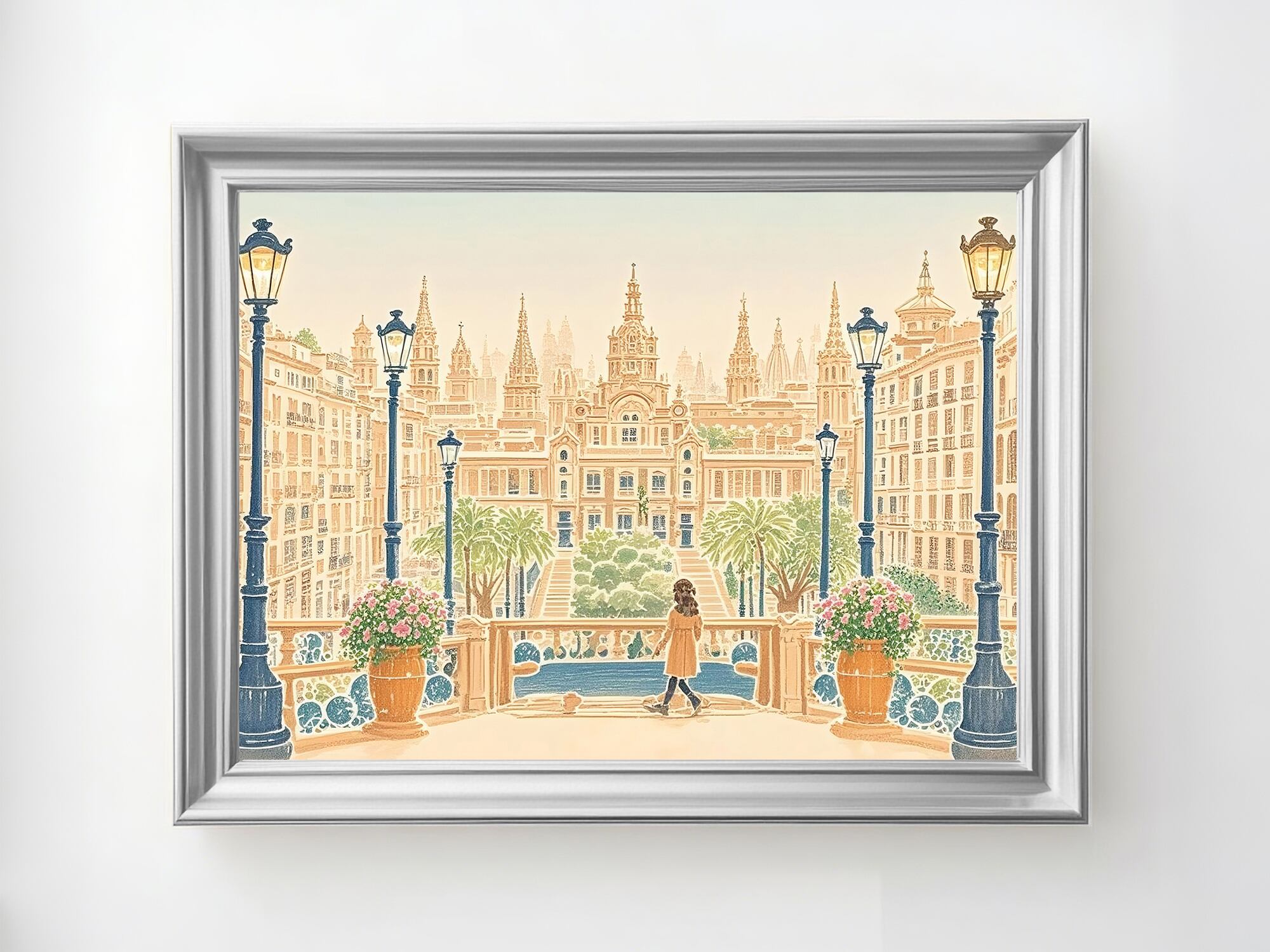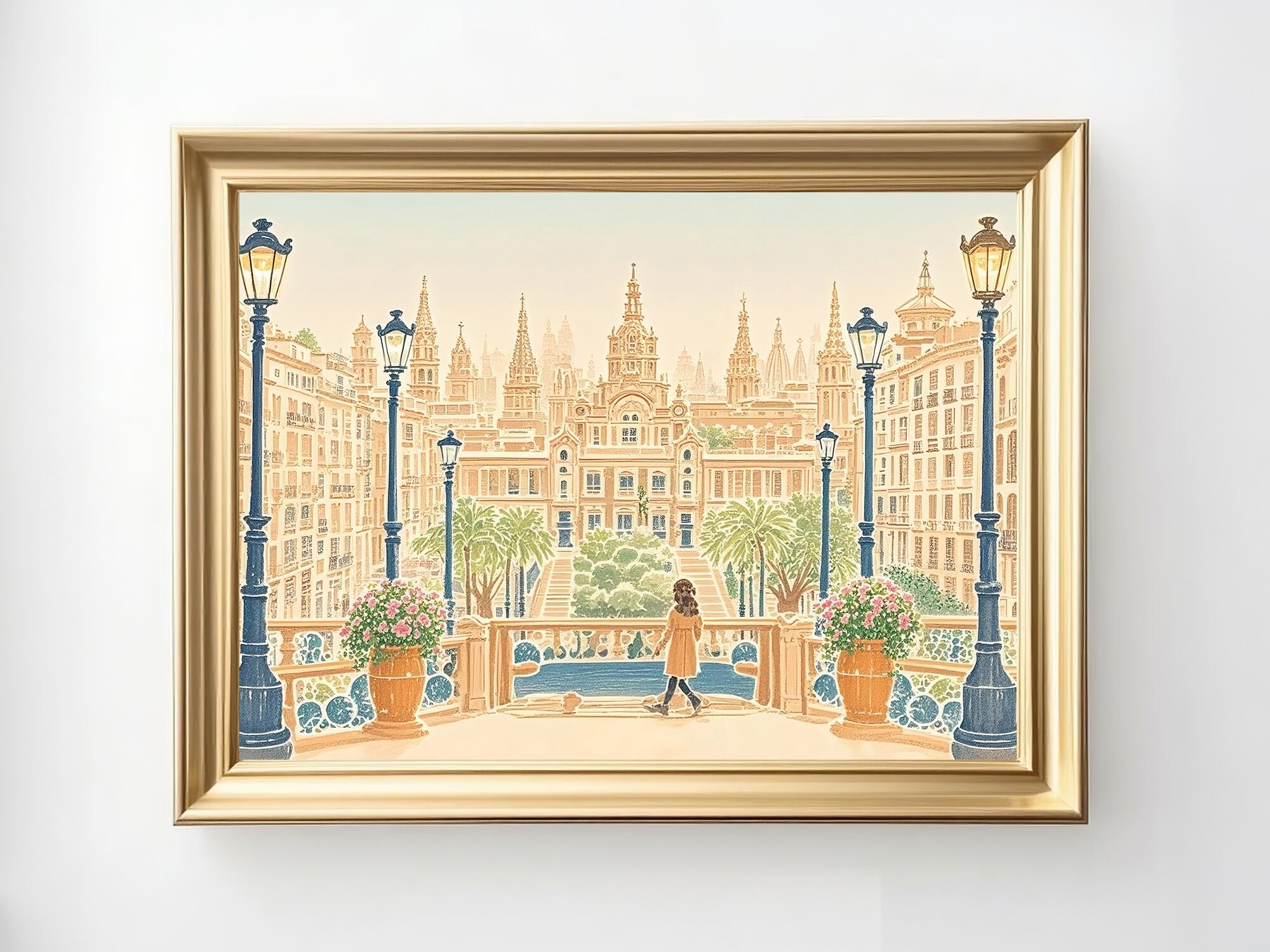 この作品は、壮麗なヨーロッパの広場へと足を踏み入れる瞬間のように、光と左右対称の構図、そして建築の荘厳さがひとつに溶け合った優雅な光景です。温かな砂岩色に包まれた街並みは穏やかな日差しを受けて輝き、中央に立つ人物が空間にスケールと静かな感情を与えています。街灯や手すりのリズムが視線を自然に導き、壮大な建築の前で心を落ち着けるような感覚を呼び起こします。圧倒的でありながら親しみもあり、「人がつくる美」の永続する力を穏やかに讃える一枚です。