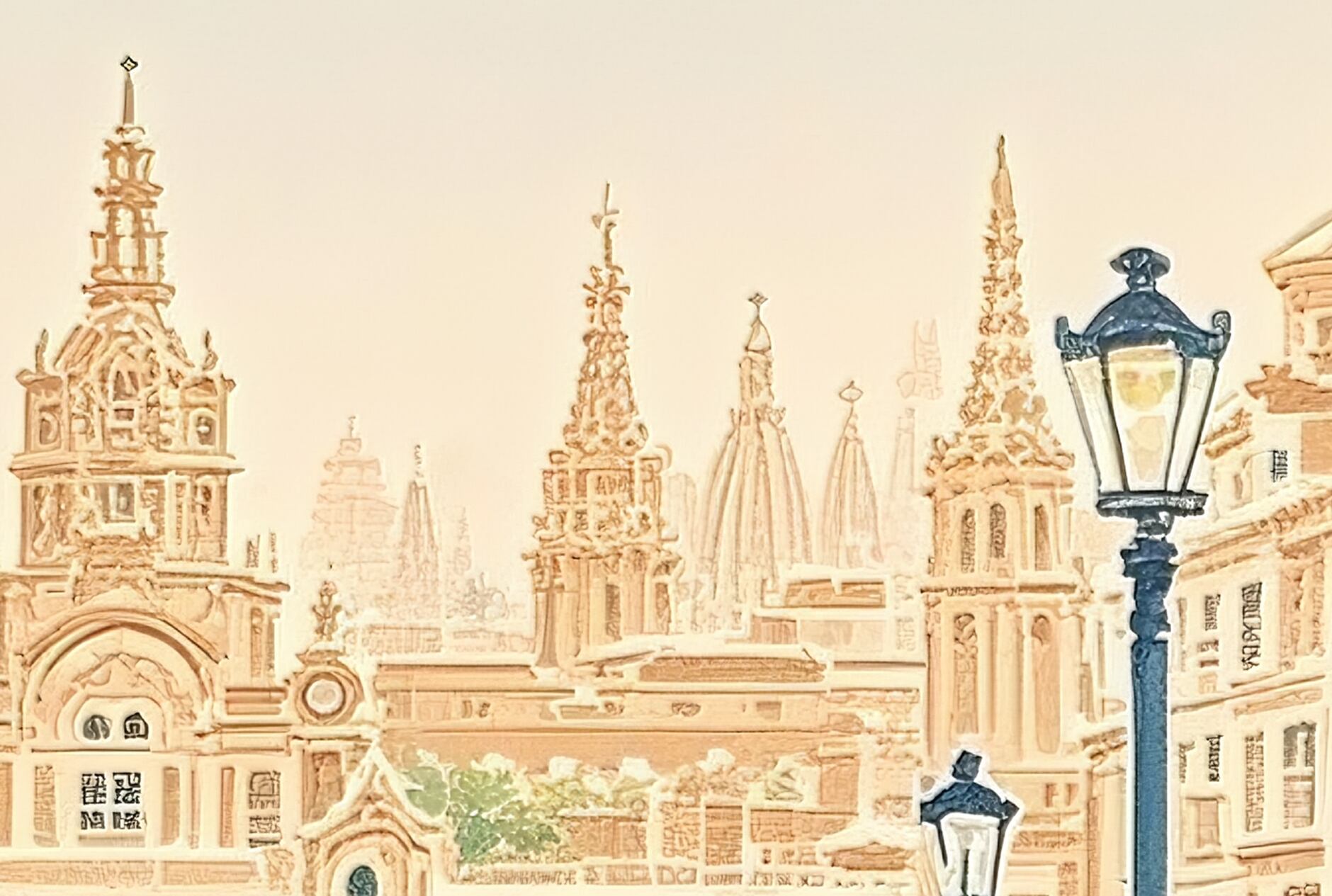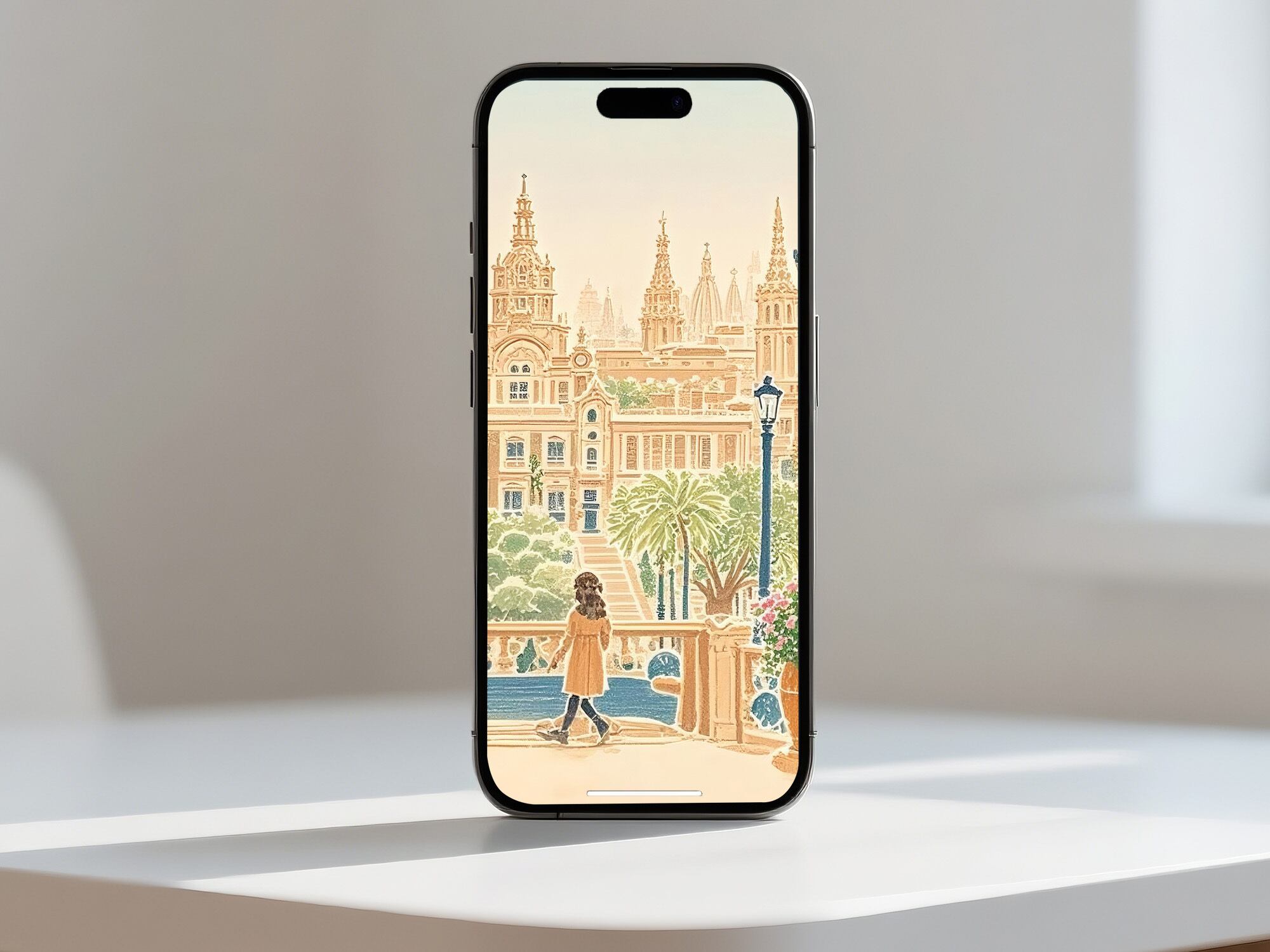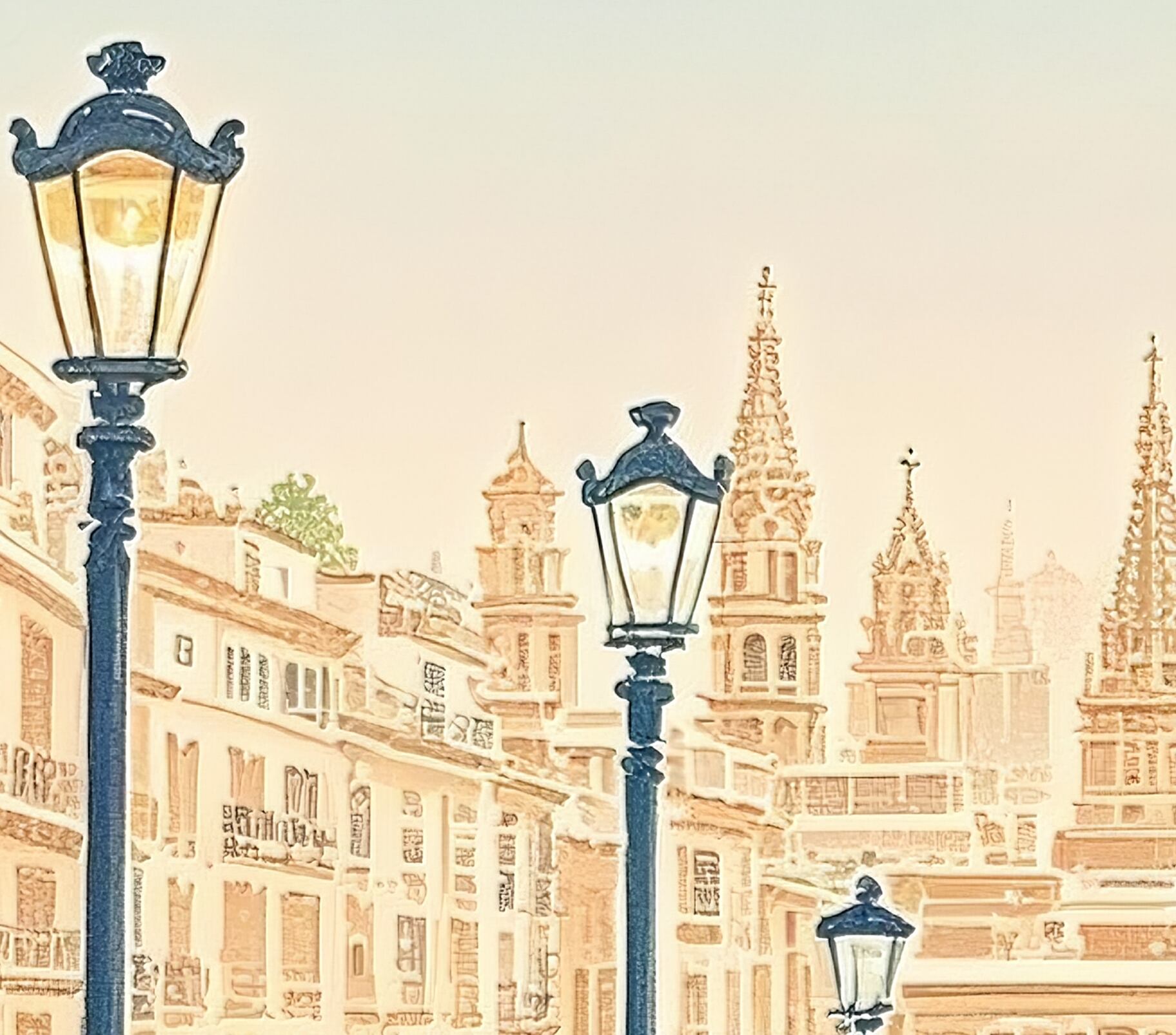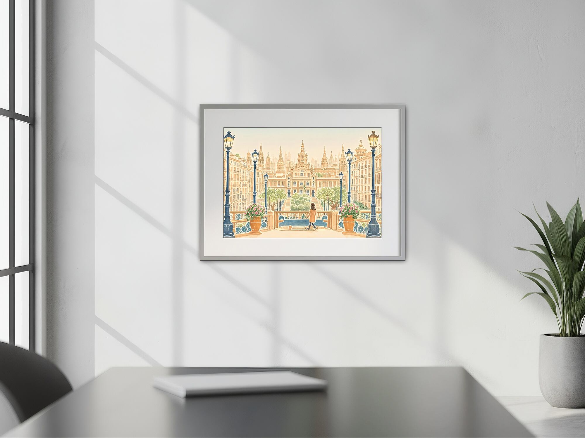 この作品は、壮麗なヨーロッパの広場へと足を踏み入れる瞬間のように、光と左右対称の構図、そして建築の荘厳さがひとつに溶け合った優雅な光景です。温かな砂岩色に包まれた街並みは穏やかな日差しを受けて輝き、中央に立つ人物が空間にスケールと静かな感情を与えています。街灯や手すりのリズムが視線を自然に導き、壮大な建築の前で心を落ち着けるような感覚を呼び起こします。圧倒的でありながら親しみもあり、「人がつくる美」の永続する力を穏やかに讃える一枚です。