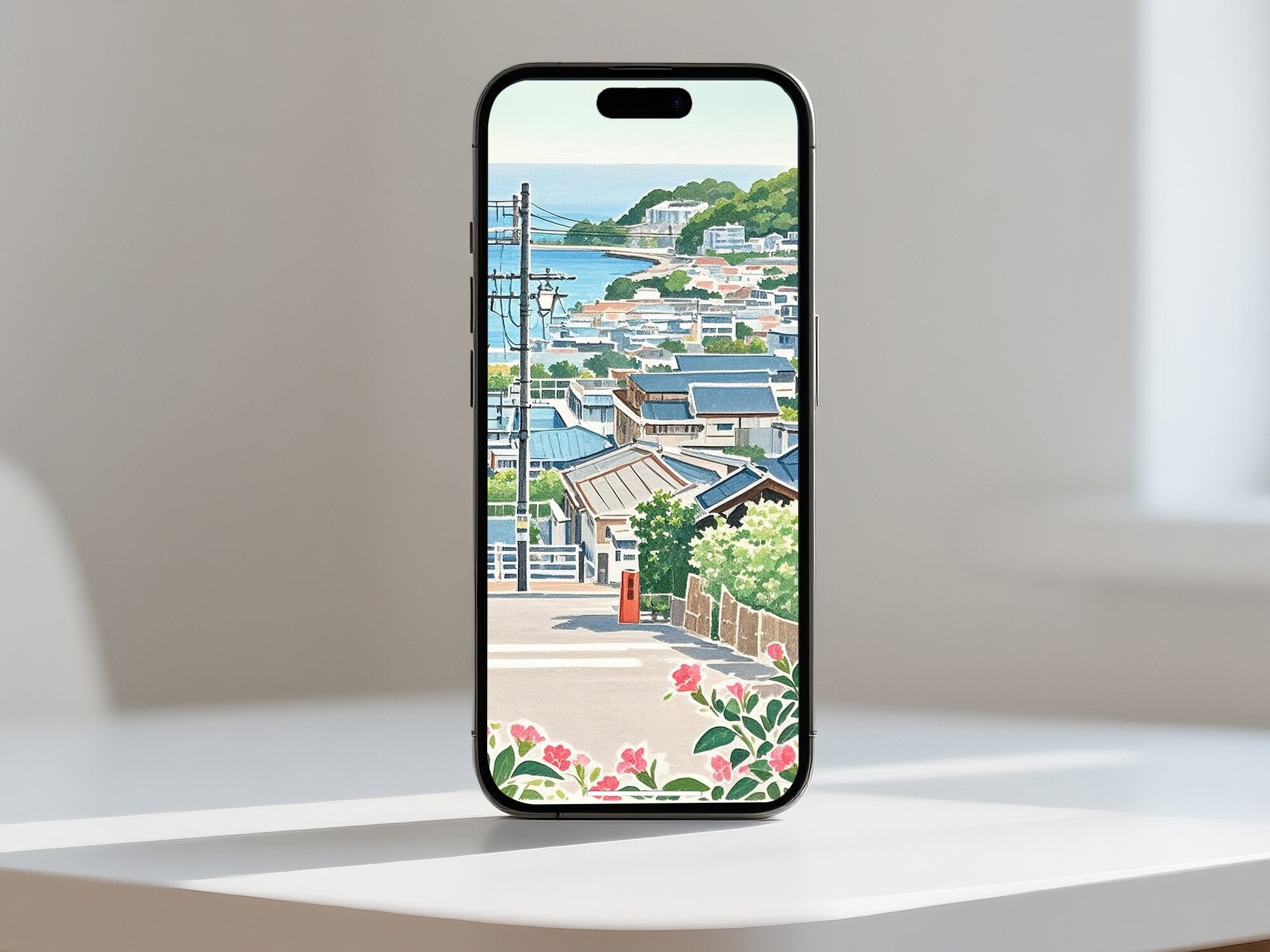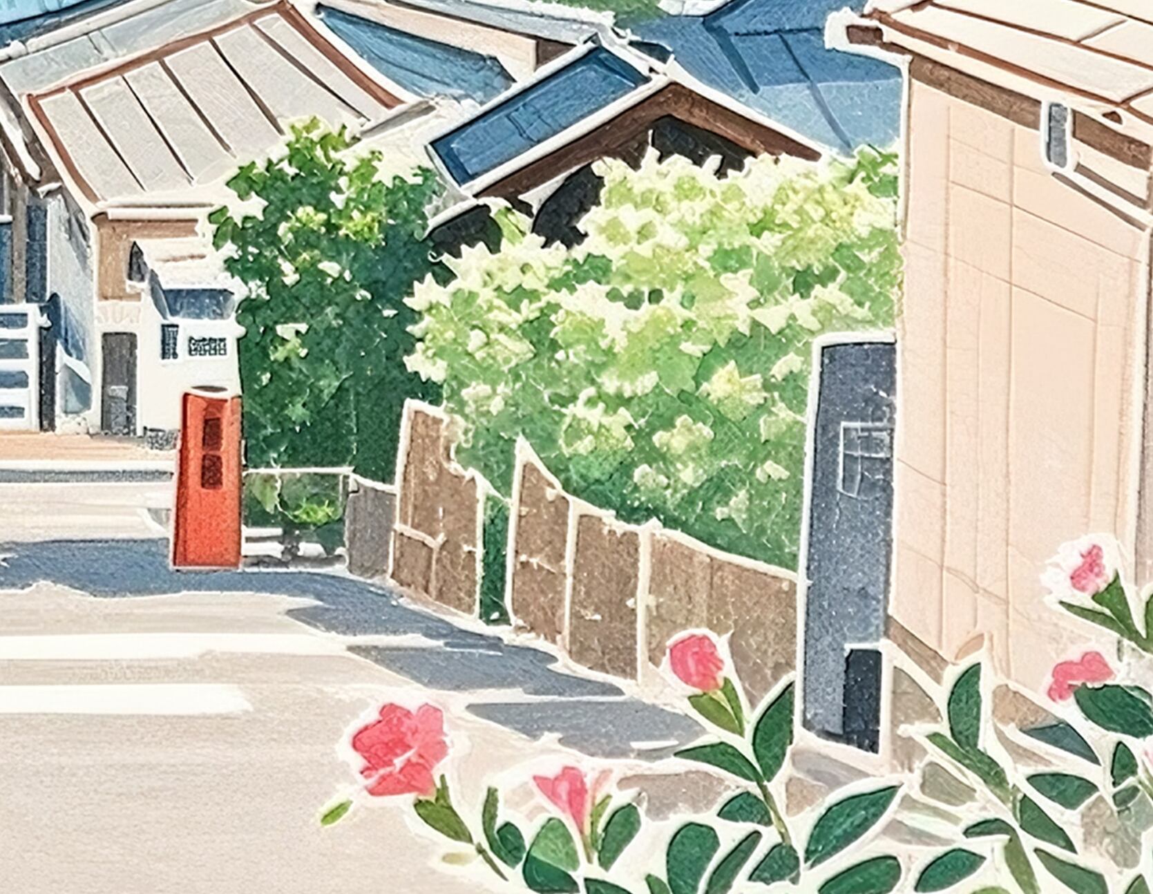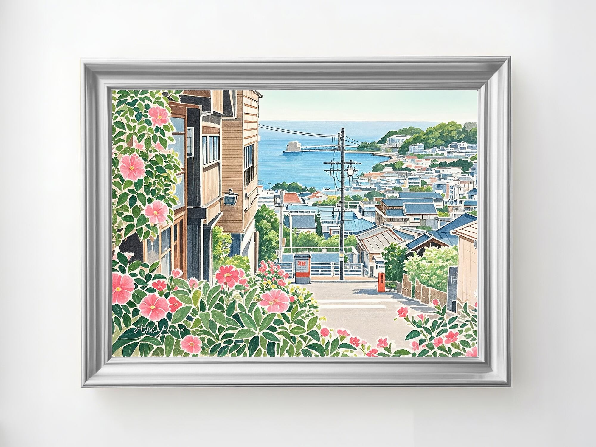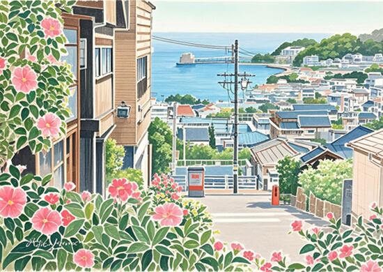 花咲く坂道の向こうに広がる海。港町の空気と潮風を感じる、爽やかな一枚です。建物のテクスチャや電柱・電線の描写により生活感が出ており、リゾートタウンの爽やかさと日常性が共存しており、鮮やかな花々と青い海のコントラストが、見る人の心を晴れやかにしてくれます。旅情と日常が交差するような構図が印象的です。