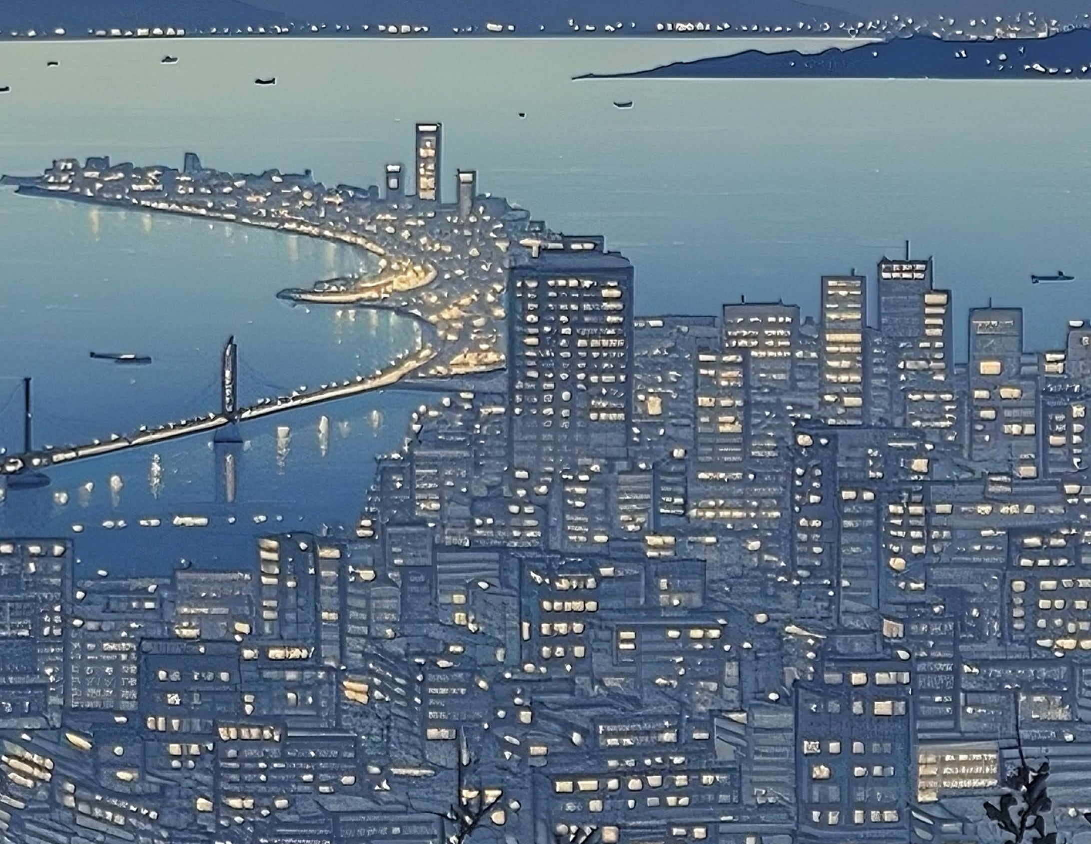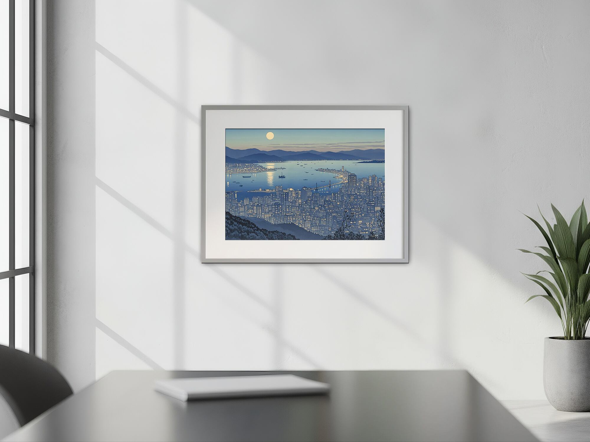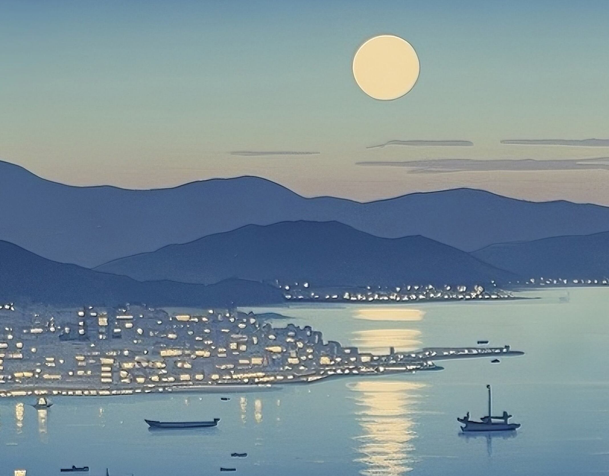 高台から見下ろす港町の夜景が、青い月光に照らされて静かに輝いています。海面に映る光とビル群の窓明かりが織りなす光のパターンは、都市の息づかいと静寂の調和を感じさせます。遠くの山並みと湾岸線が繊細なグラデーションで描かれ、全体に透明感のある冷ややかな美しさを放ちます。都会の夜を幻想的に切り取った一枚は、モダンインテリアや夜景をテーマにした空間演出にも最適なデジタルアートです。